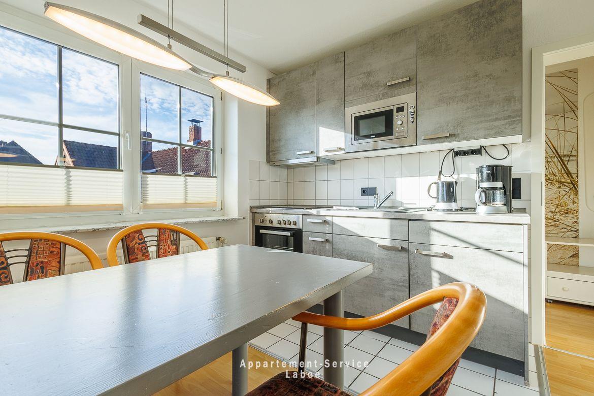 FeWo Bellevue W06: 2-Zimmer-Wohnung, ca. 40?m², für 2–4 Personen. 1. Stock mit Balkon zur Seitenstraße. Wohnzimmer mit Schlafcouch, TV, WLAN, Essbereich und offener Küche (Ceranfeld, Backofen, Kühlschrank mit Gefrierfach, Kaffeemaschine). Schlafzimmer mit Doppelbett. Duschbad. Tiefgaragenstellplatz (Duplex: max. 5,00?m?L × 2,00?m?B × 1,50?m?H). Waschmaschine und Trockner im Haus. Strand, Promenade und Einkauf fußläufig. Strandkorb inklusive. Haustiere erlaubt.