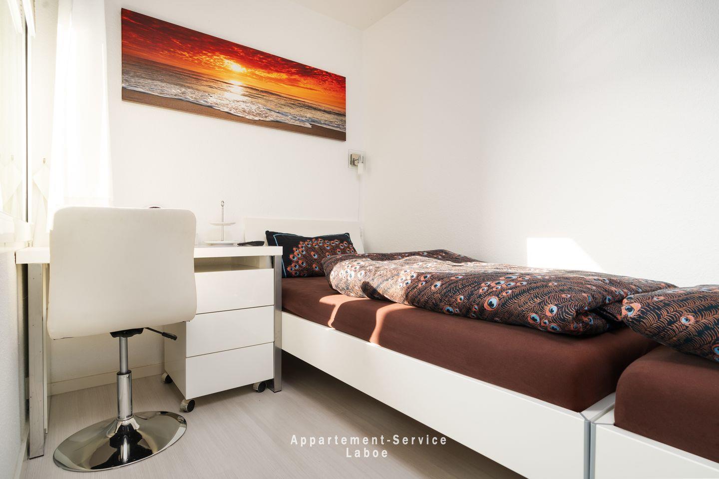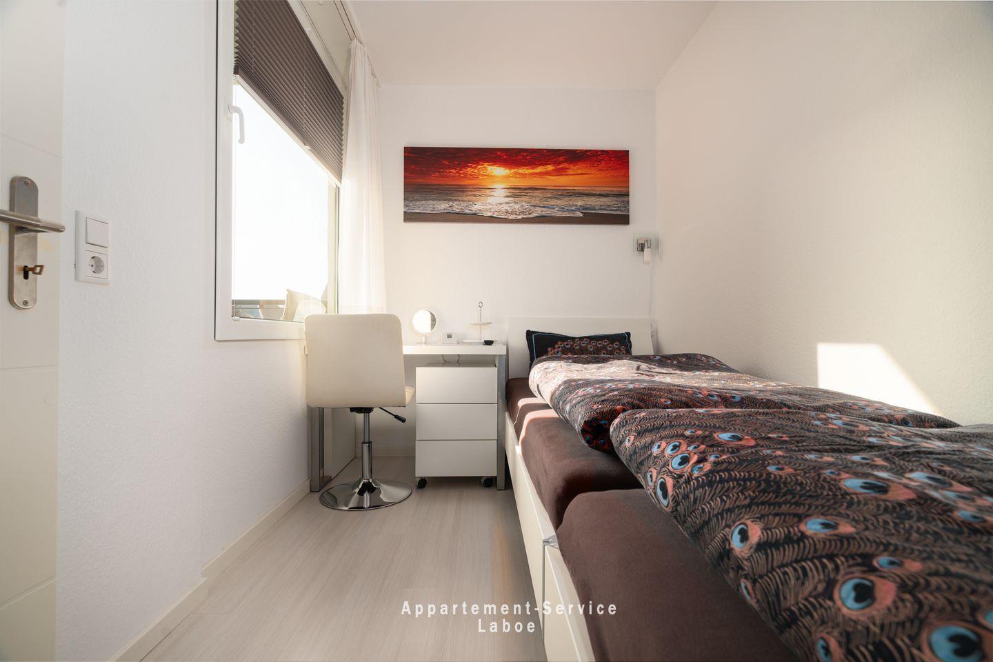 Mach es dir im Wohnbereich auf der bequemen Sitzgruppe gemütlich, die sich abends ruckzuck in ein bequemes Bett verwandelt. Der Essplatz im Wohnbereich und die kleine Küche laden dazu ein, gemeinsam ein Frühstück zuzubereiten oder nach einem Tag am Strand ein einfaches Abendessen zu genießen. Für alle, die ein bisschen Ruhe schätzen, bietet das separate Schlafzimmer mit zwei Einzelbetten eine kleine Wohlfühloase zum Abschalten.