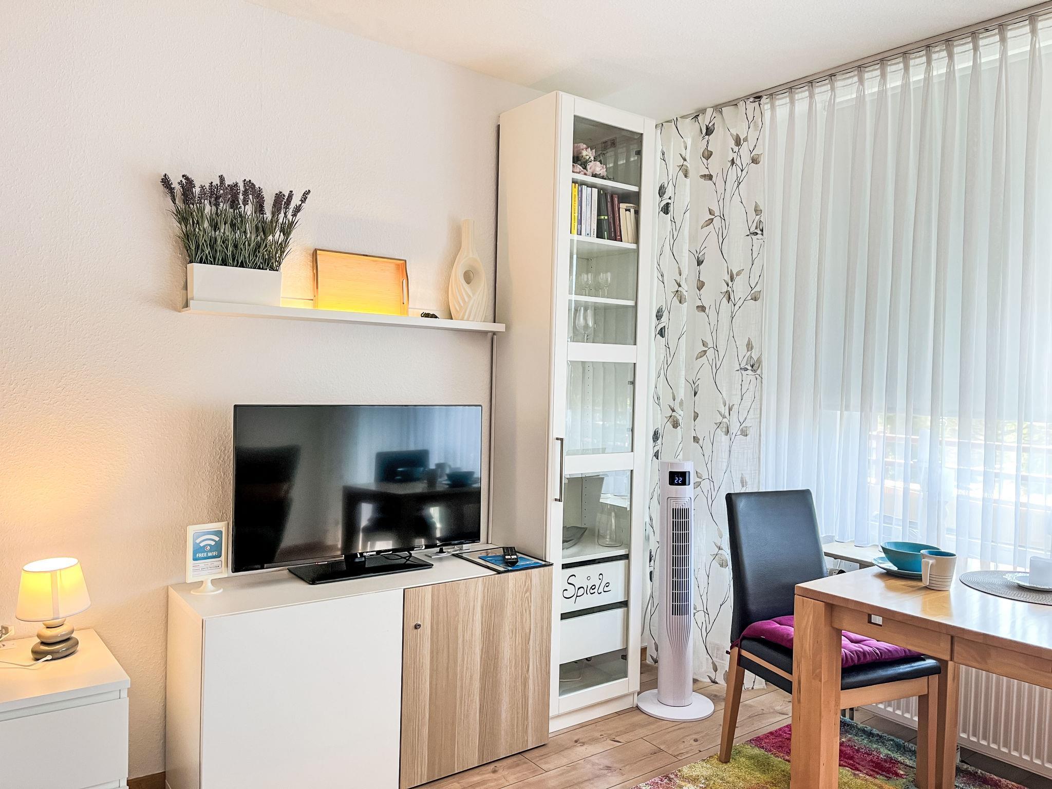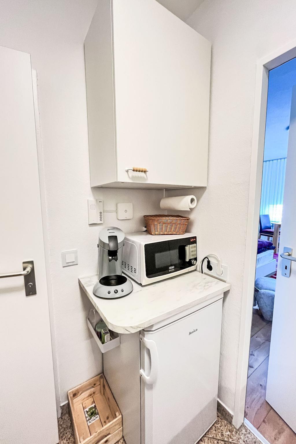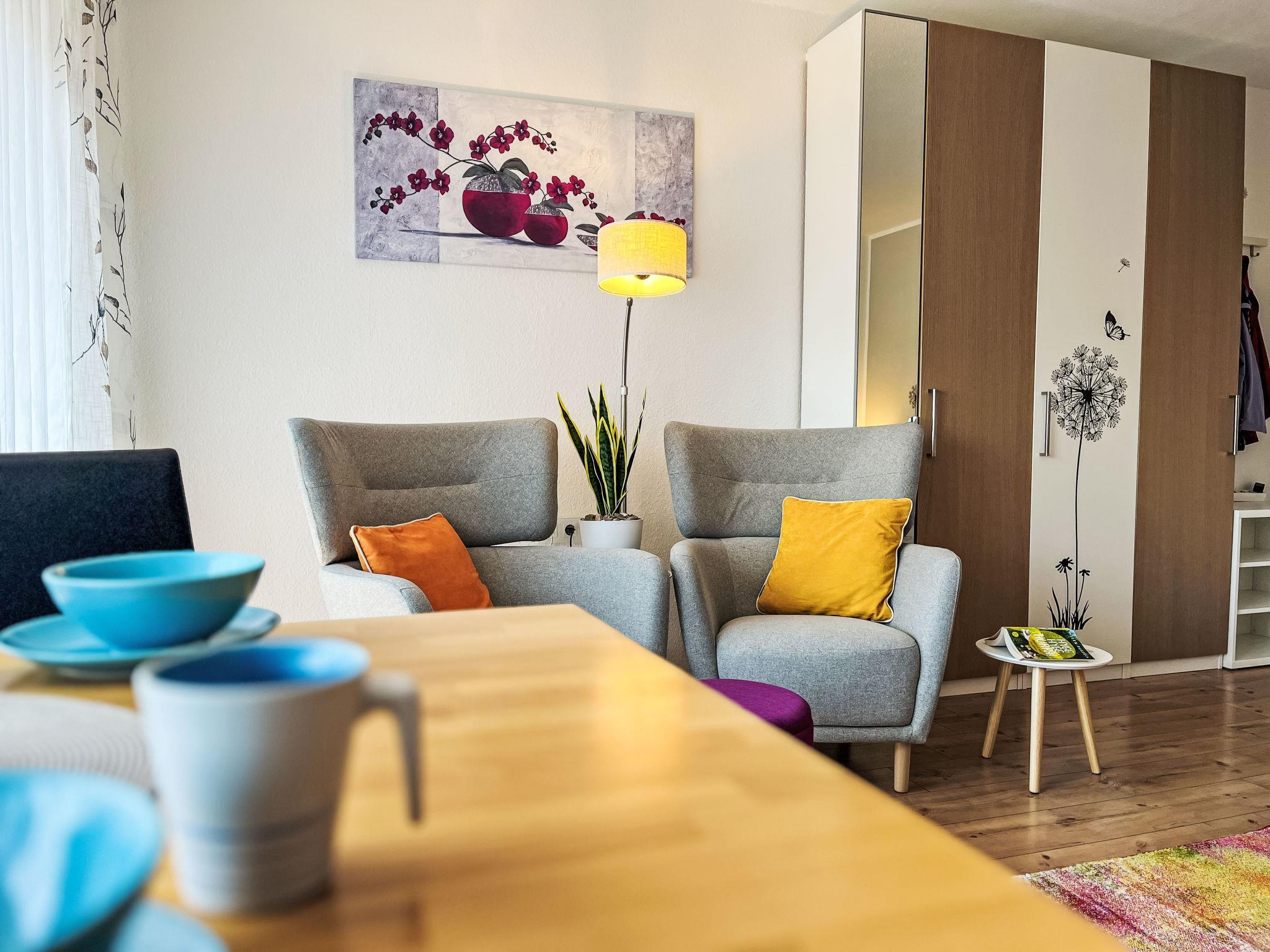 "Flieder (A110)", 1-room apartment 33 m2 on 1st floor. Beautiful and cosy furnishings: living/sleeping room with 1 french bed (160 cm, length 200 cm), satellite TV (flat screen). Exit to the balcony. Kitchenette in the entrance (dishwasher, 2 ceramic glass hob hotplates, toaster, kettle, microwave). Shower/WC. Balcony furniture. Facilities: iron. Internet (WiFi, free). Please note: non-smokers only. Maximum 1 pet/ dog allowed. Smoke alarm. There is a Senseo coffee pad machine.