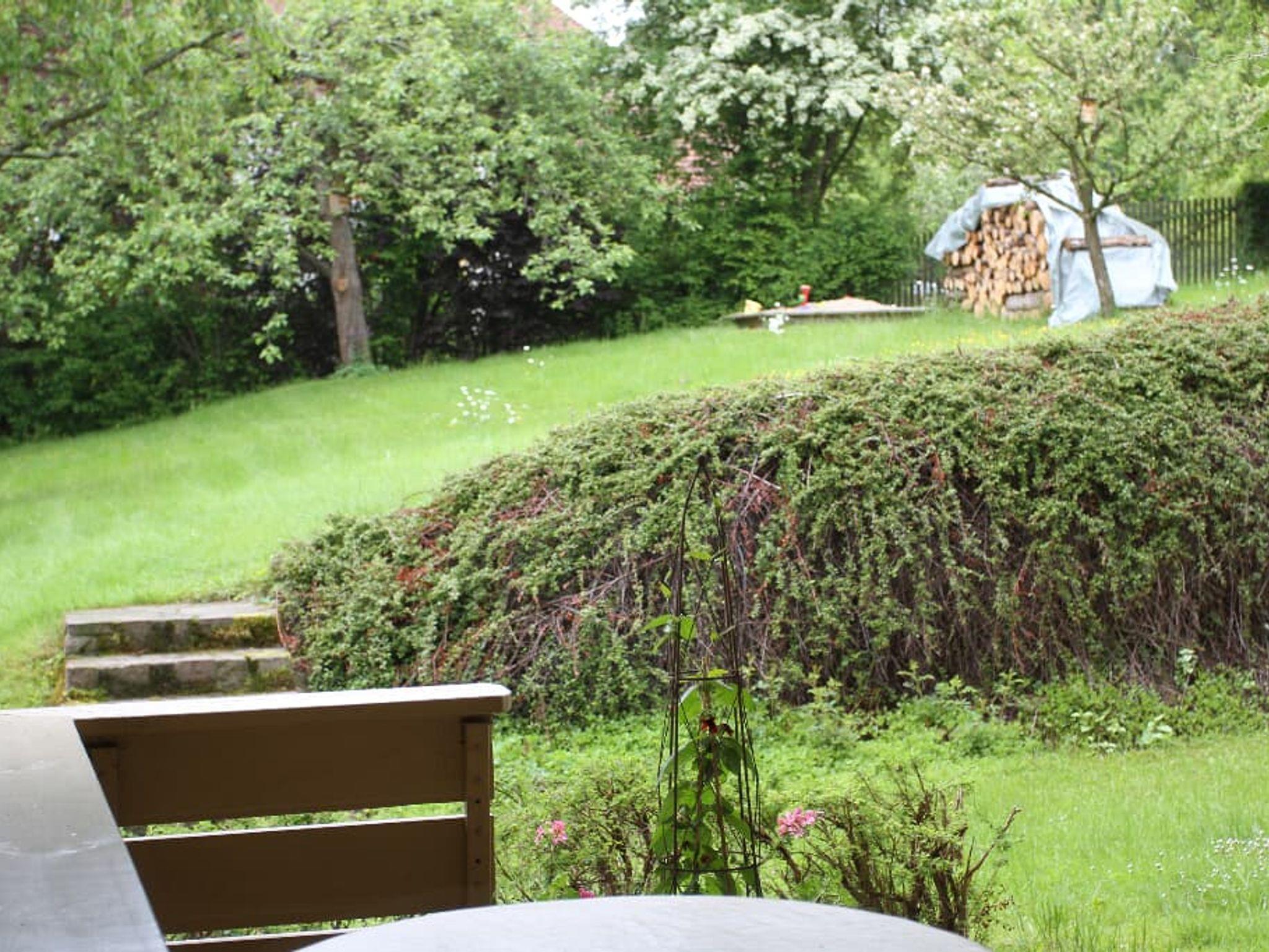 1-Zimmerappartement mit Küchenzeile, Essbereich mit Balkon und Blick in den Garten.