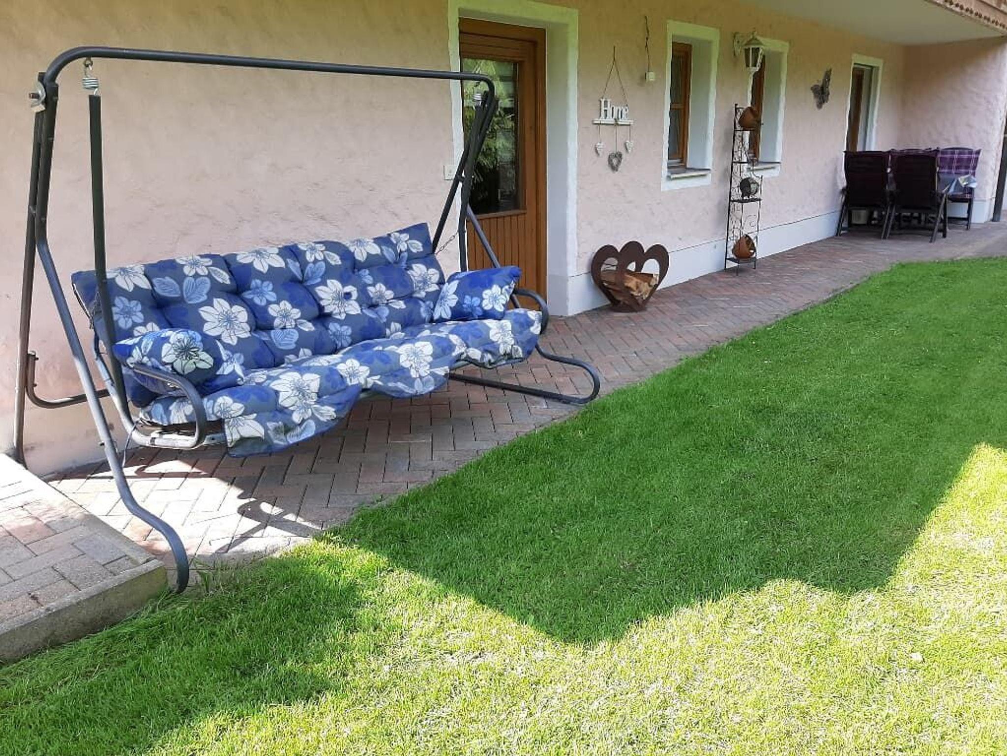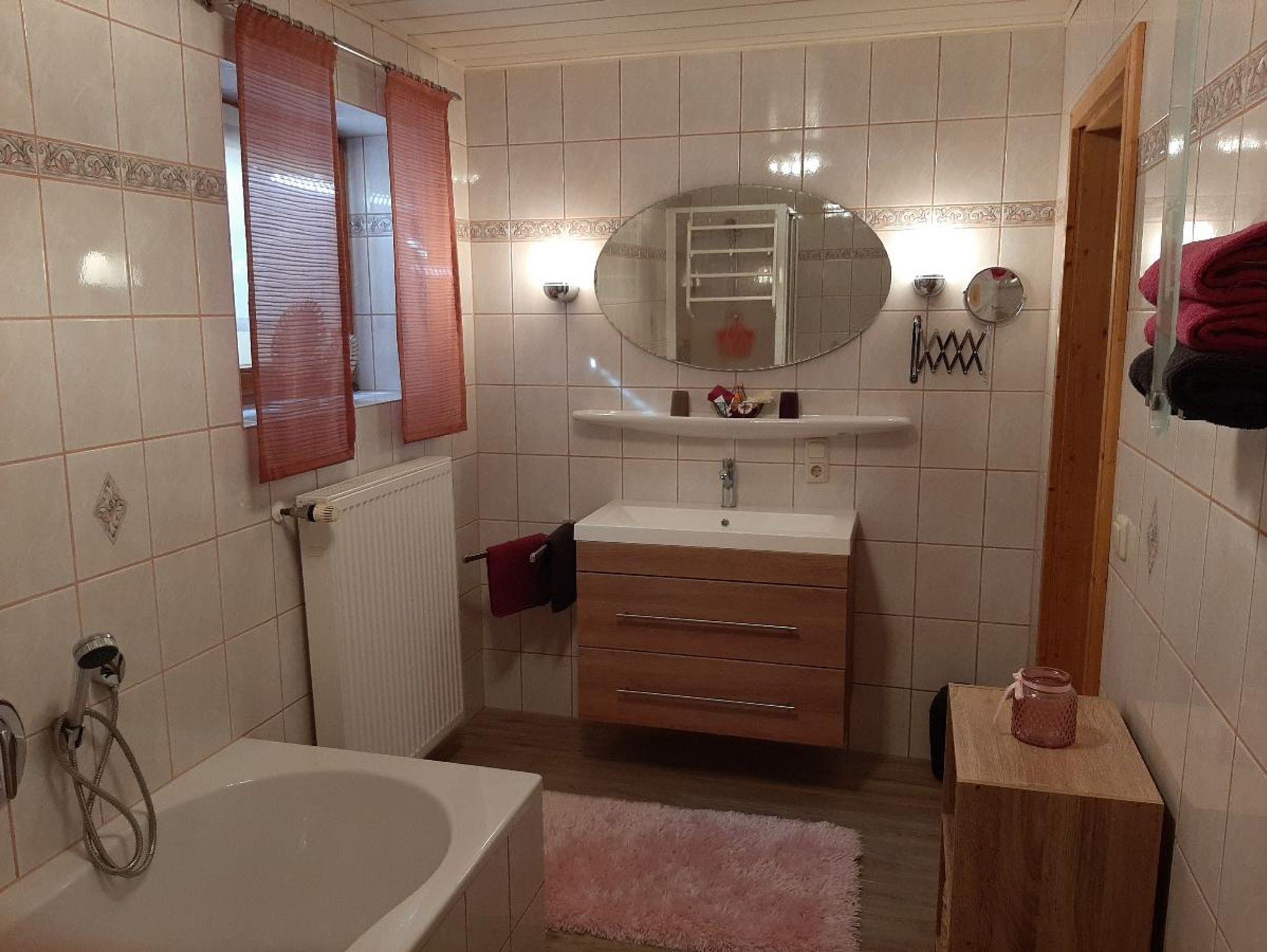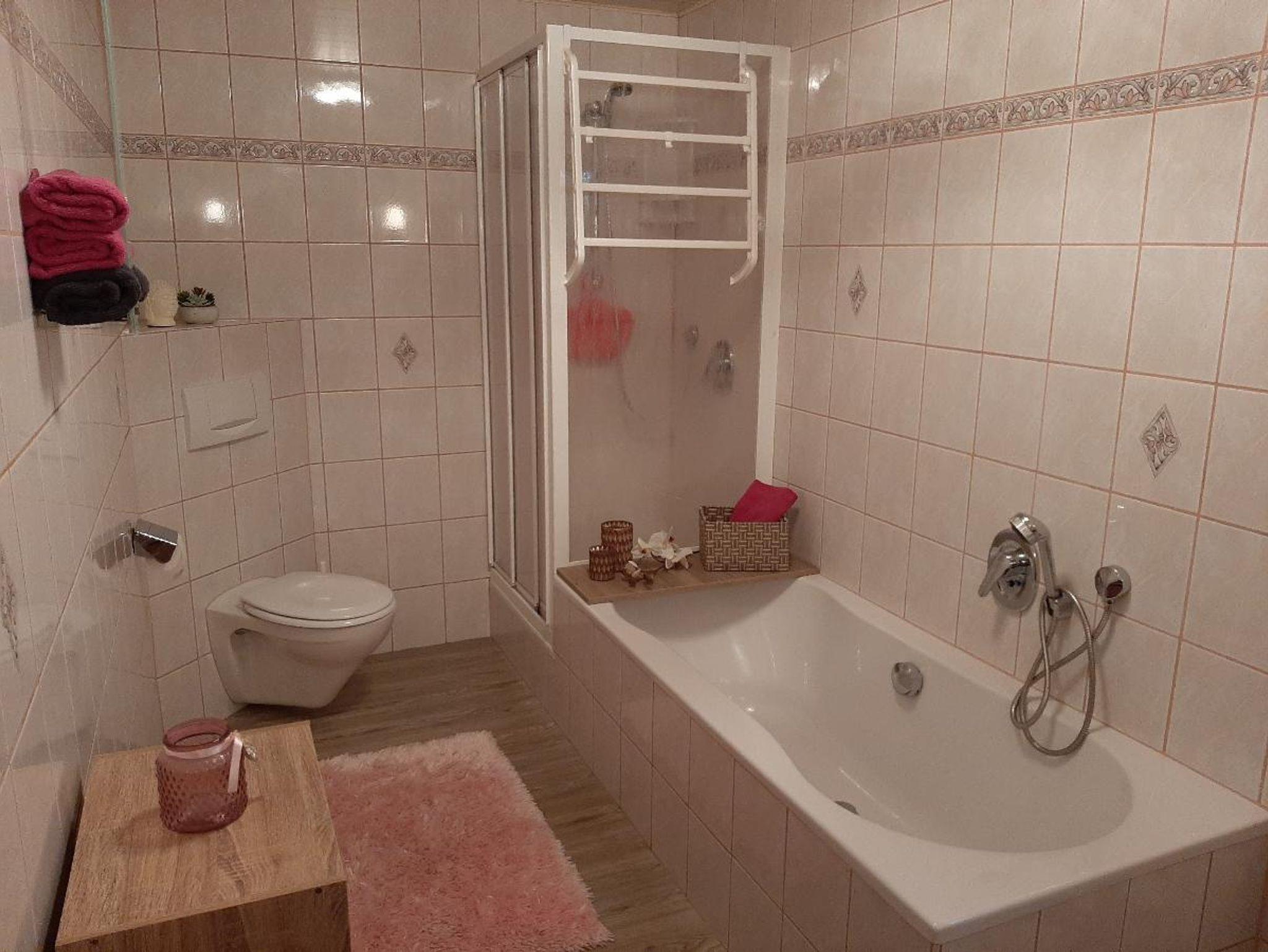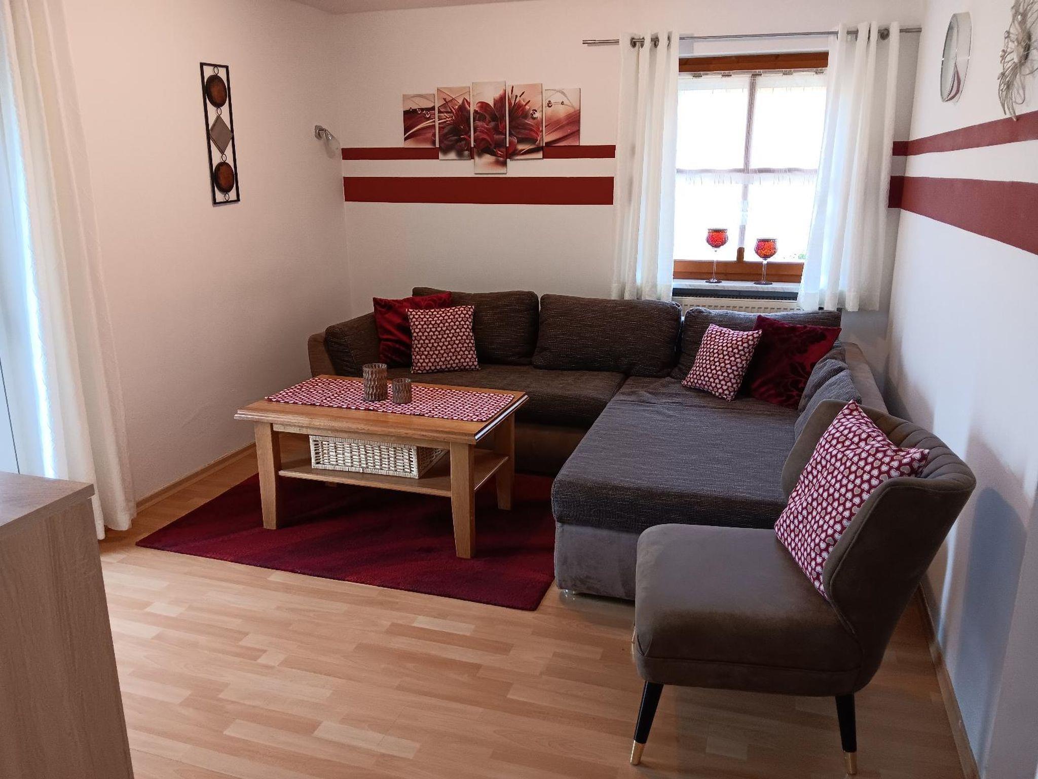 Küche mit Spülmaschine und vieles mehr. Mit Balkonterrasse, Wohnzimmer mit kleinen Balkon und mit Sat-TV -Radio, DVD Spieler , drei Schlafzimmer ( ein Schlafzimmer davon mit extra abgetrennten Raum mit Dusche -Toilette und Waschbecken und extra TV-Sat )belegbar bis 7 Personen siebte Person Zustellbett) Garten mit Spiel- und Liegewiese , Schaukel , Kinderrutsche, großes Trampolin und Gartenmöbel. Unsere Ferienwohnungen liegen in Waldnähe . Der Rad- und Wanderweg sowie das Osserbad sind in unmittelbarer Nähe.