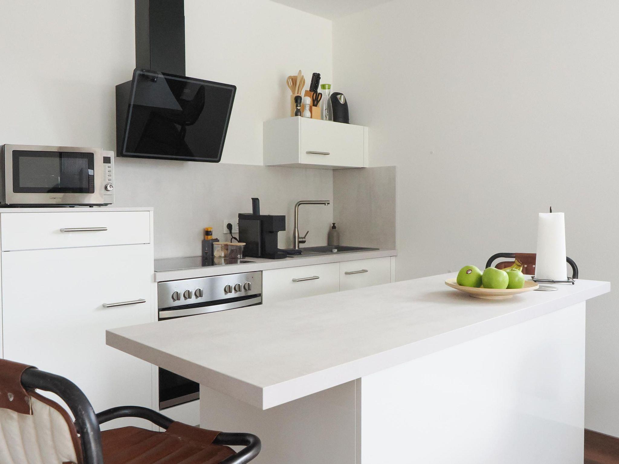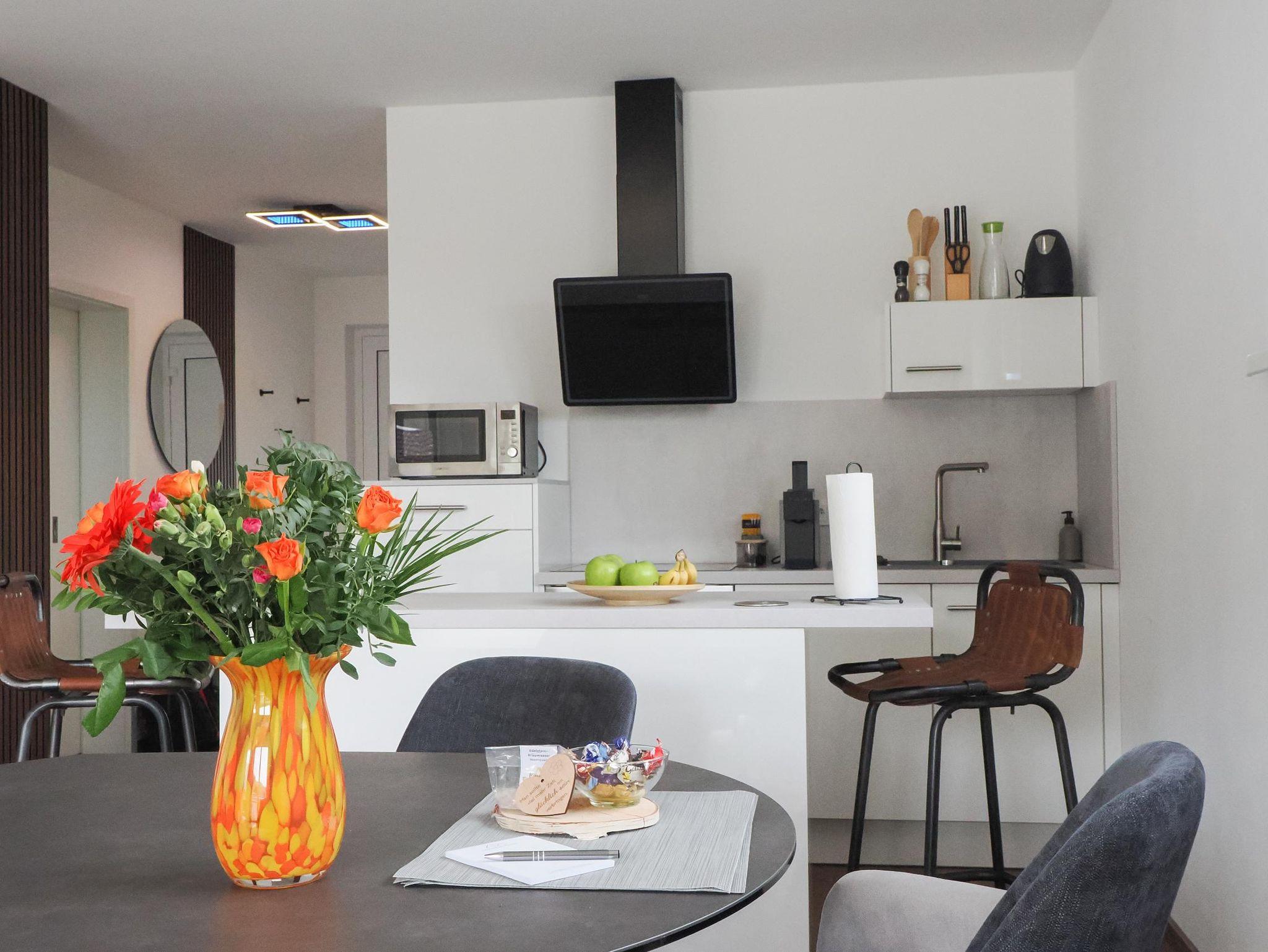 lädt zum Verweilen ein. Die komplett ausgestattete, hochwertige Küchenecke mit Geschirrspüler, Kühlschrank inkl. Gefrierfach, Herd, Backofen, Mikrowelle, Wasserkocher, Toaster und Kaffeemaschine lässt keine Wünsche offen.