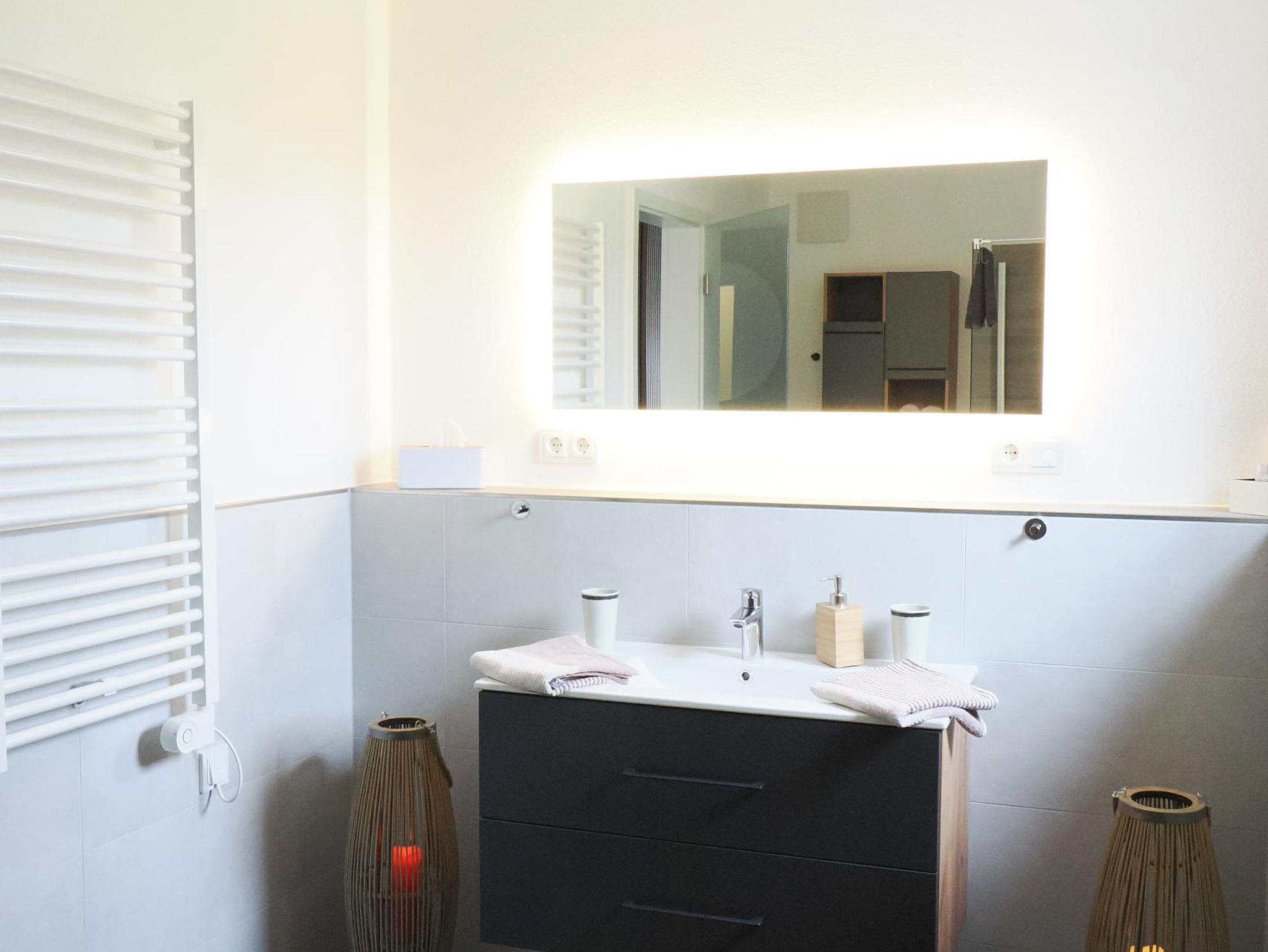 Das geräumige Badezimmer mit ebenerdiger Dusche, großem Spiegel, Kosmetikspiegel, Fön, Handtuchtrockner rundet das Gesamtbild ab.