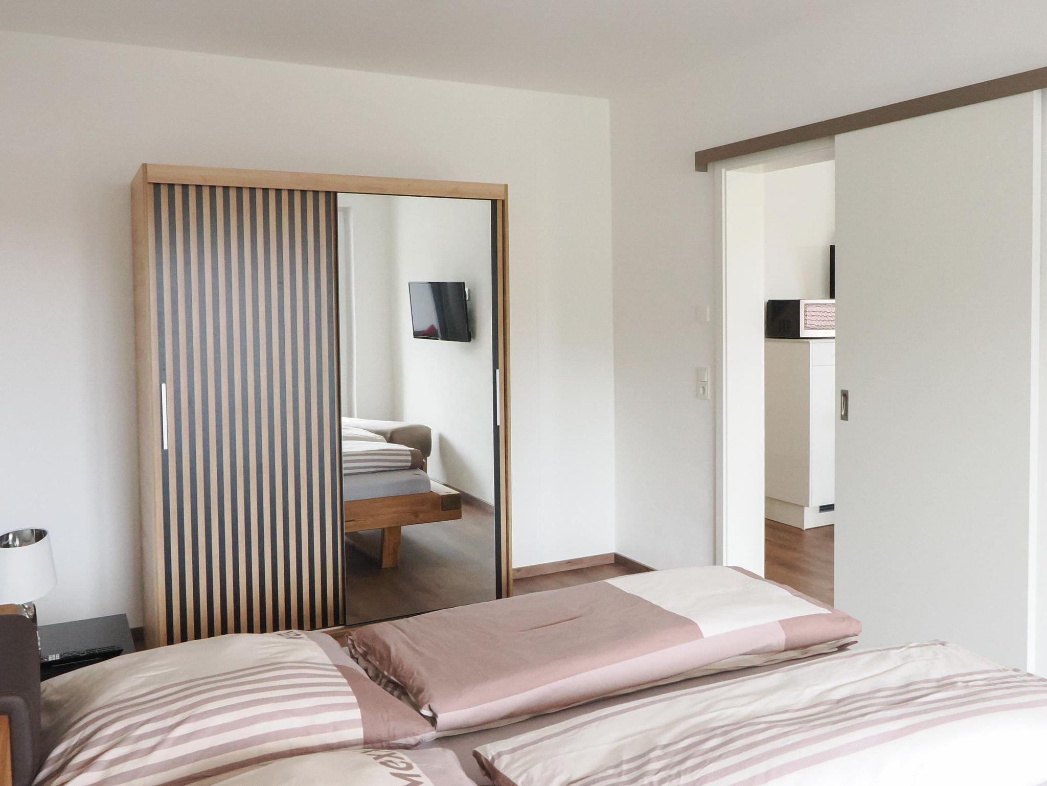Die Ferienwohnung verfügt über 2 Schlafzimmer mit jeweils einem Doppelbett (180 x 200) ohne Fußteil.