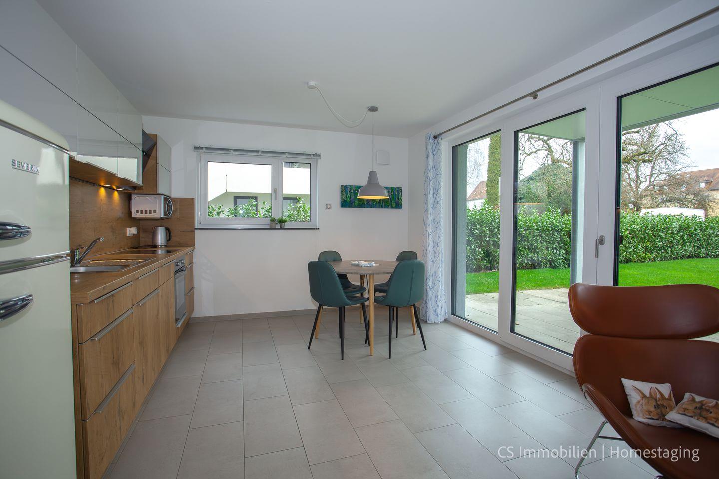Die Wohnung verfügt über einen Wohnraum mit Sitz- und Essecke sowie eine offene Küche mit großer Fensterfront zum Garten. Auf der privaten, überdachten Terrasse können Sie im Grünen frühstücken, auf einer Liege entspannen oder den Tag bei einem Abendessen mit regionalen Köstlichkeiten und einem Glas Bodensee-Wein ausklingen lassen.