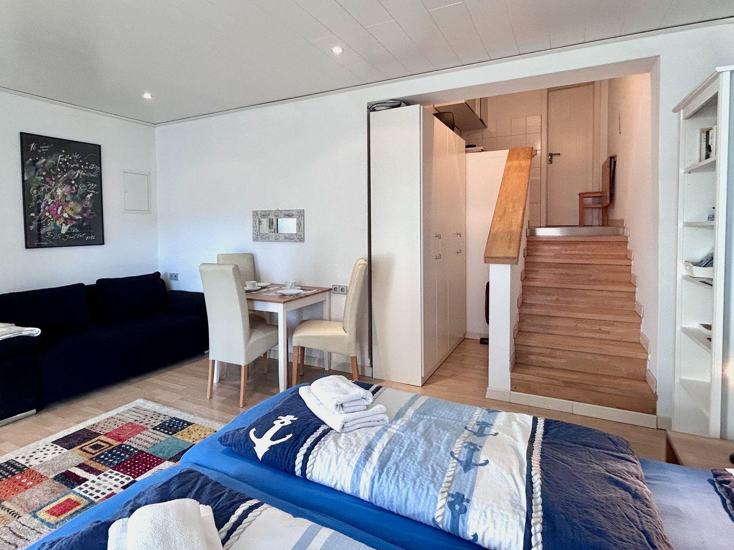 Durch die zentrale Lage erreichen Sie den Bahnhof, die Seepromenade, Cafés und Einkaufsmöglichkeiten bequem zu Fuß. Dieses Apartment ist perfekt für Alleinreisende oder Paare, die Langenargen und die wunderschöne Bodenseeregion erleben möchten.