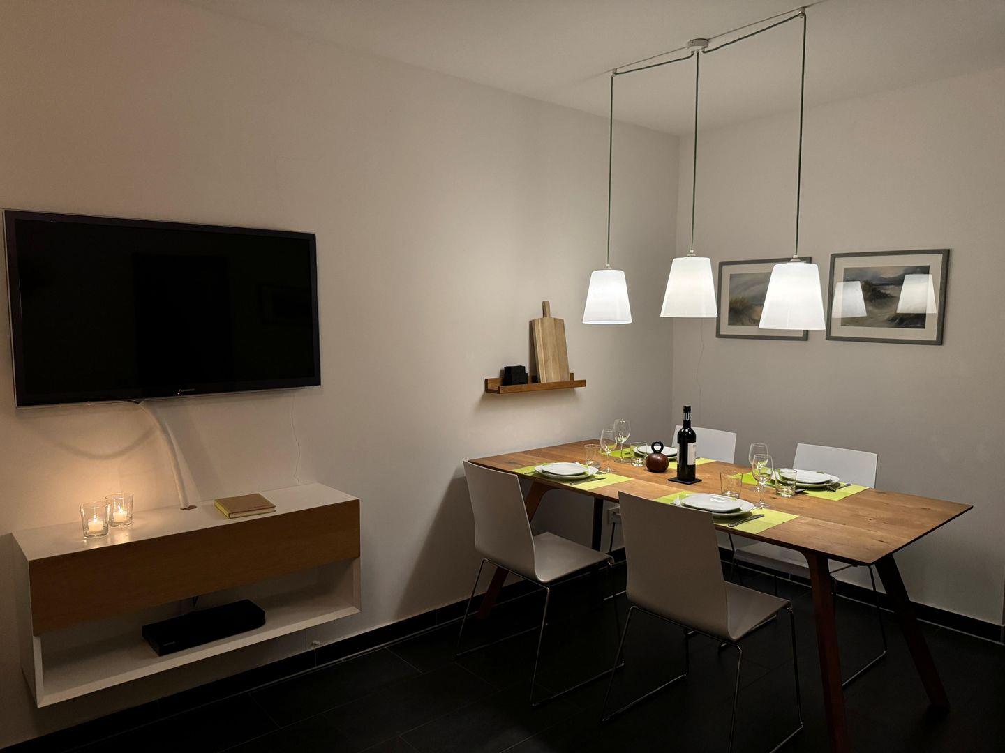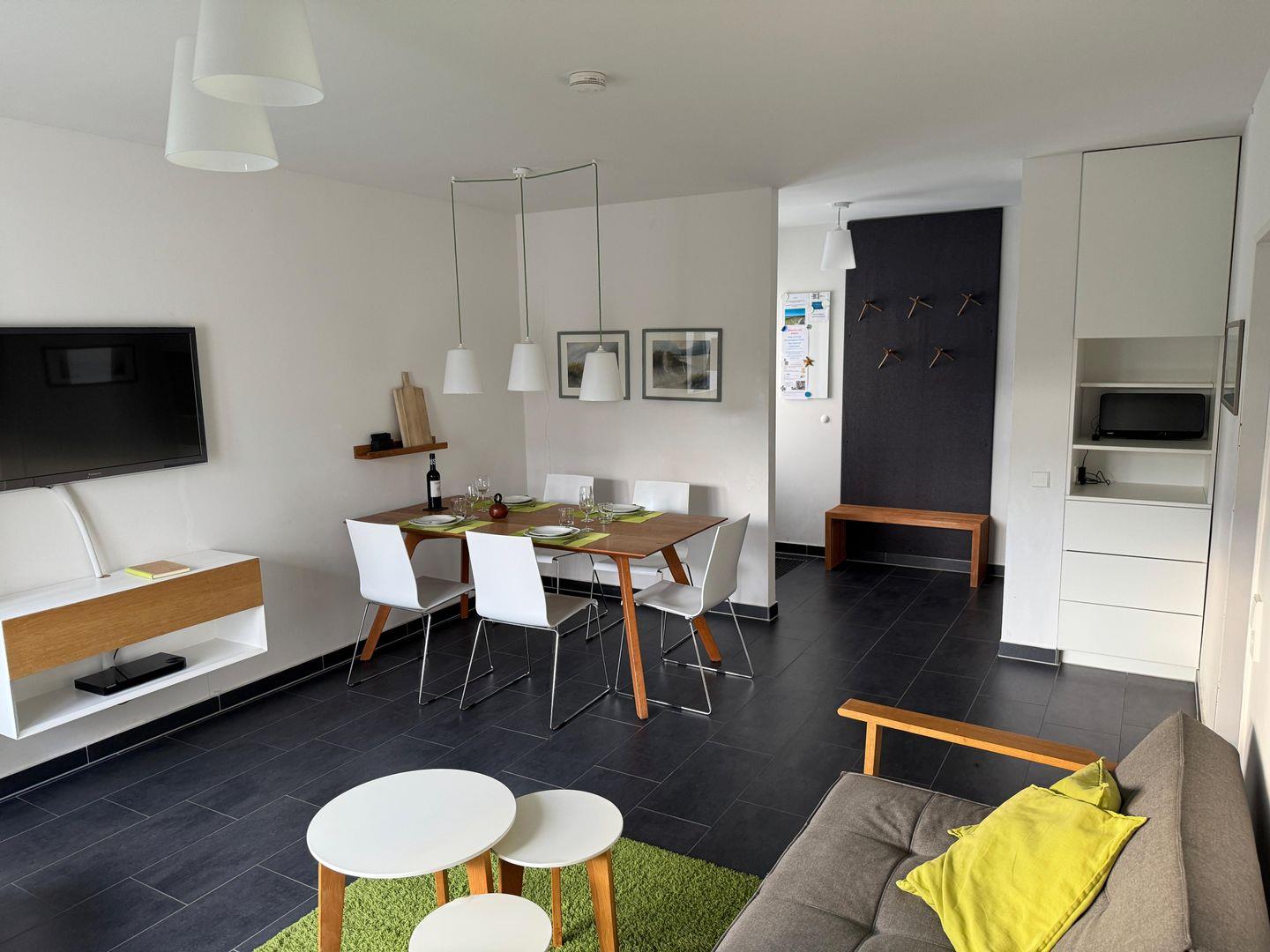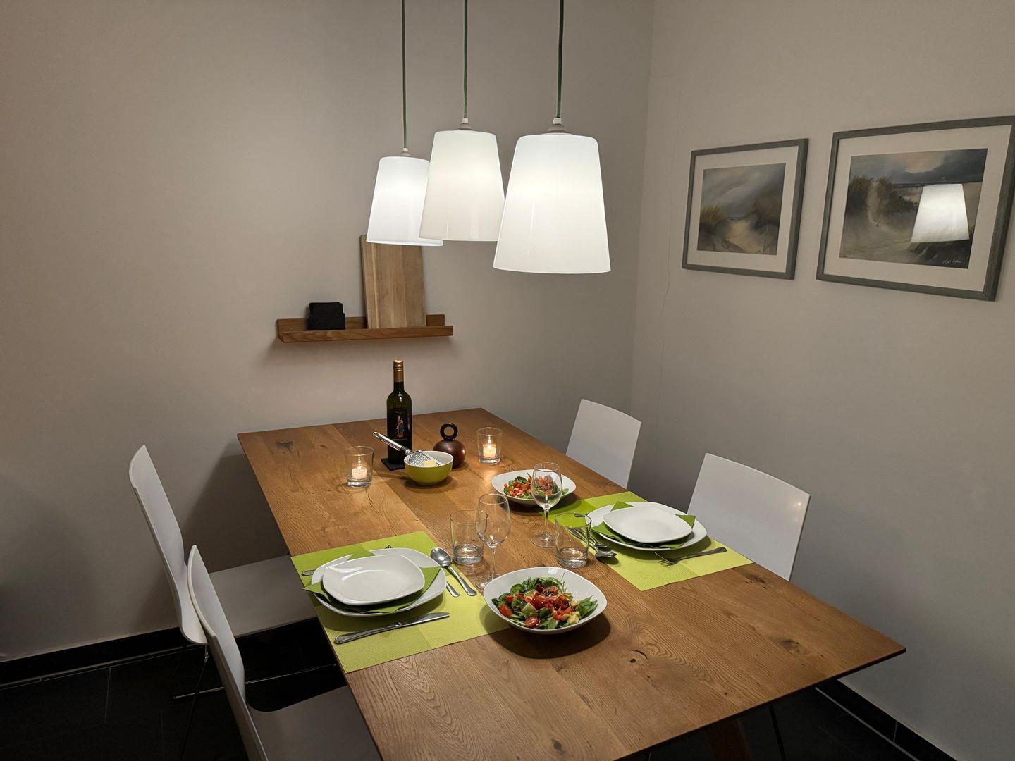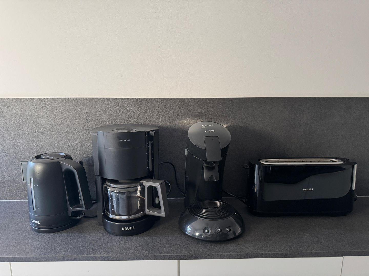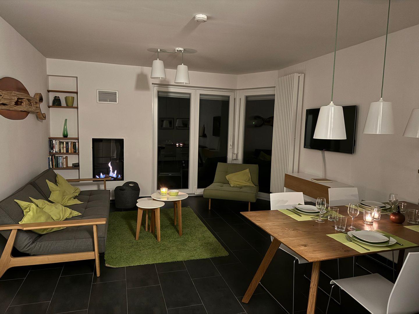 EG: Wohnraum mit Gaskamin, großem Flachbildschirm, Blu-Ray Player mit Streaming Funktion (u.a. Netflix, Amazon Video), Bluetooth Stereo-Micro-Anlage für MP3 CD mit USB-Anschluss und Radio, Esstisch für 8 Personen. Sofa mit Schlaffunktion für eine Person. Zugang zur Terrasse. Separate Küche mit Ausgang zur windgeschützten Terrasse. Ausgestattet mit Geschirrspüler, Ceranfeld, Backofen, Mikrowelle, großem Kühlschrank mit Gefrierschubladen, Kaffeemaschine, Pad-Kaffeemaschine, Wasserkocher, Toaster, Handmixer, Pürierstab.