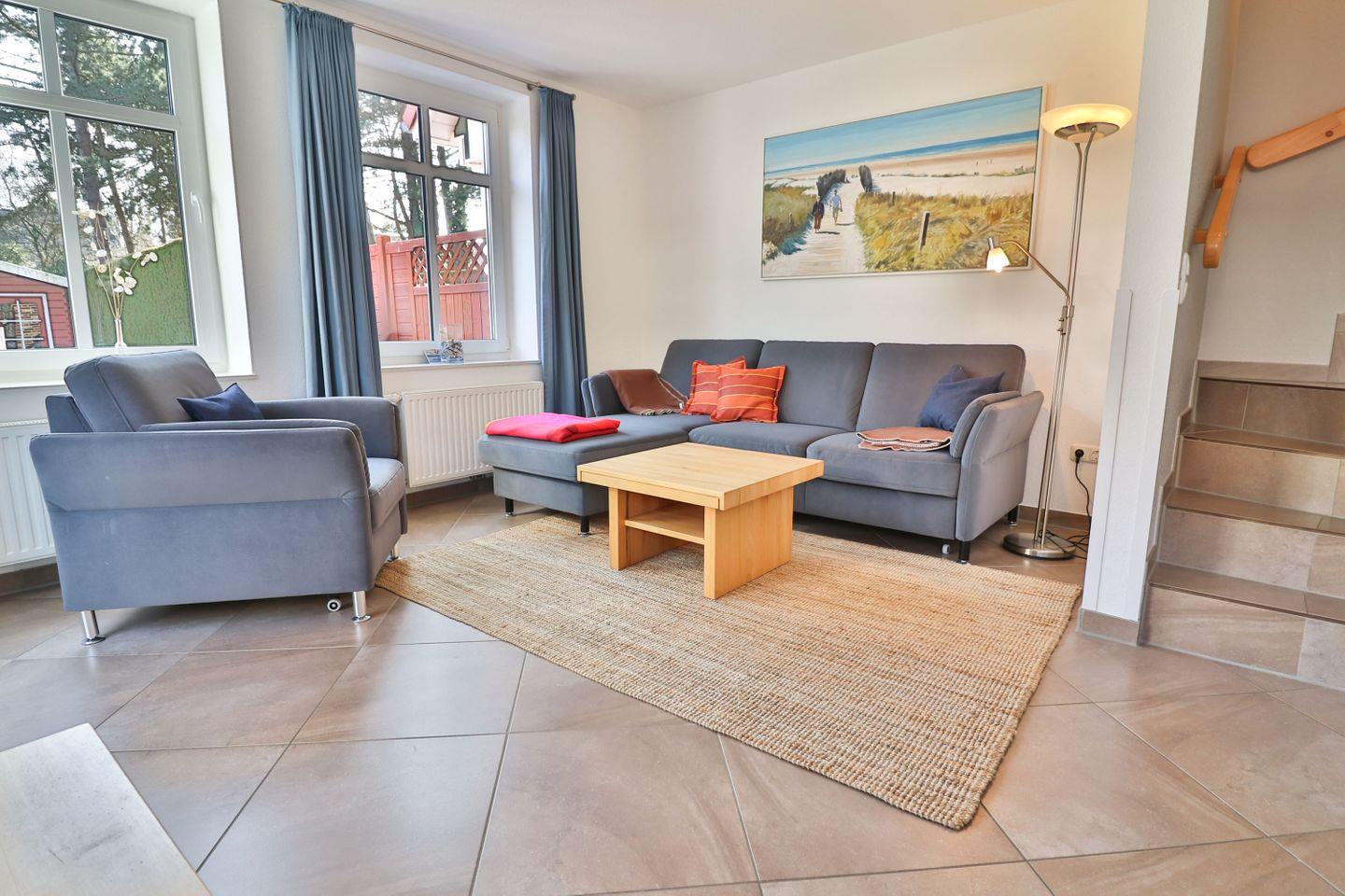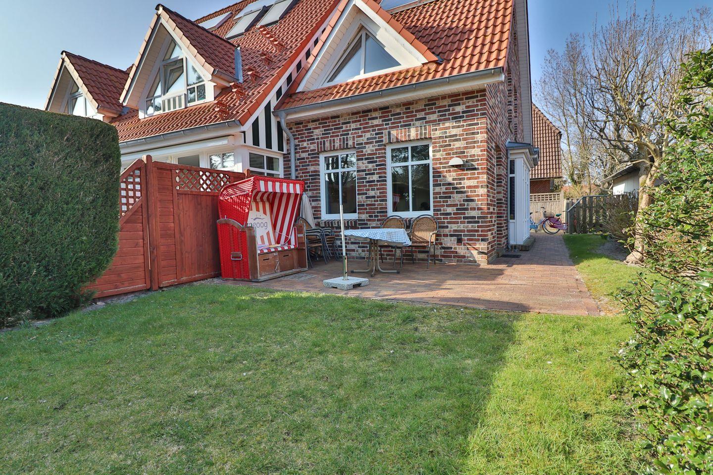 Ein weiteres Highlight des Hauses ist die sonnige Terrasse, die mit Gartenmöbeln ausgestattet ist und sich hervorragend für entspannte Stunden im Freien eignet. Der angrenzende Garten mit Liegewiese bietet Kindern ausreichend Platz zum Spielen. Ein Strandkorb sowie Sonnenliegen laden dazu ein, die warmen Sonnenstrahlen zu genießen und sich zu entspannen.