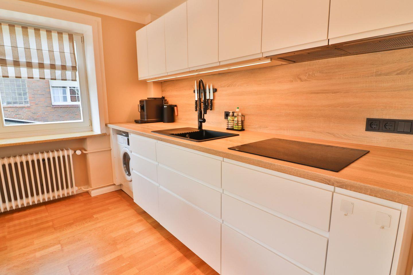 Herzstück der Wohnung ist das großzügige Wohn-Esszimmer mit gemütlichem Sofa, Fernseher und einem einladenden Essbereich – perfekt für gemeinsame Mahlzeiten, Spieleabende oder einfach zum Seele baumeln lassen. Die offene Küchenzeile ist modern und vollständig ausgestattet: Cerankochfeld, Backofen und Mikrowelle auf angenehmer Höhe, Spülmaschine, Kühlschrank, Kaffeemaschine sowie sämtliche Küchenutensilien sorgen für Komfort und eine unkomplizierte Selbstversorgung. Praktisch: Der Waschtrockner ist platzsparend in die Küchenzeile integriert.