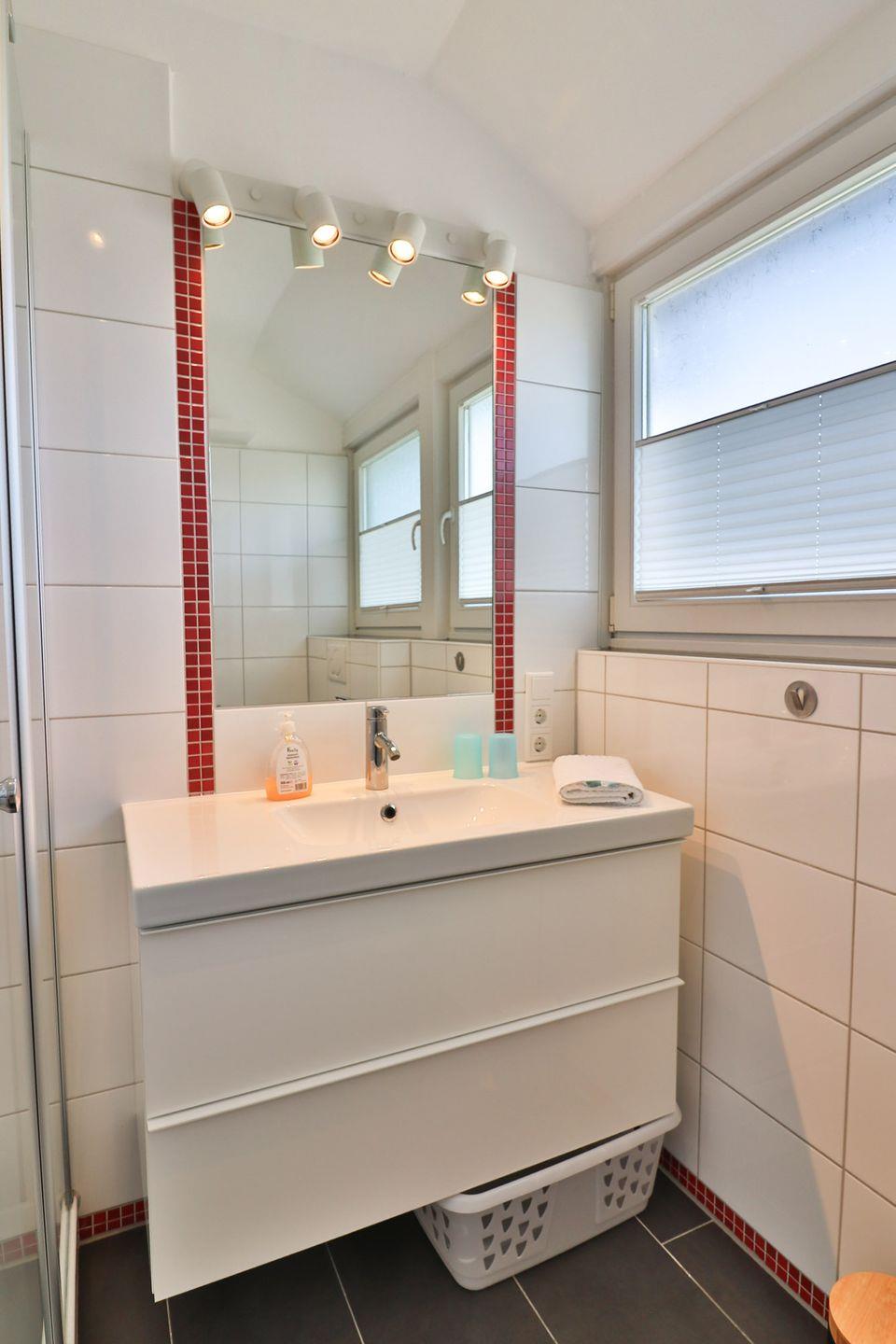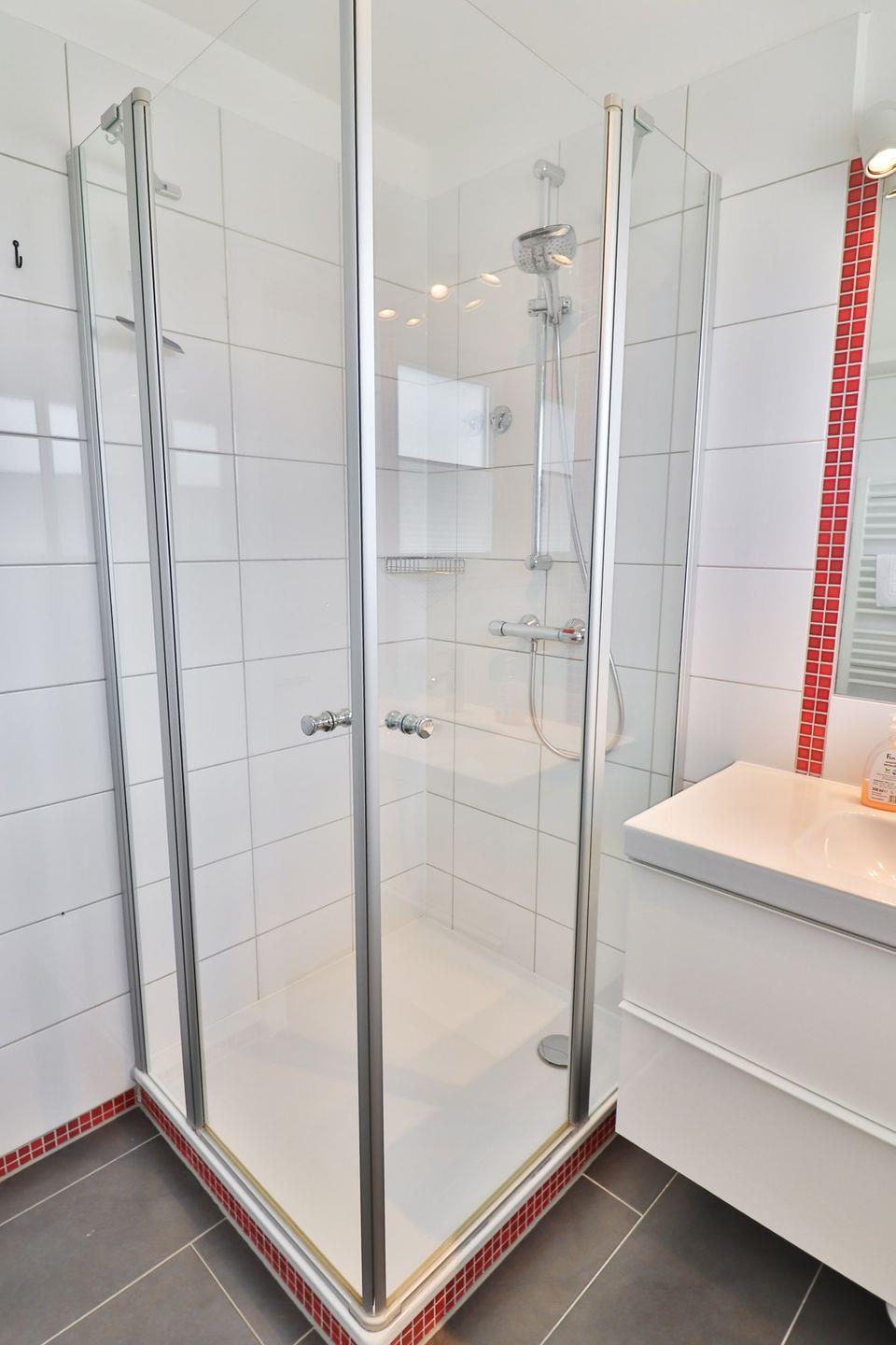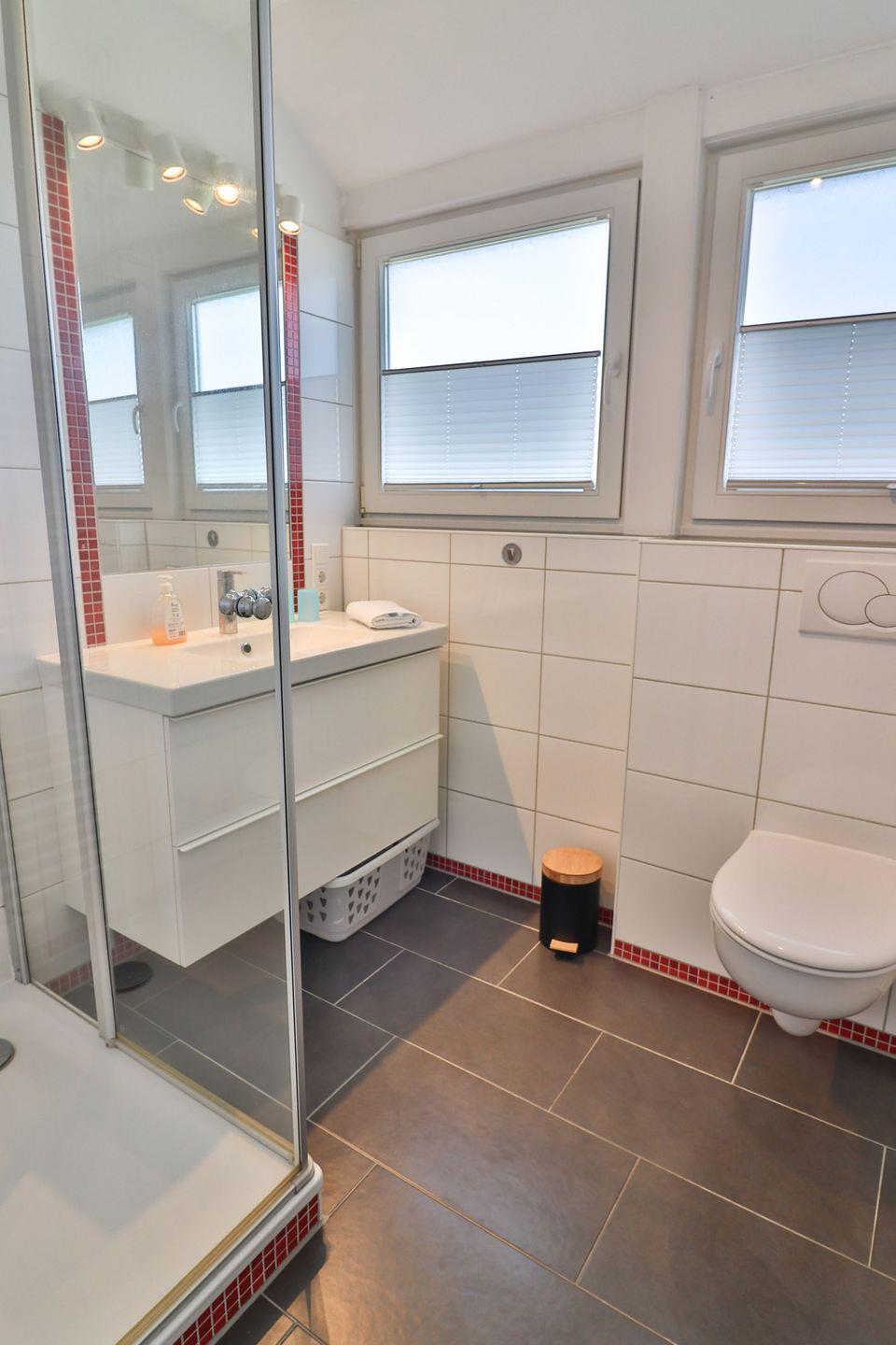 Das moderne Badezimmer mit Dusche, WC und Waschbecken rundet den funktionalen Grundriss ab.
