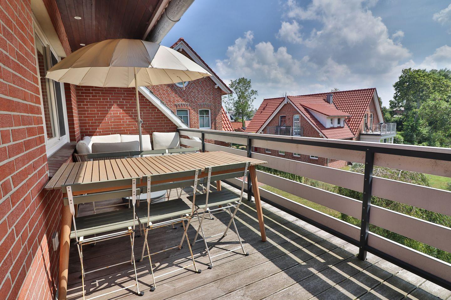 Ein besonderes Highlight ist der große Süd-Balkon, den Sie direkt vom Wohnungsflur aus betreten. Hier laden ein Tisch, Stühle, Loungemöbel und ein Sonnenschirm zum Entspannen in der Sonne ein – ob beim Frühstück, Nachmittagskaffee oder einem Glas Wein am Abend.