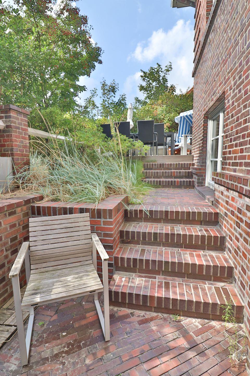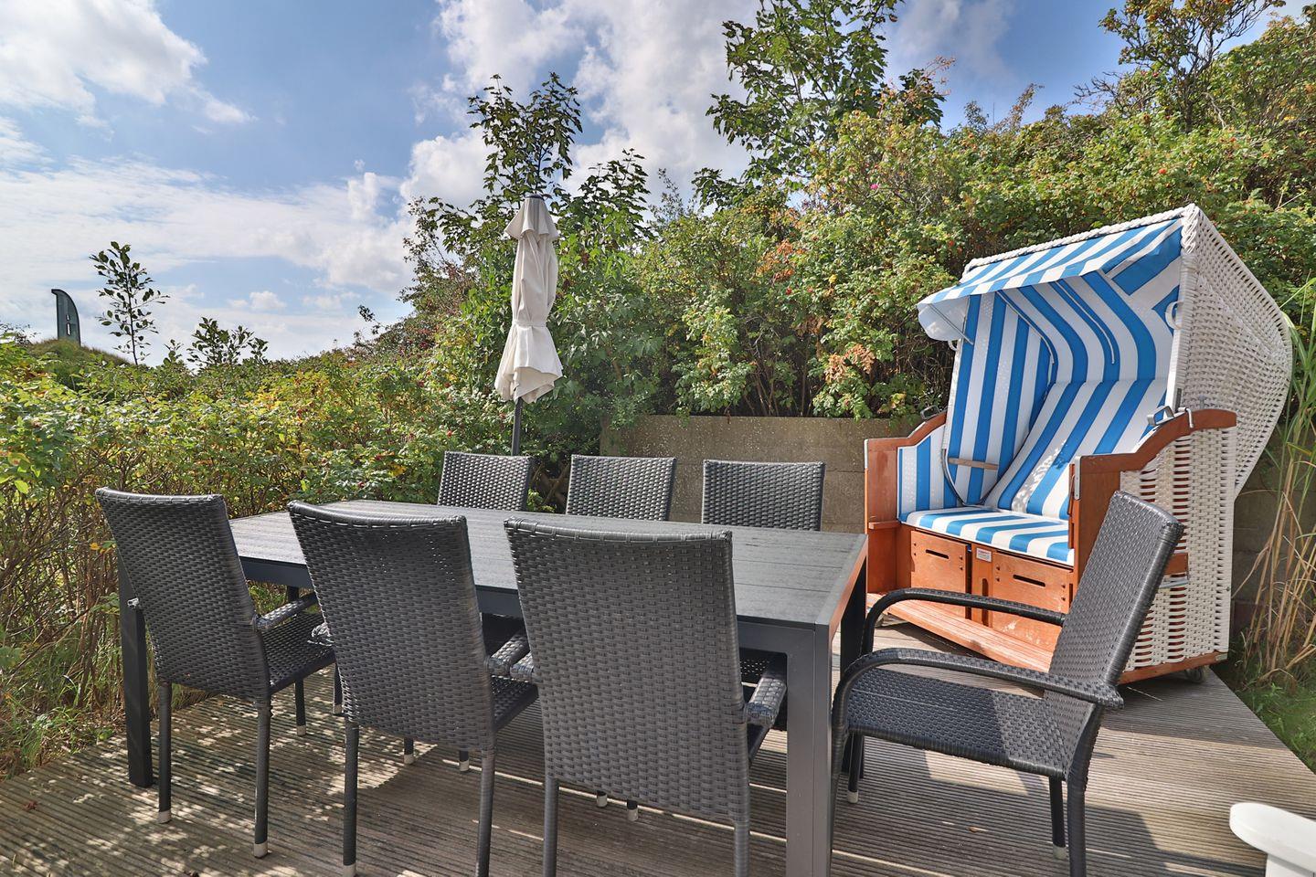 Der Außenbereich bietet Ihnen eine eigene möblierte Terrasse sowie einen gemeinschaftlich Garten mit Sonnenstühlen, Gartenmöbeln, Liegewiese und einem Strandkorb. Hier können Sie entspannen und die frische Nordseeluft genießen.