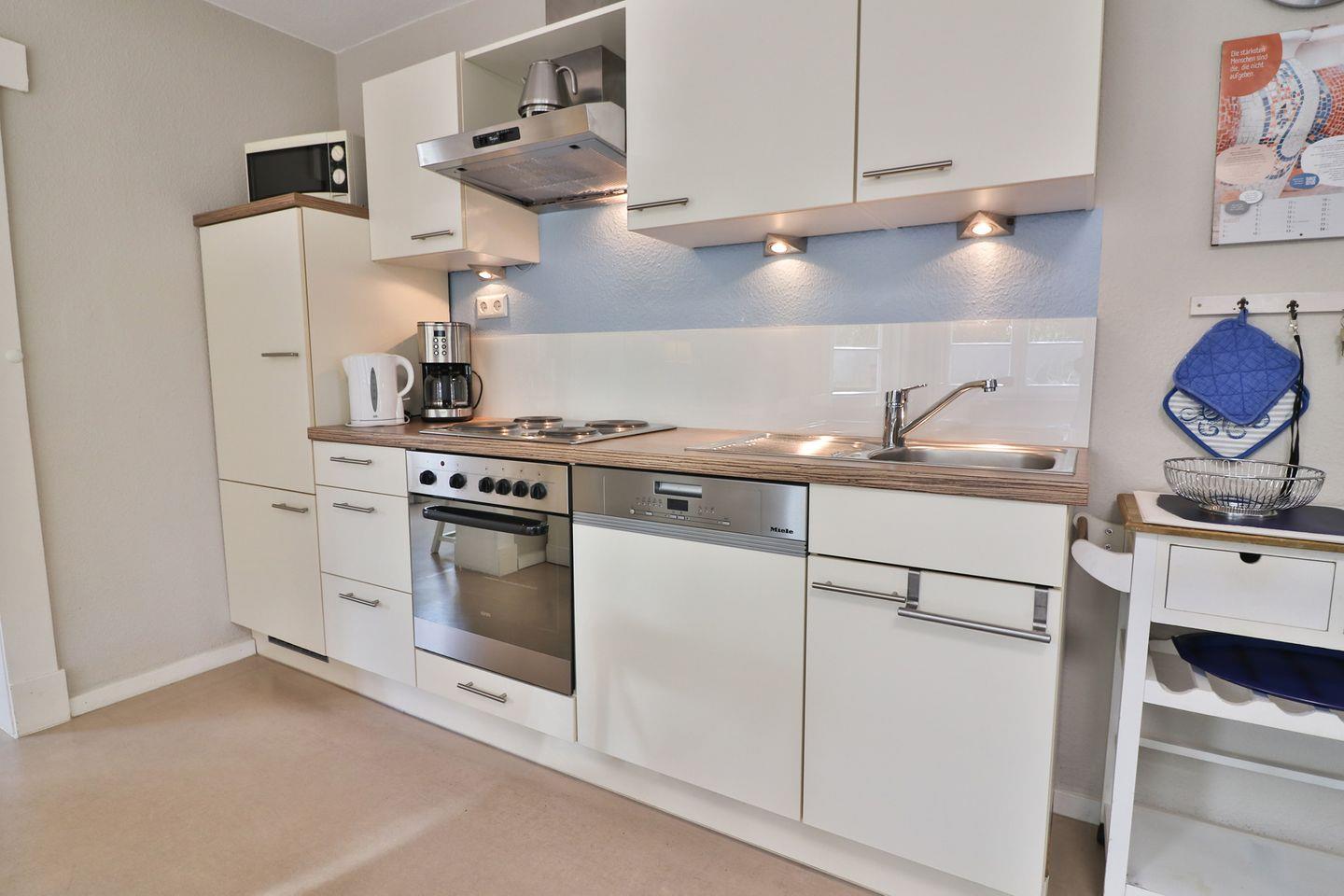 Die Küchenzeile ist vollständig in das Wohnkonzept integriert und lässt keine Wünsche offen. Ausgestattet mit einem 4-Platten-Herd, Backofen, Kühlschrank mit Gefrierfach, Kaffeemaschine, Wasserkocher, Toaster, Mixer, Eierkocher sowie sämtlichen Küchenutensilien, können Sie Ihre Urlaubstage nach Belieben kulinarisch gestalten. Eine gemeinschaftlich nutzbare Waschmaschine und ein Trockner sowie eine Wäschespinne im Garten ergänzen die Ausstattung, sodass auch längere Aufenthalte komfortabel gestaltet werden können.