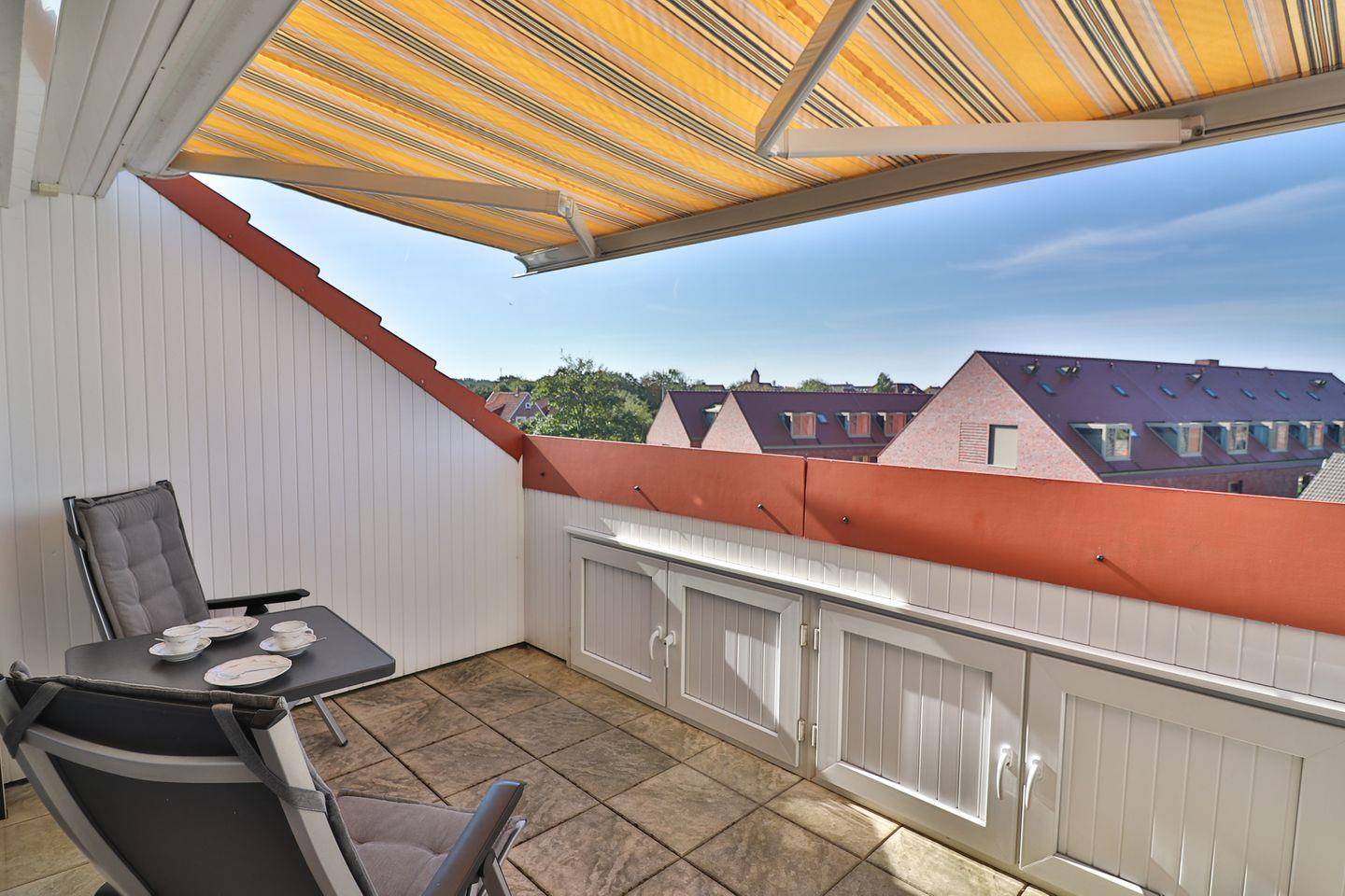 Ein besonderes Highlight ist der uneinsehbare Balkon, der durch eine Markise angenehm beschattet werden kann. Hier sind Sie ganz für sich und haben die Möglichkeit, Ihren Tag im Freien zu beginnen oder bei einem Getränk ausklingen zu lassen – unabhängig vom Wetter. Der Essbereich mit Esstisch befindet sich ebenfalls im Wohnraum, ideal für ein gemeinsames Frühstück oder ein gemütliches Abendessen.
