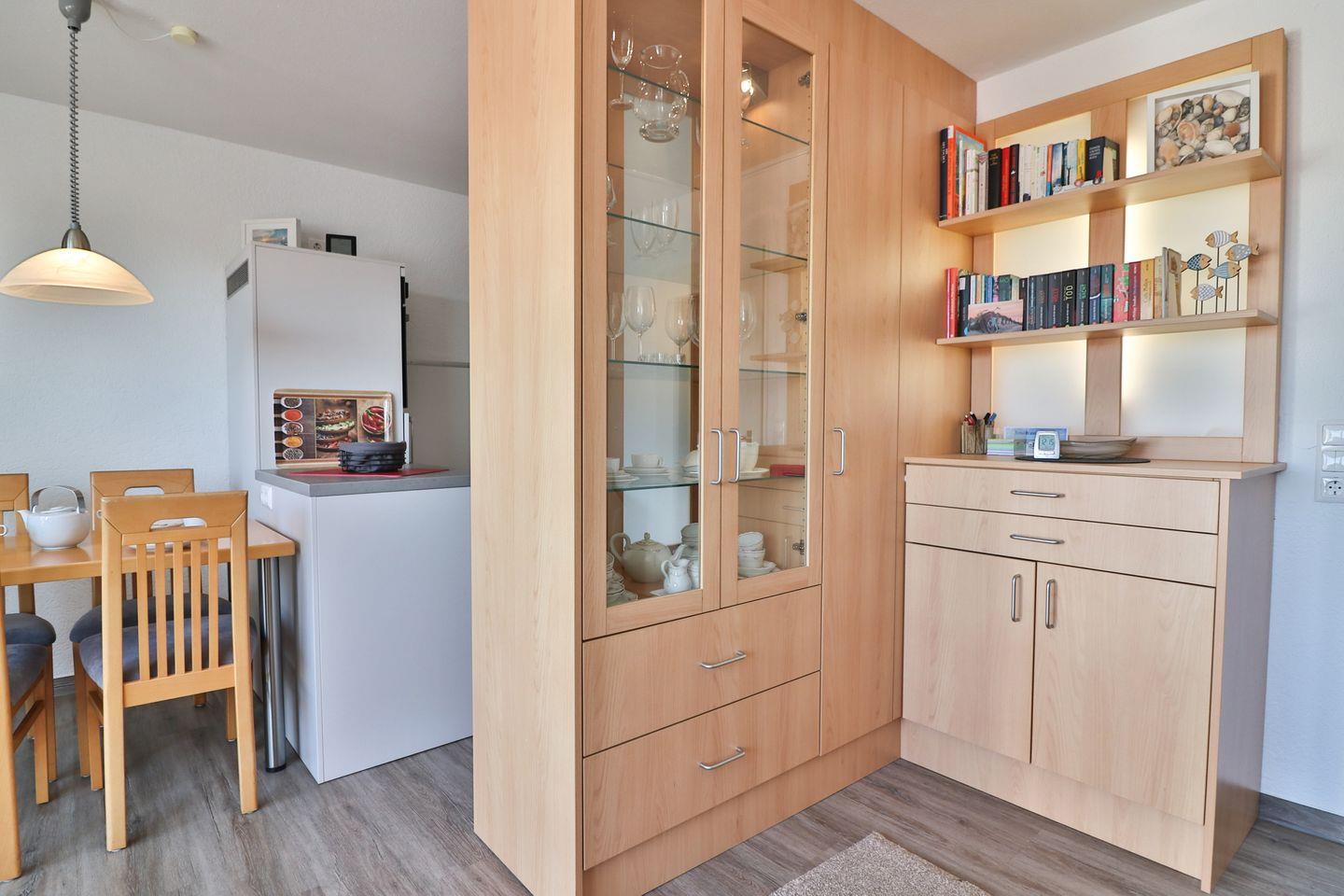 Das Ein-Raum-Apartment verfügt über Sichtschutz an allen Fenstern, sodass für einen ruhigen Schlaf und Privatsphäre gesorgt ist. Jeder Winkel wird hier optimal genutzt. Basis für den kompakten Wohn-Schlafbereich ist ein gemütliches Sofa und das separate Bettelement. Das Schrankbett öffnet sich über dem Sofa und hat eine hochwertige Matratze/Lattenrost in der Größe von 160 x 195 cm. Ein Sessel sowie TV, eine HiFi-Anlage und ein Radio runden die Ausstattung ab und laden dazu ein, nach einem aktiven Tag auf der Insel zu entspannen. Zusätzlich stehen Ihnen Bücher und Spiele zur Verfügung, um auch an regnerischen Tagen für Unterhaltung zu sorgen.
