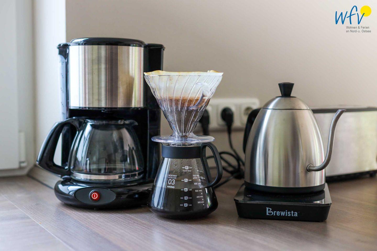 Oder Sie finden Ihren Lieblingsplatz in der offenen modernen Küche mit Küchenzeile, Kochinsel und schönem Blick in die Umgebung - ein herrlicher Platz zum gemeinsamen Kochen und Klönen! Mit den hochwertigen Elektro- und Kleingeräten wie Mikrowelle, Ceranherd, Backofen, Kaffeemaschine, Wasserkocher und Toaster lassen sich schnell und einfach leckere Gerichte zaubern oder Snacks für den Ausflug zubereiten. Die Spülmaschine übernimmt den Abwasch für Sie.