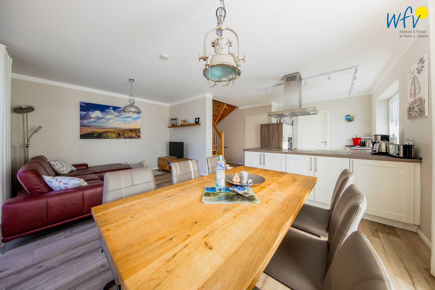 Der helle, großzügige Wohn/Essbereich ist wie das gesamte Haus in einem charmanten sand-beige gehalten. Eigene Bilder der Insel bringen Ihnen das Nordseeflair direkt ins Haus. An einem großen Eiche Echtholztisch mit 6 bequemen Stühlen können Sie nach dem Strandtag oder der Fahrradtour gemütlich beisammen sitzen und Ihre Mahlzeiten genießen. Die große Echtleder Couch bietet Ihnen auch bei nicht so gutem Wetter genügend Platz zum Entspannen. Ein modernes TV, eine Micro HiFi-Anlage, 4KUpscale Blu-ray Disc, DVDs, verschiedene Bücher und Gesellschaftsspiele sowie Kinderspiel- und Malsachen sorgen für abwechslungsreiche Unterhaltung.