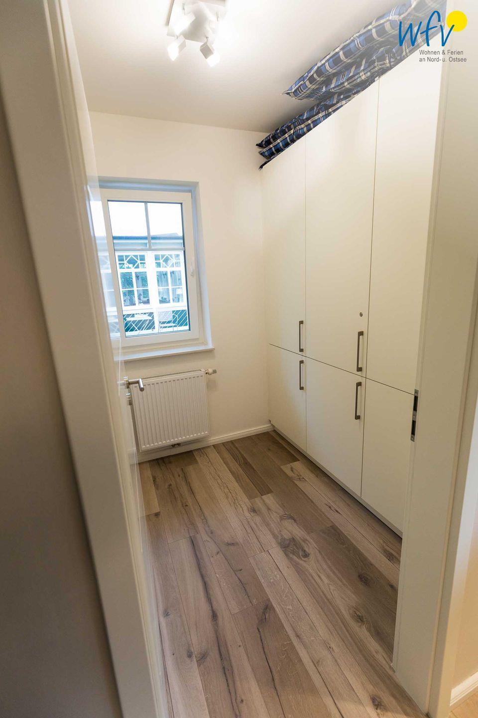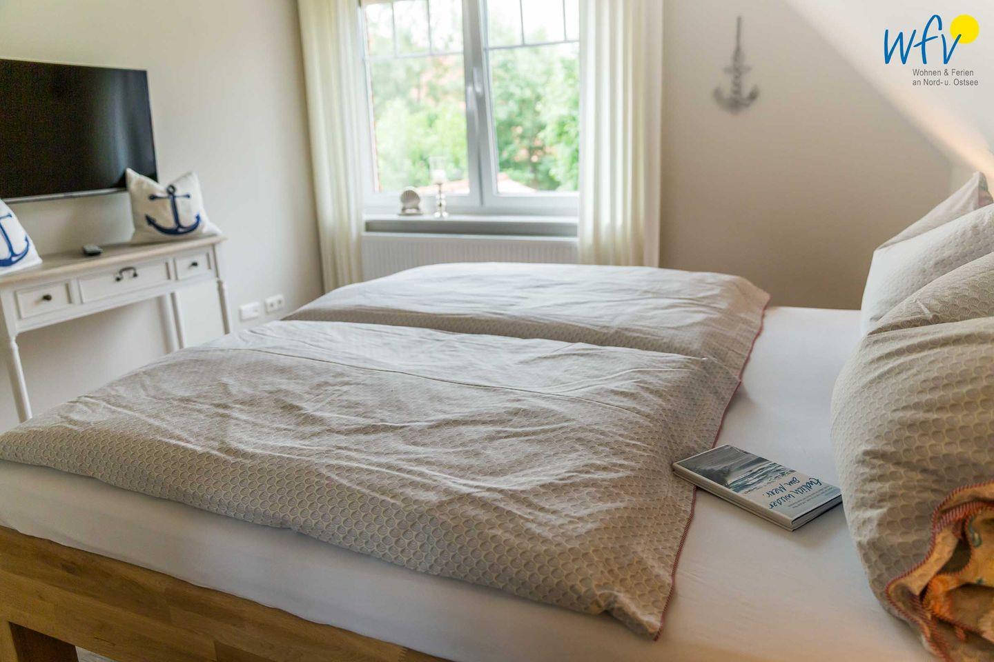 Das zweite Schlafzimmer ist ebenfalls in einem charmanten sand-beige gehalten und befindet sich auf der Südseite zum eigenen Garten hin. Zwei große Einzelbetten (90 cm x 200 cm) aus Eichenholz verfügen über eine Komforthöhe, die ebenfalls für einen angenehmen Ein- und Ausstieg sorgt. Ein großer Kleiderschrank bietet genügend Platz für Ihre Urlaubsgarderobe. Sollte der Wunsch nach einer kompletten Verdunklung vorhanden sein, sorgen in beiden Räumen Rollladen für eine gute Nachtruhe. Ein Smart-TV, eine Konsole mit Stuhl sowie ein Ganzkörperspiegel ergänzen den Komfort der Schlafzimmer jeweils.