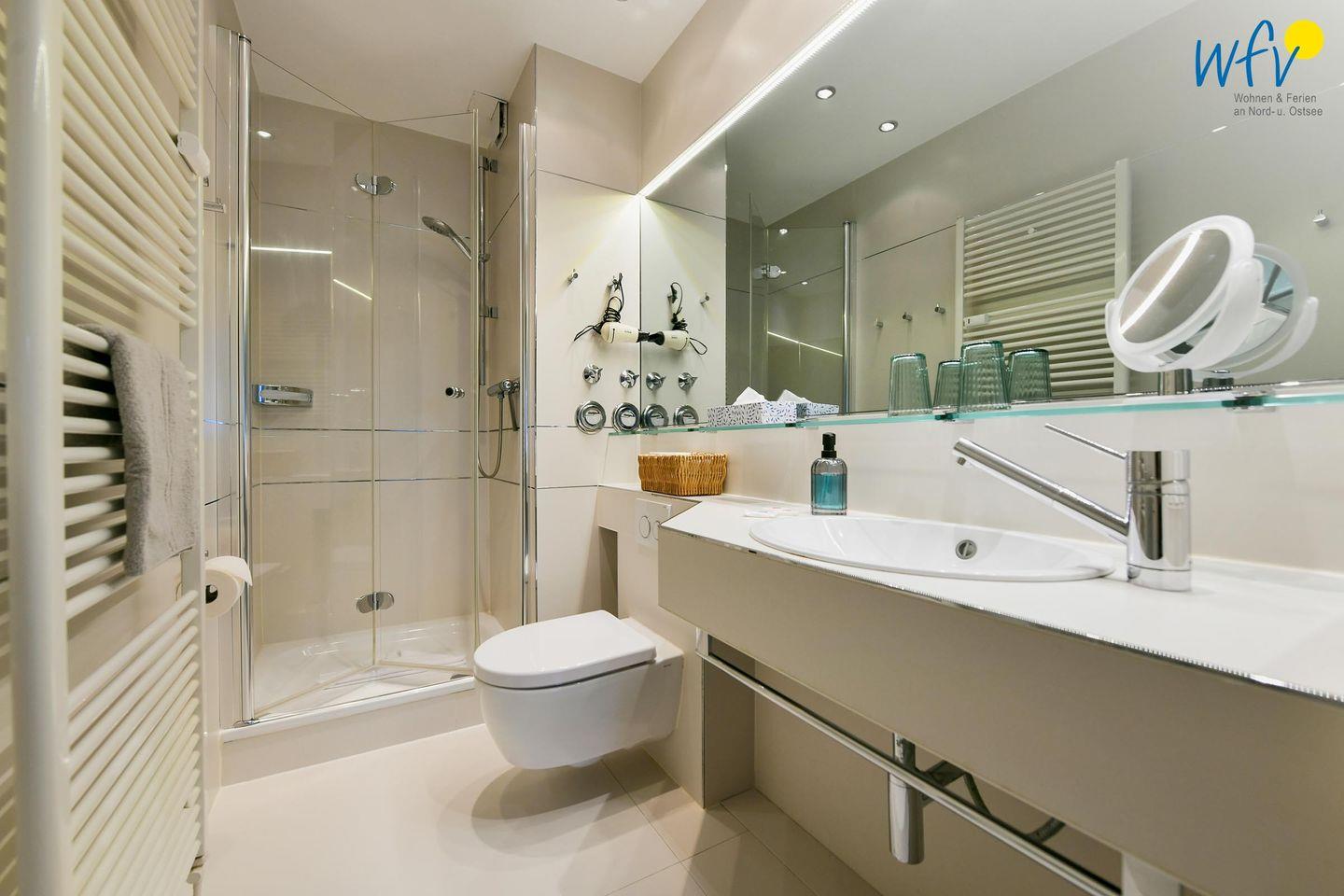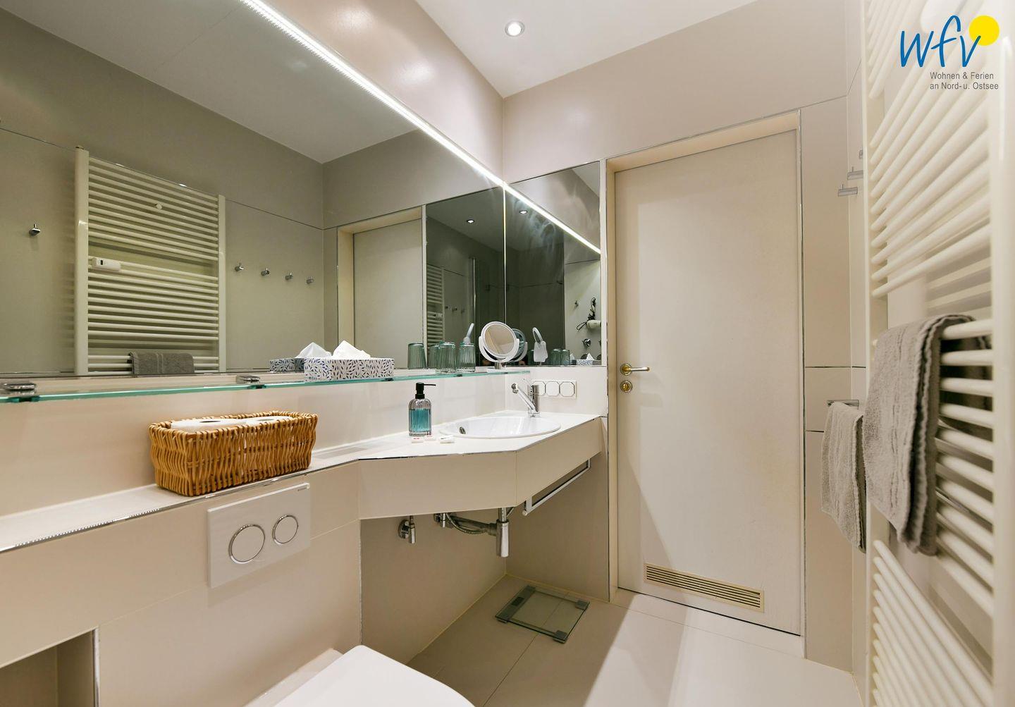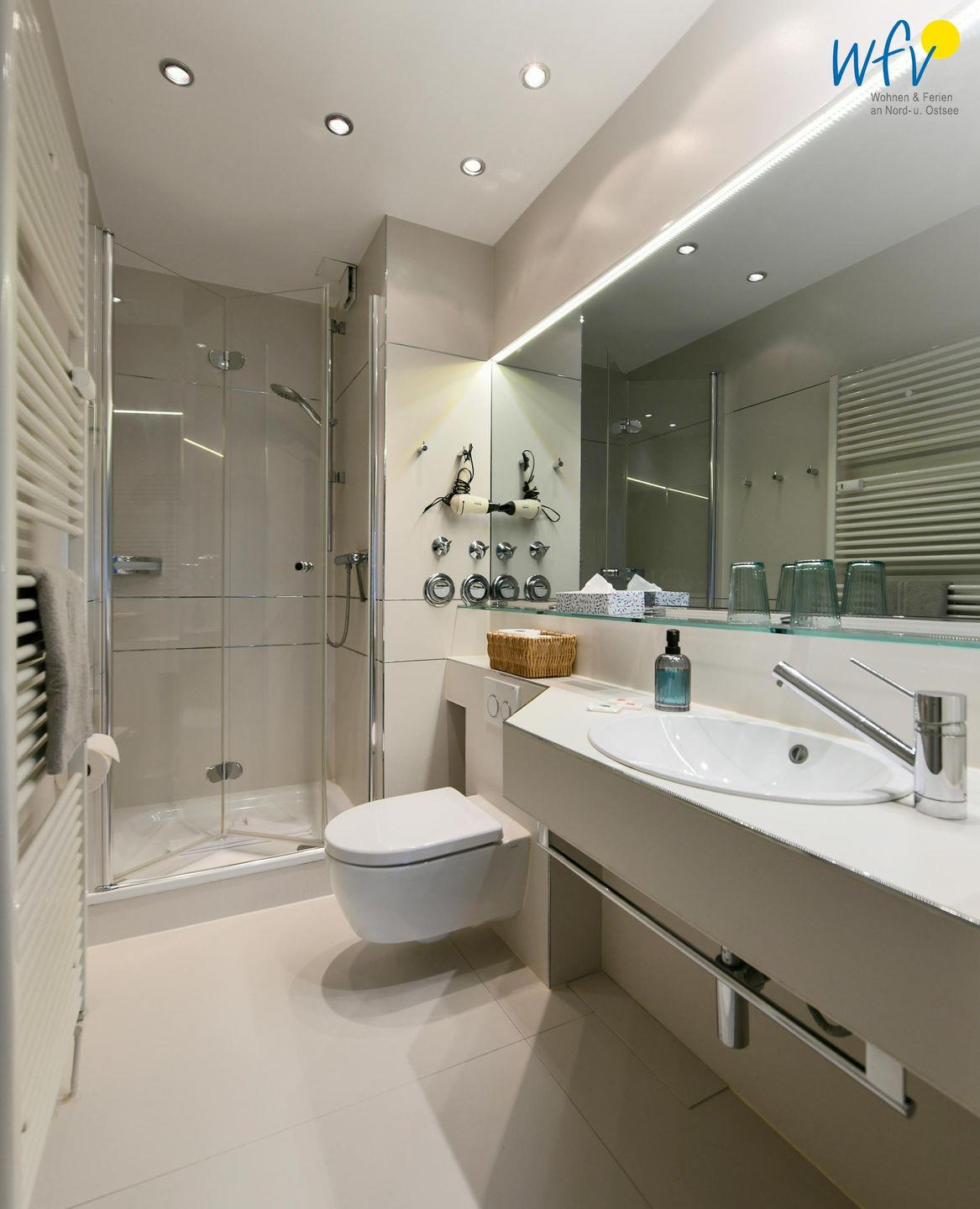 Für zusätzlichen Wohnkomfort sorgt das elegante Badezimmer mit Dusche, breitem Waschtisch, großem Spiegel sowie Kosmetikspiegel, Föhn und Handtuchheizung.