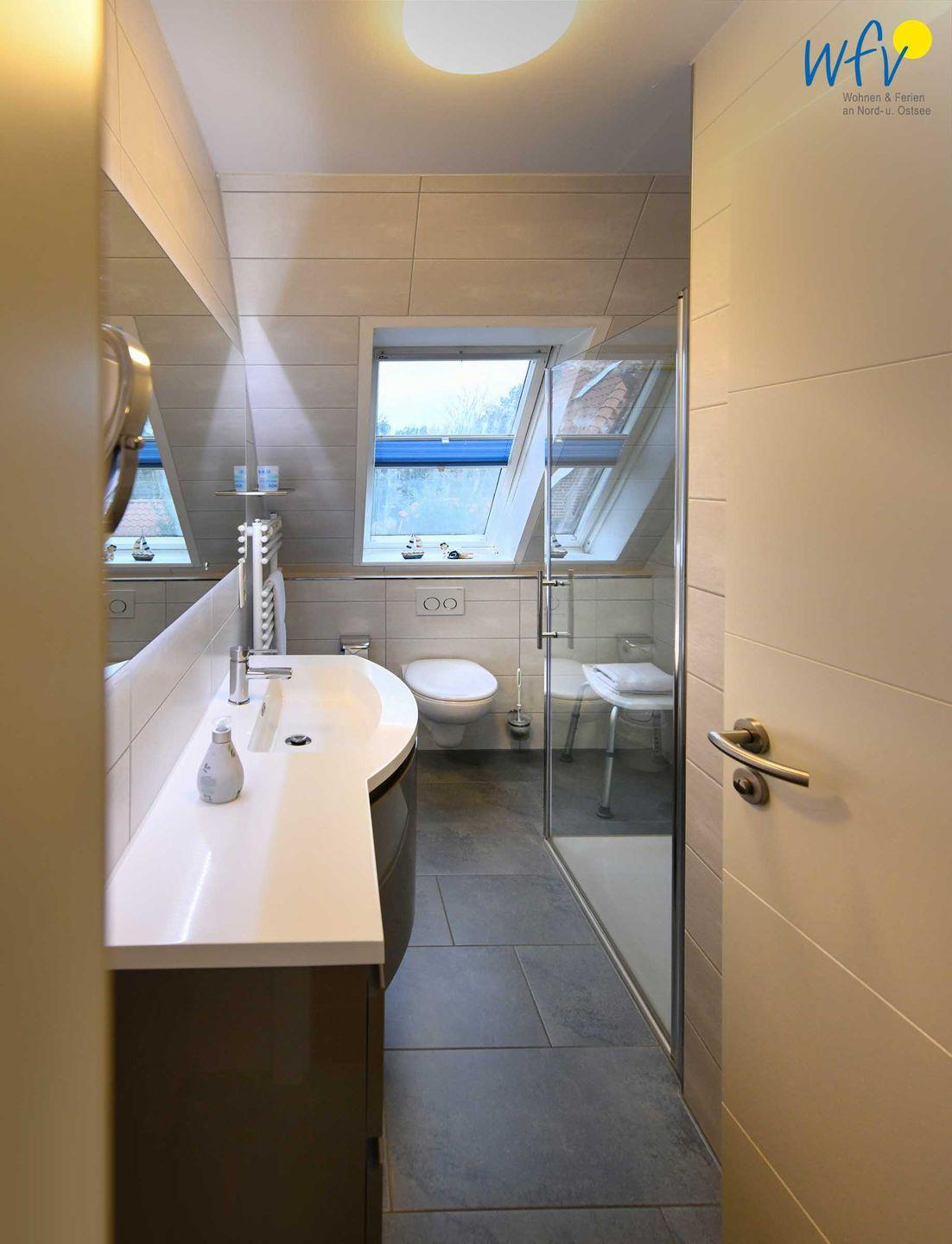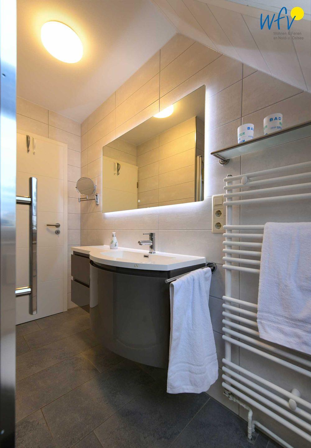 Weiterer Wohnkomfort erwartet Sie in dem eleganten Tageslichtbad mit ebenerdiger Dusche, breitem Waschtisch, Spiegel und Kosmetikspiegel sowie Handtuchheizung und Föhn.