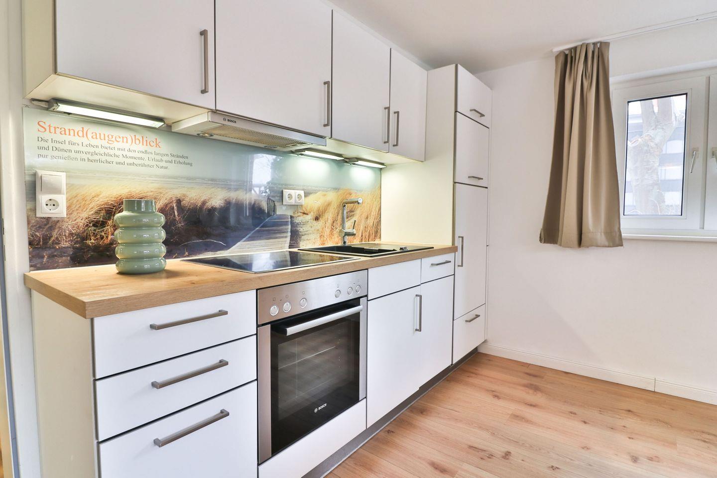 Die separate Küche mit eigenem Essplatz ist vollständig ausgestattet und macht die Selbstversorgung besonders angenehm. Ihnen stehen unter anderem ein 4-Platten-Herd, Backofen, Mikrowelle, Geschirrspülmaschine, Kühlschrank mit Gefrierfach sowie Kaffeemaschine, Wasserkocher, Toaster, Eierkocher, Mixer und umfangreiche Küchenutensilien zur Verfügung. Der große Esstisch bietet Raum für gemeinsame Mahlzeiten, Spieleabende oder die Planung des nächsten Inseltages.