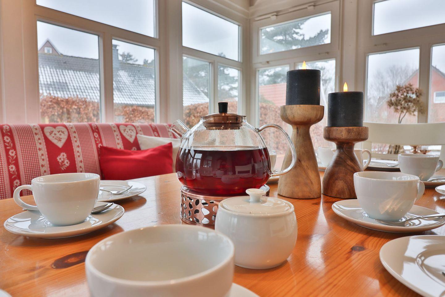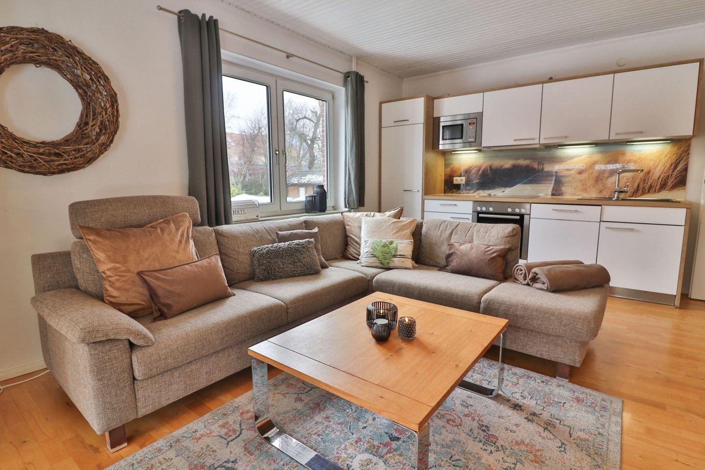 Das Herzstück der Wohnung ist der offen gestaltete Wohnbereich mit hellem Wintergarten. Der freundliche Essbereich mit großem Esstisch ist perfekt für gemeinsame Mahlzeiten, lange Gespräche und gesellige Abende. Über zwei Stufen erreichen Sie das gemütliche Wohnzimmer mit Sofaecke, in dem Kochen, Essen und Entspannen harmonisch ineinander übergehen. Fernseher und kostenfreies WLAN sorgen für Unterhaltung, während eine Auswahl an Gesellschaftsspielen auch bei nordischem Schietwetter für schöne gemeinsame Stunden sorgt.