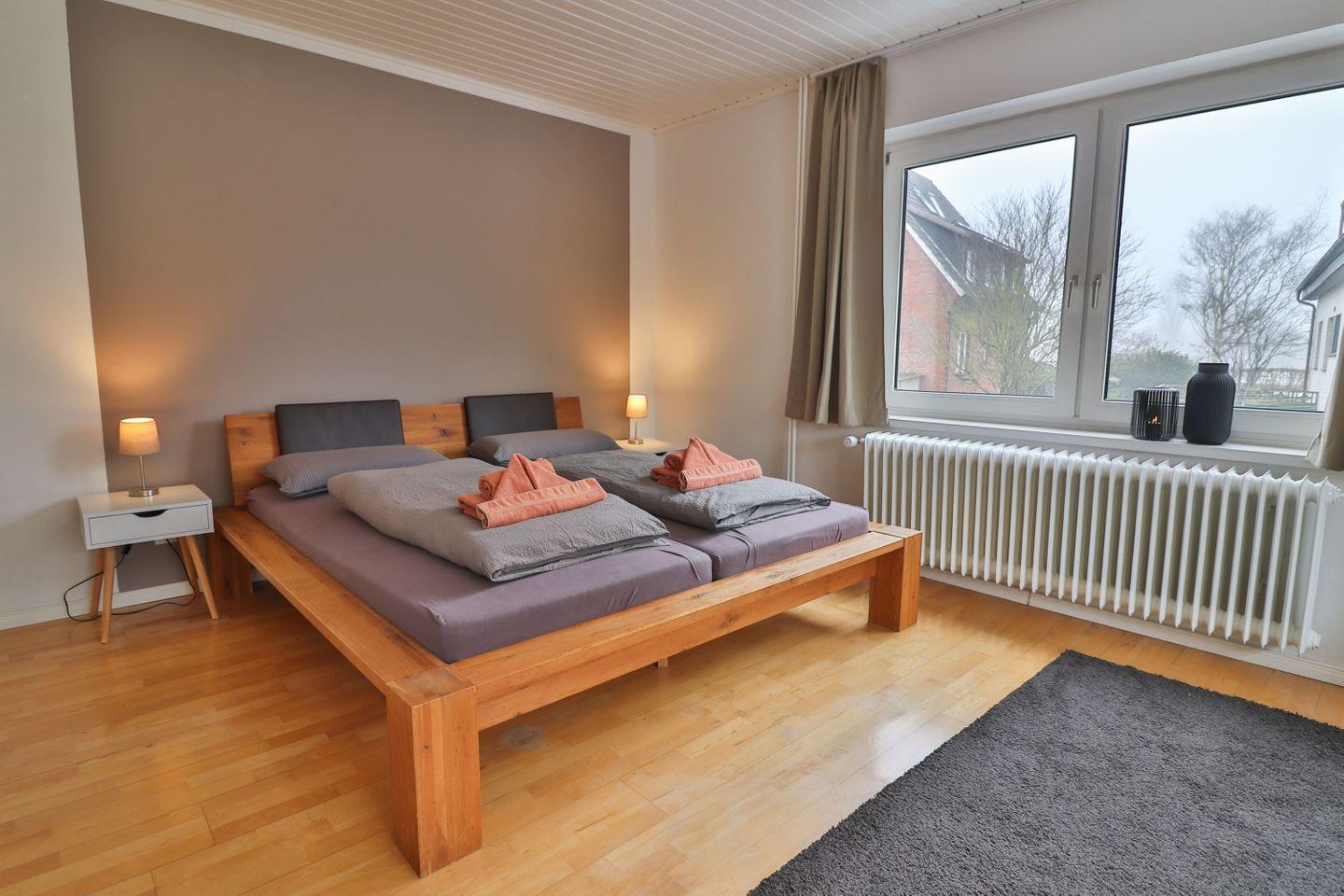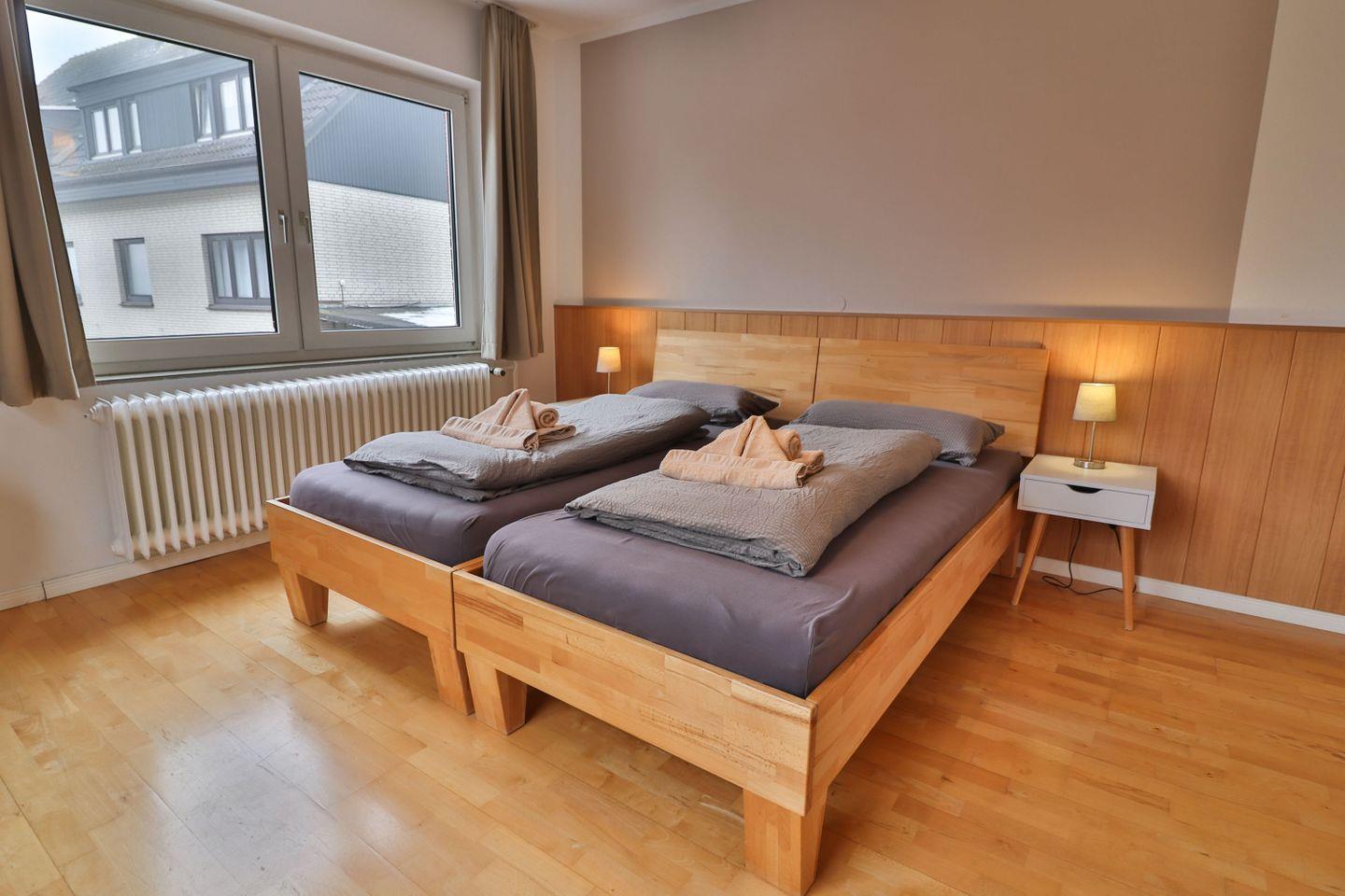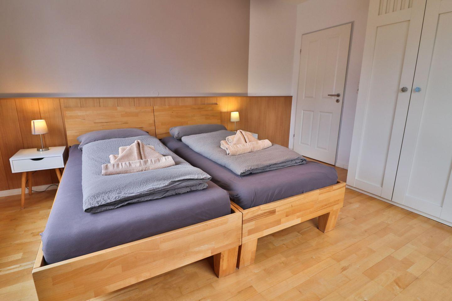 Die Wohnung verfügt über drei komfortable Schlafzimmer mit Doppelbetten (je ca. 180 x 200 cm) und Kleiderschränken. Im größten Schlafzimmer erwarten Sie zusätzlich ein zweiter Fernseher, zwei gemütliche Sessel und ein Schreibtisch – ideal für ruhige Momente oder zum Zurückziehen.