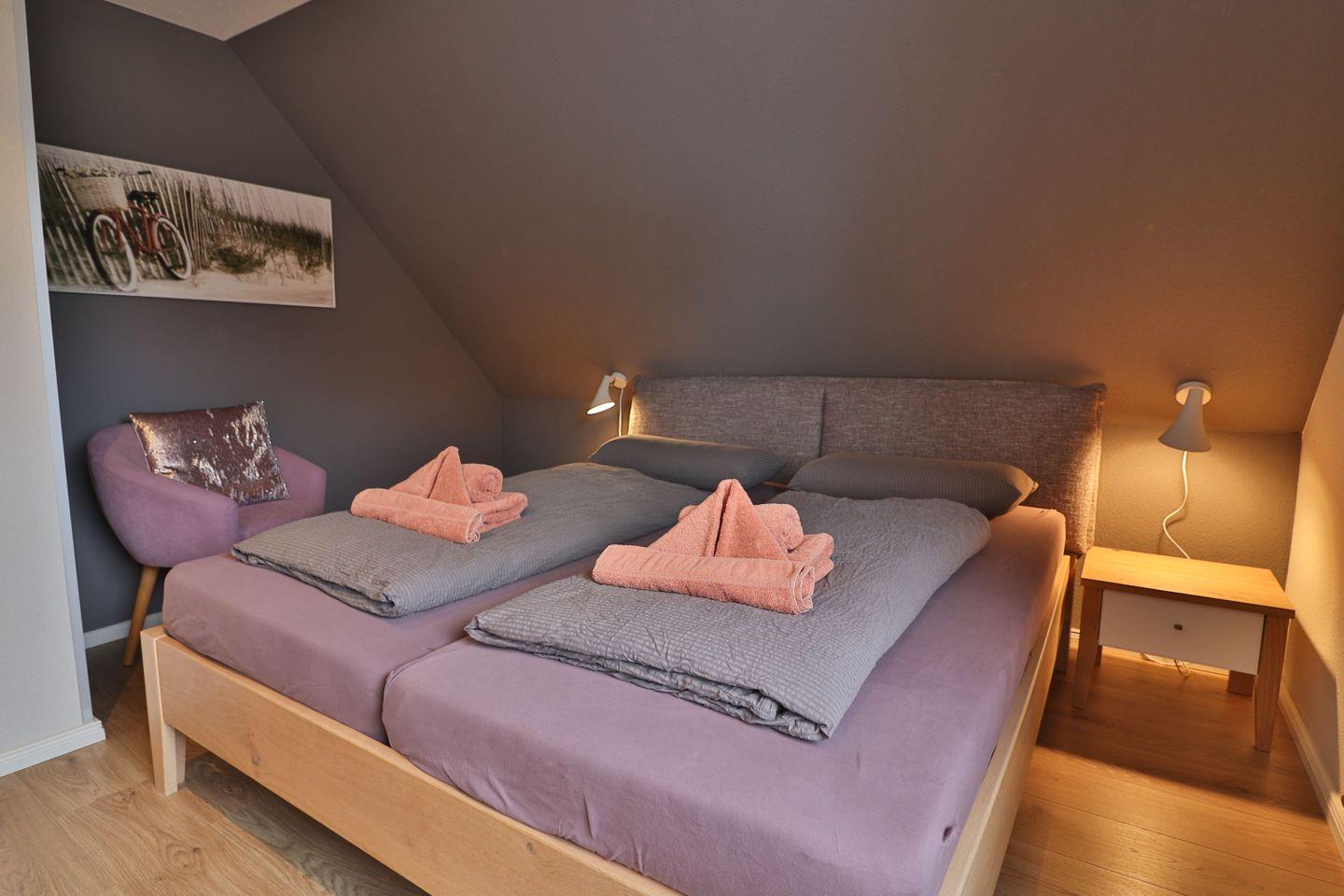 Im Schlafzimmer genießen Sie erholsame Nächte in einem komfortablen Doppelbett (180 x 200 cm). Ein Sessel lädt zum kurzen Innehalten ein, während ein Kleiderschrank ausreichend Stauraum für Ihre Urlaubsgarderobe bietet.
