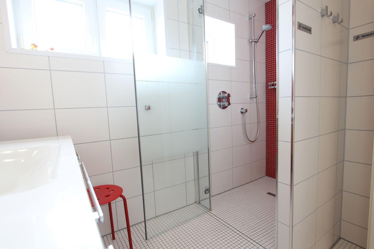 Das Tageslichtbadezimmer verfügt über eine Dusche, Waschtisch sowie einen Föhn. Das WC ist separat.