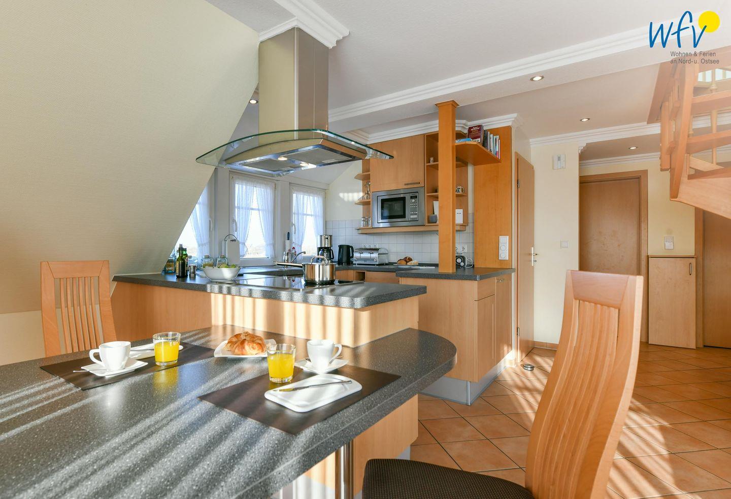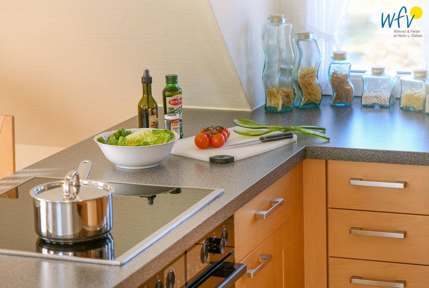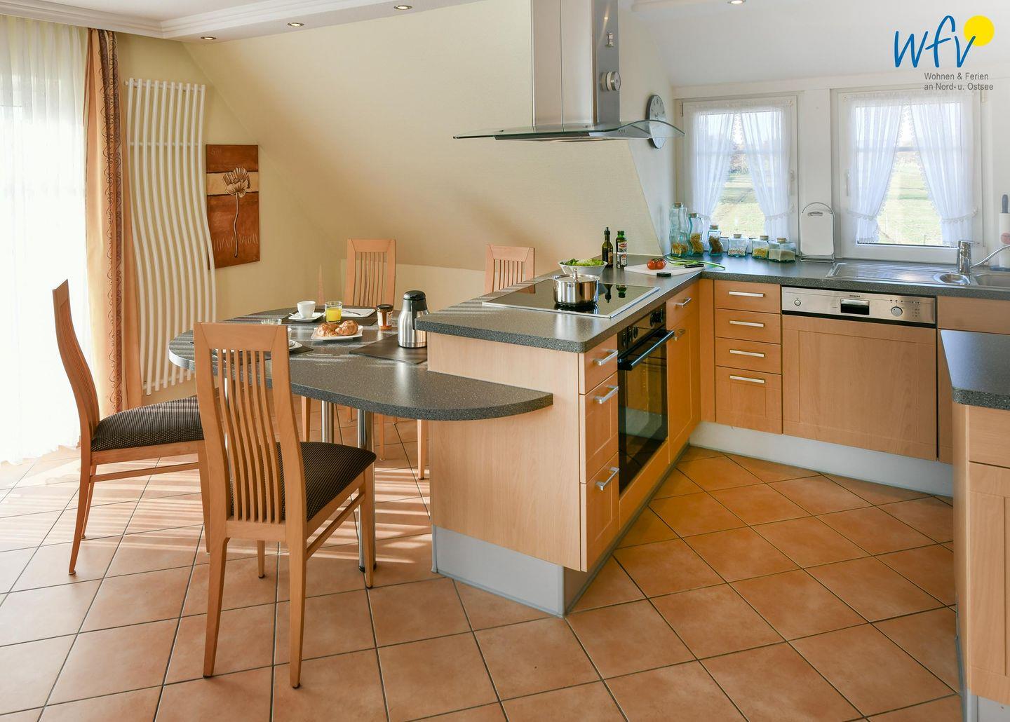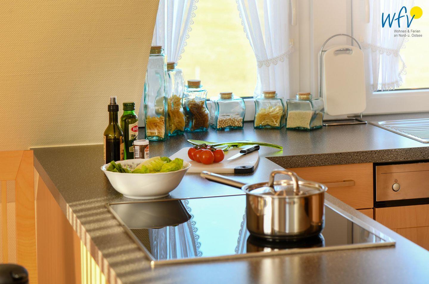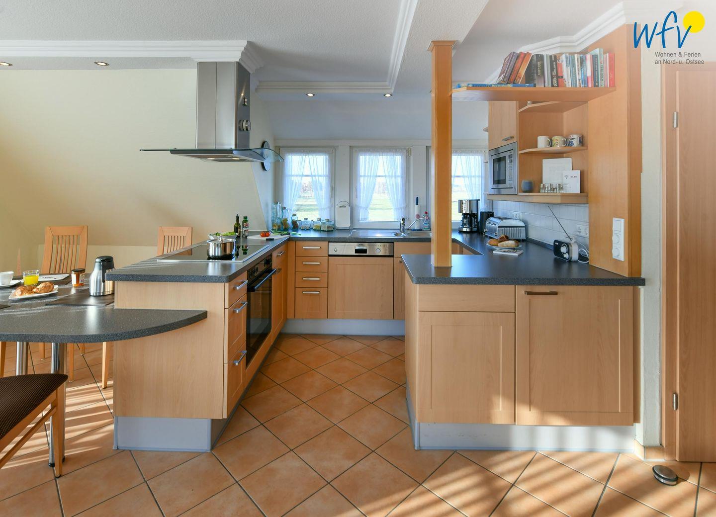 Das Ferienfrühstück, Snacks für den Ausflug oder das Dinner lassen sich bequem im modernen Küchenbereich zubereiten, der u.a. mit einem Induktionskochfeld, Backofen, Spülmaschine, Toaster, Mikrowelle, Spüle, Küchenschrank mit Eisfach und Kaffeemaschine ausgestattet ist. Ein Essbereich am breiten Küchentresen bietet Platz für den ersten Morgenkaffee oder ausgiebige Mahlzeiten.