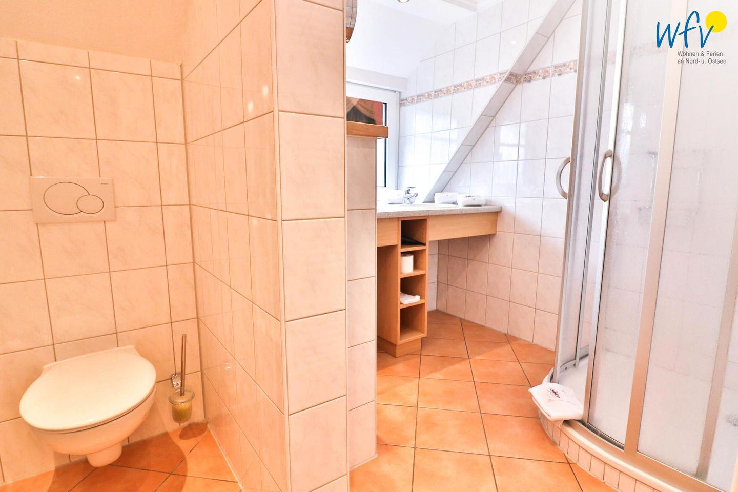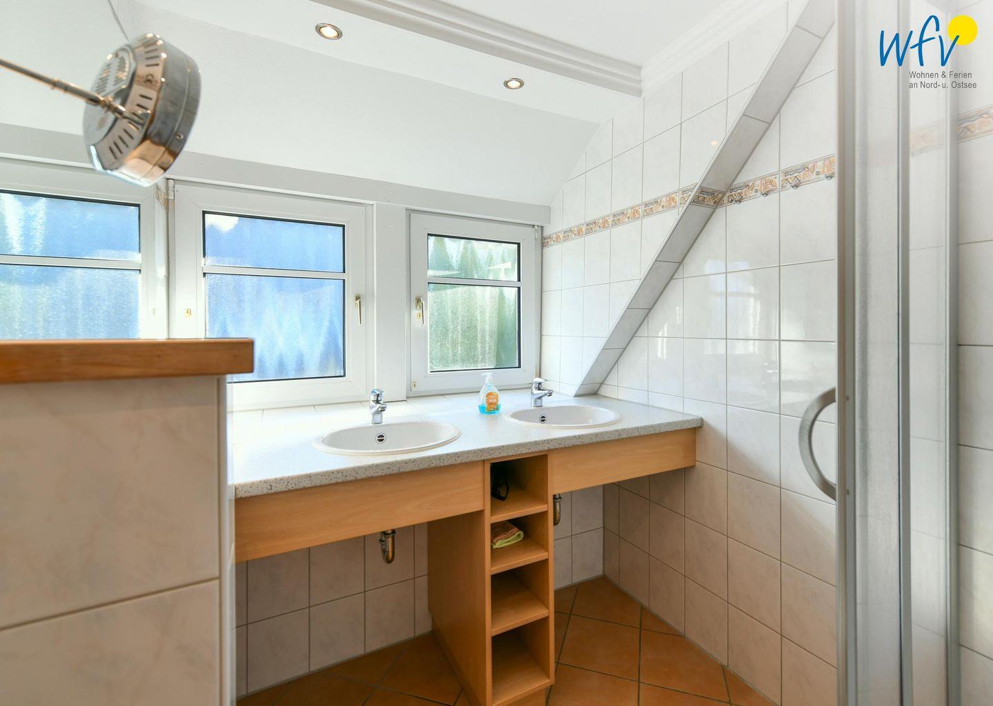 Ein großes modernes Tageslichtbad mit Dusche, zwei Waschbecken, WC, großem Spiegel, Schminkspiegel und Föhn sowie eine separate Gästetoilette sorgen für weiteren Wohnkomfort.