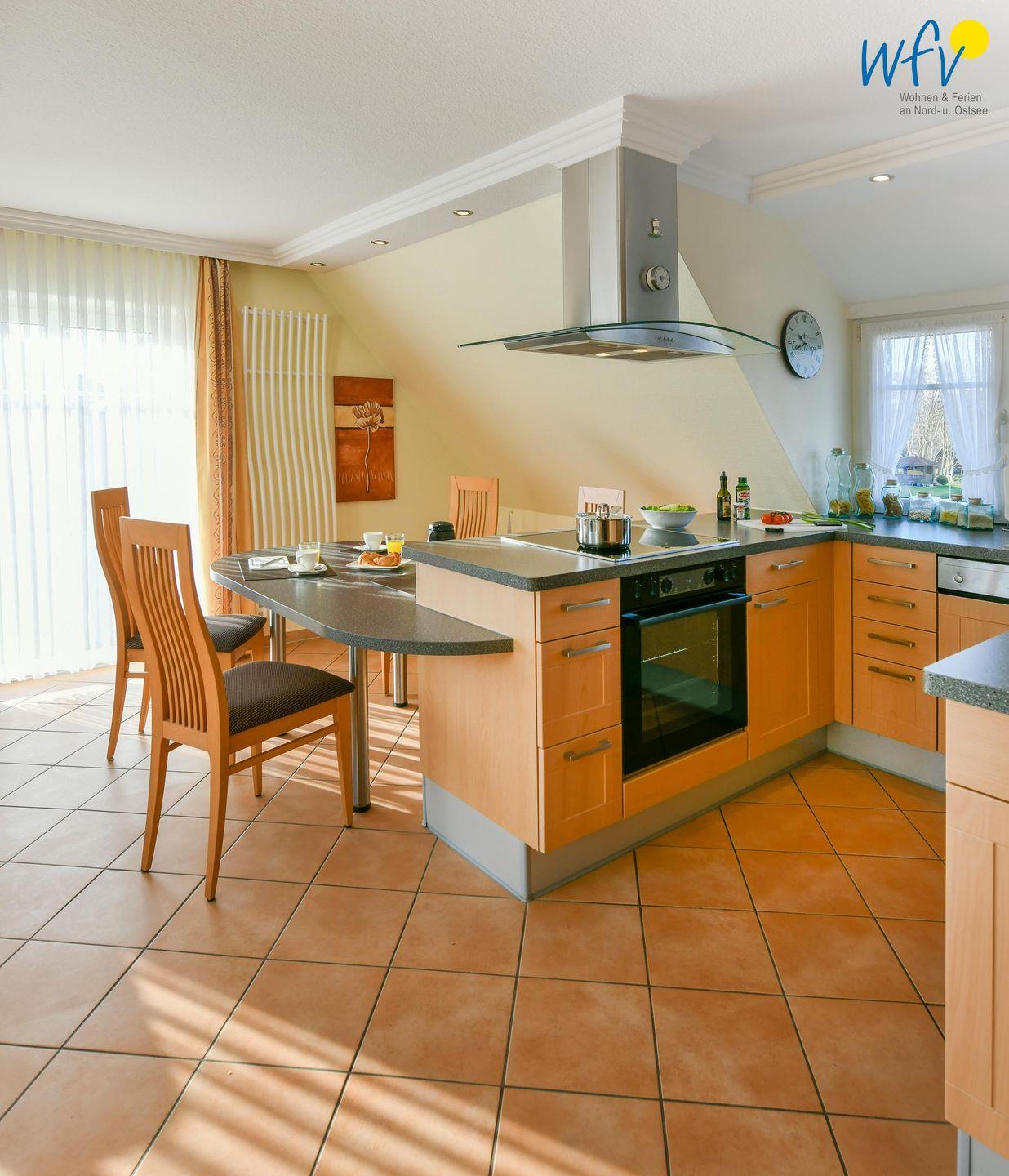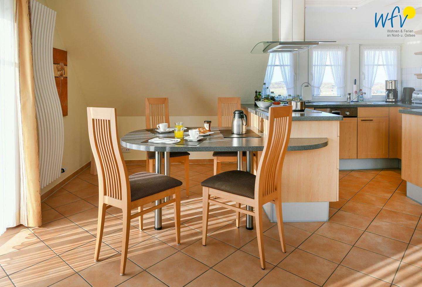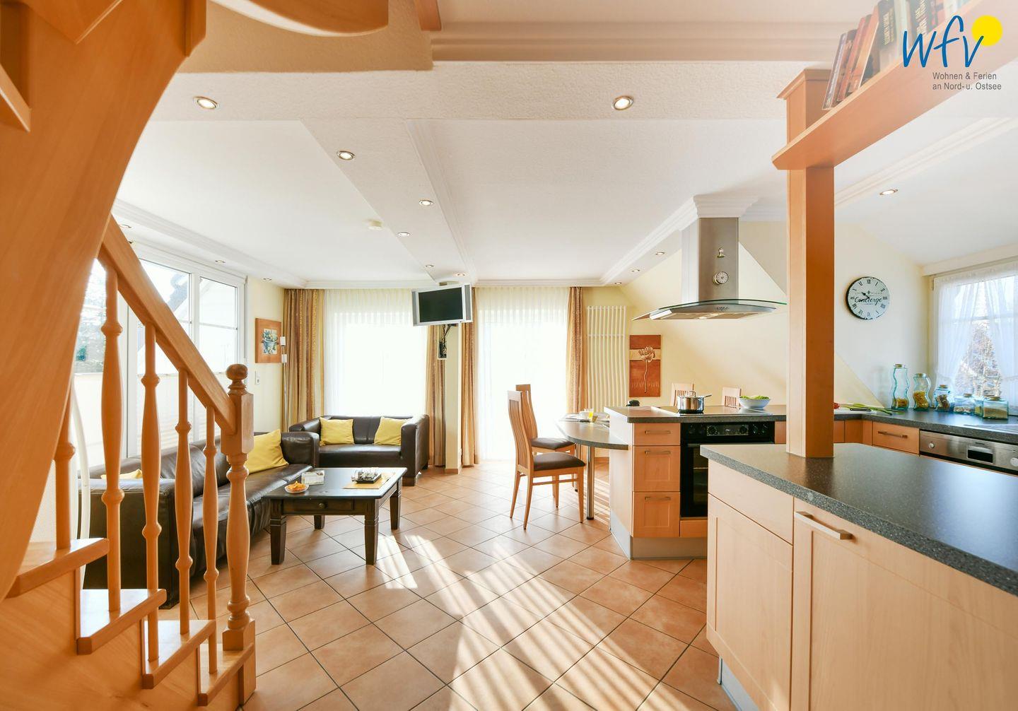 Nach der Fahrradtour oder dem Strandtag lädt der großzügige und offen gehaltene Wohn-/Essbereich zu gemütlichen Stunden mit der Familie ein. Hier können Sie wunderbar gemeinsam kochen, klönen oder fernsehen.