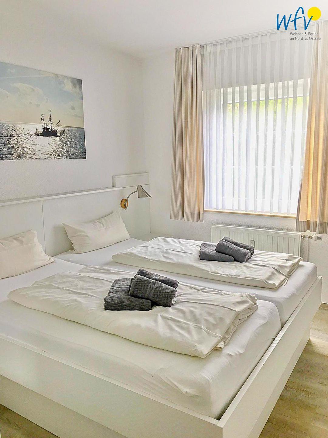 Für eine angenehme Nachtruhe ist das separate Schlafzimmer mit einem Doppelbett (180 x 200 cm) ausgestattet. Im Kleiderschrank lässt sich bequem Ihre Urlaubsgarderobe verstauen. Ein weiterer Schlafplatz besteht durch das Komfort-Schlafsofa im Wohnraum (140 x 200 cm). Im Schlafzimmer ist leider kein Stellplatz für ein Kinderbett vorhanden. Gerne können Sie mit Baby/Kleinkind anreisen und zusammen im Elternbett schlafen.