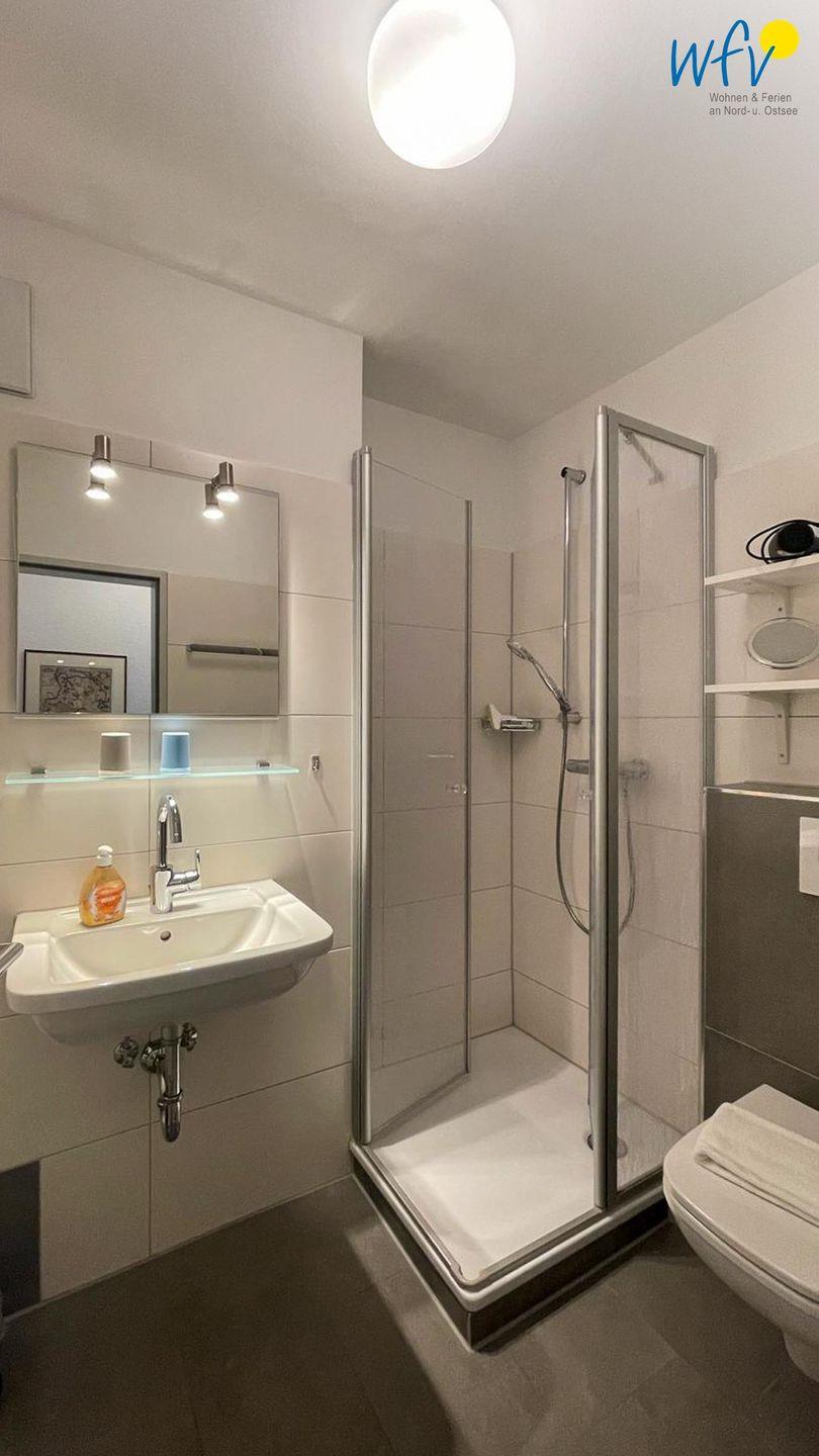Wohnkomfort bietet Ihnen auch das moderne Badezimmer mit Dusche, Waschbecken, WC und beleuchtetem Spiegel.
