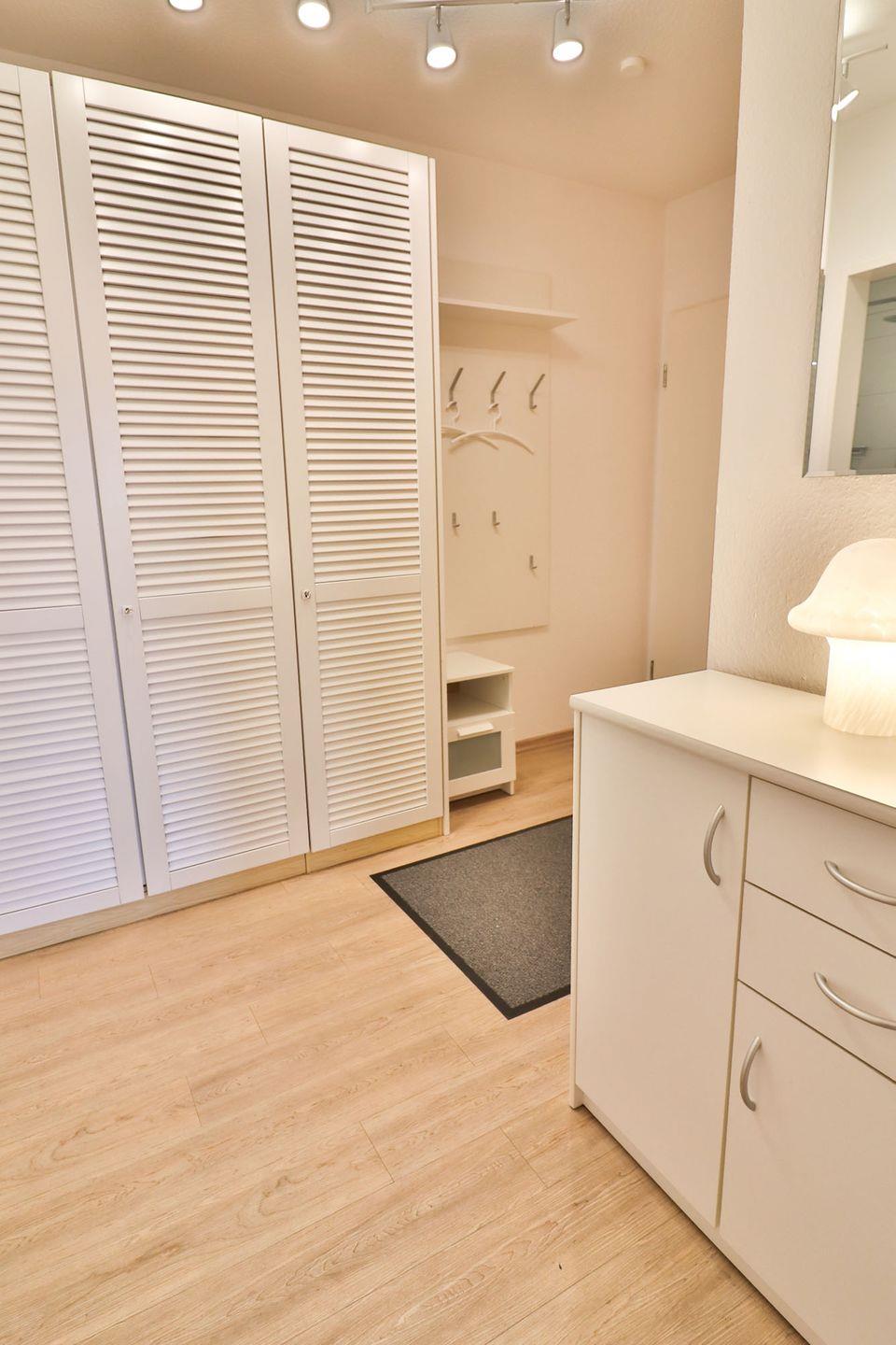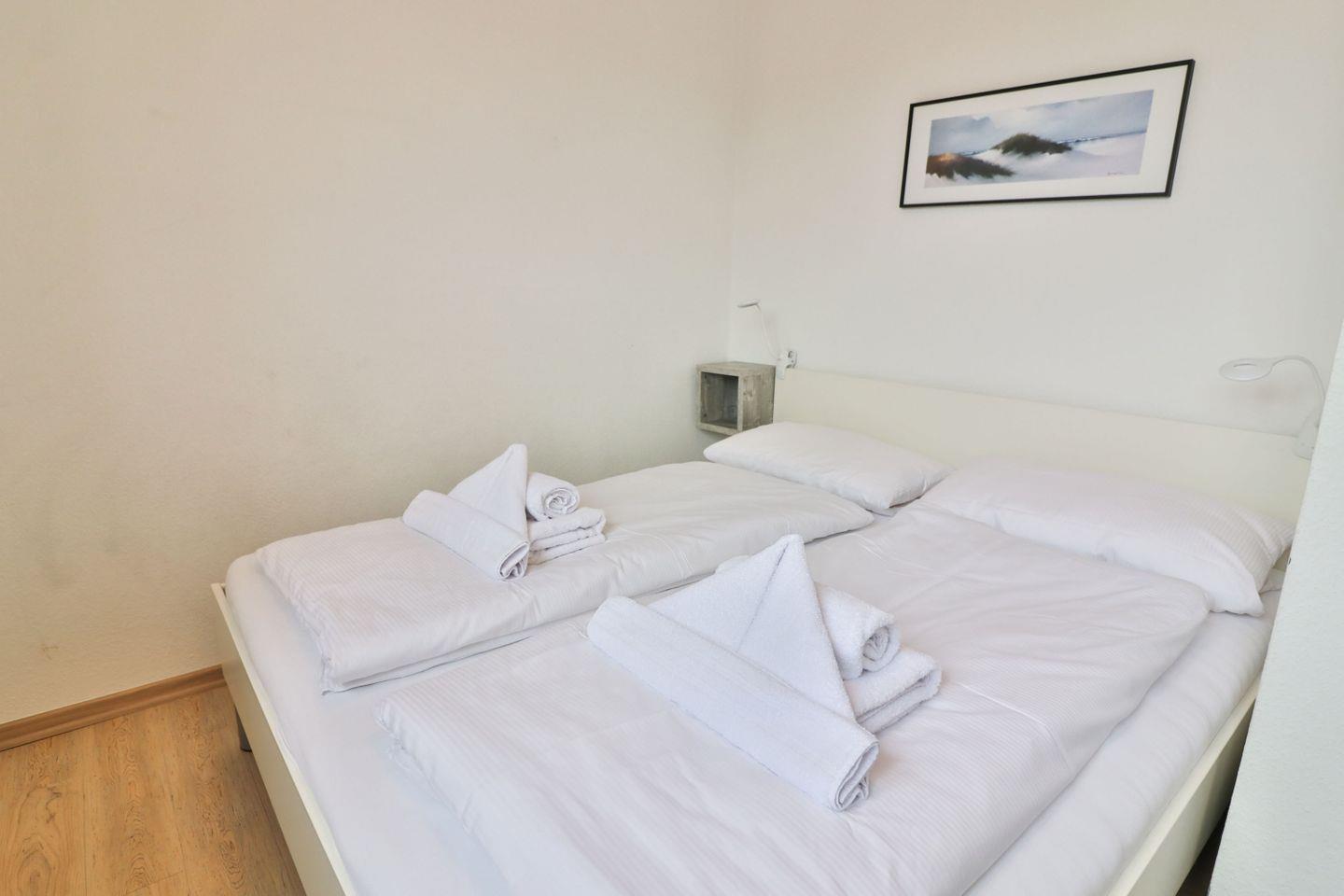 Das Schlafzimmer ist mit einem bequemen Doppelbett mit den Maßen 160 x 190 cm möbliert. Einen großen Kleiderschrank für Ihre Habseligkeiten finden Sie im Flur der Wohnung.