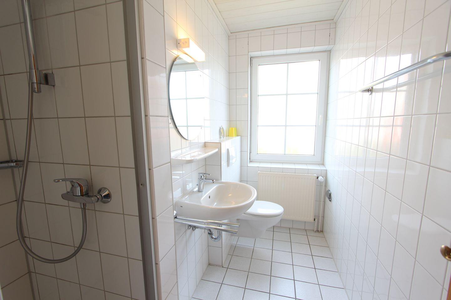 Tageslichtbad mit WC, Waschtisch, Dusche, Föhn.