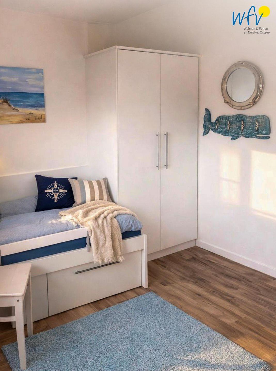 Eine Wendeltreppe führt zu den zwei separaten Schlafzimmern im Obergeschoss. Beide Zimmer sind mit einem komfortablen Doppelbett ausgestattet (180 x 200 cm) und Kleiderschränken für die Urlaubsgarderobe. Von einem Raum aus haben Sie einen traumhaften Blick in die Langeooger Dünenwelt, ebenso von dem angrenzenden möblierten Ost-Balkon - sogar das Meer hören Sie hier rauschen! Das andere Schlafzimmer liegt zur Gartenseite hin und verspricht ebenfalls eine angenehme Nachtruhe. Hier befindet sich neben dem Doppelbett ein eingebautes Kinderbett (160 x 80 cm) und ein kleiner Schreibtisch. Die Couch im Wohnzimmer kann zu einem komfortablen kleinen Doppelbett umfunktioniert werden und bietet eine weitere Schlafmöglichkeit (160 x 200 cm).