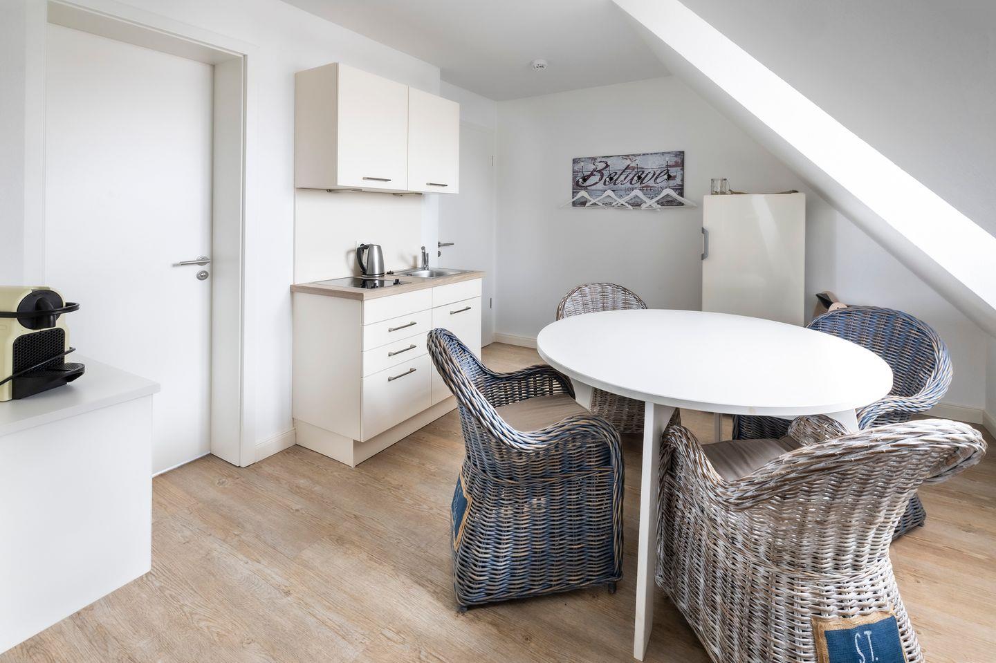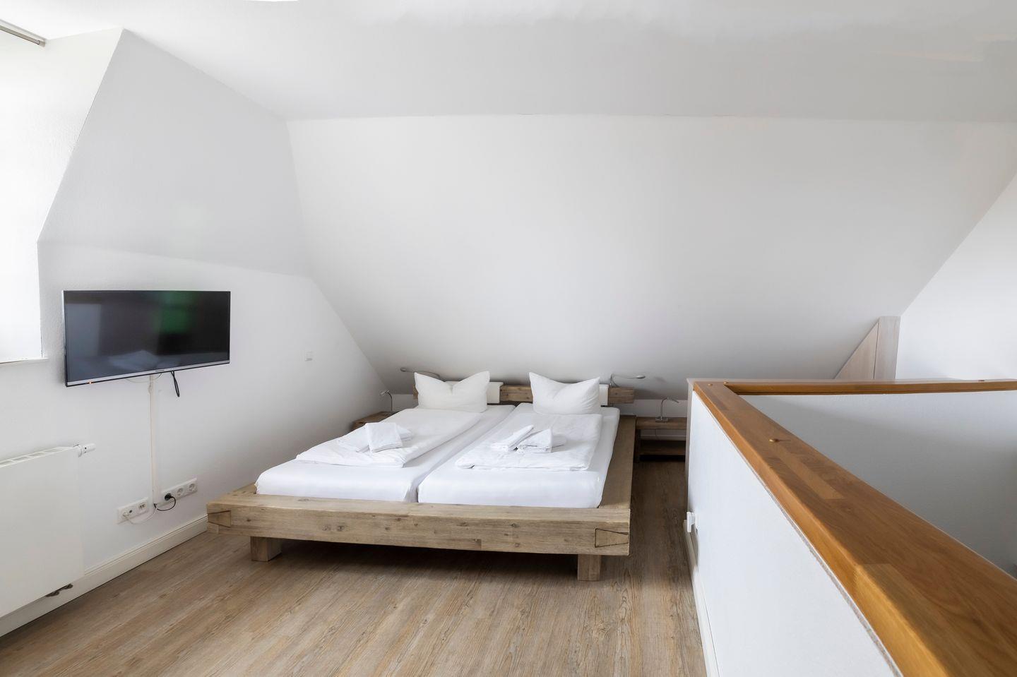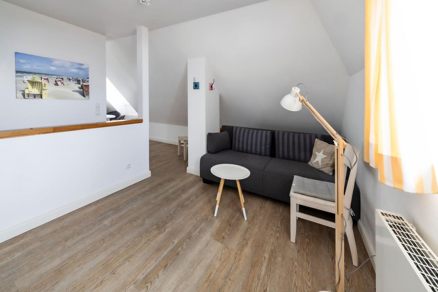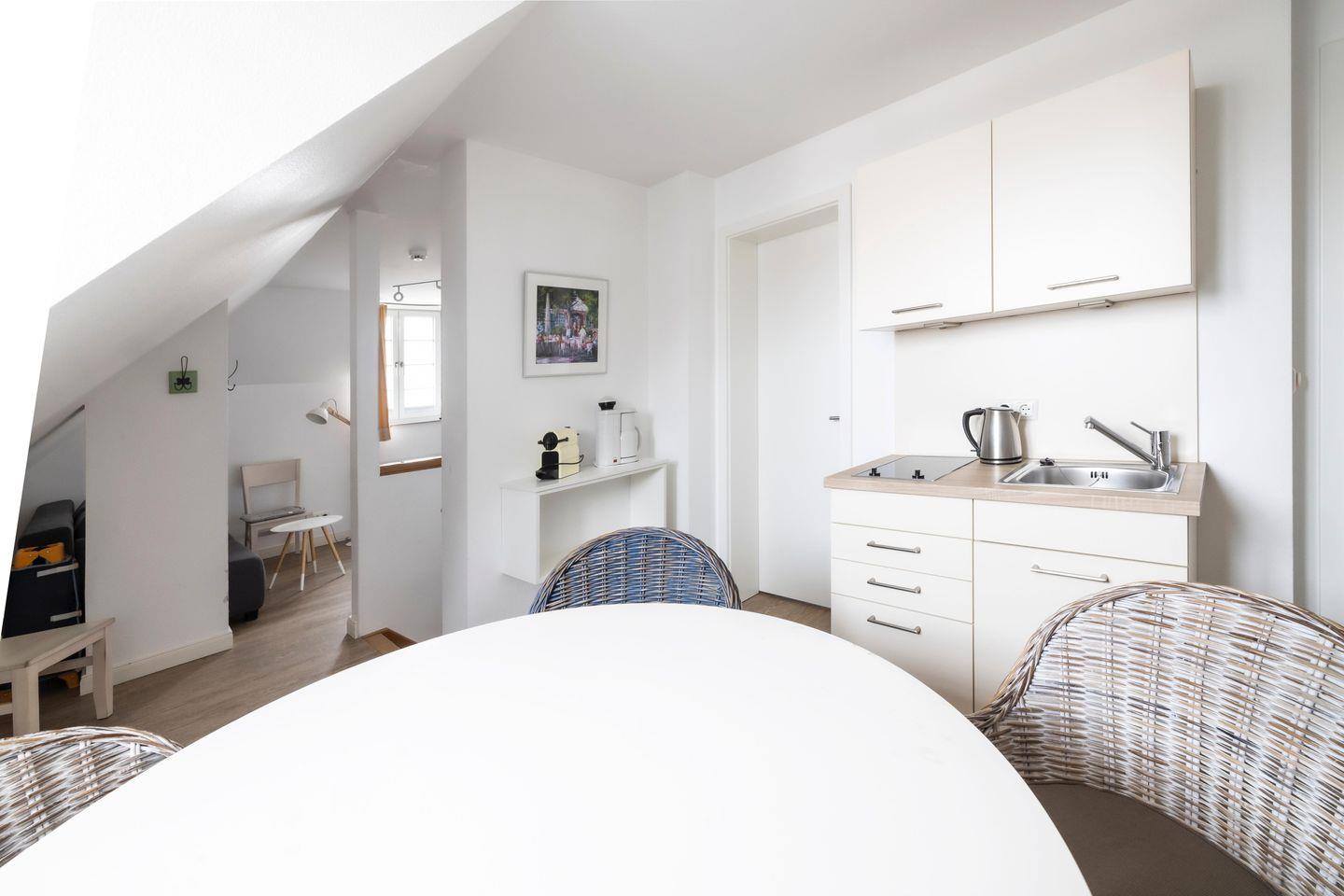 Das Highlight dieser Wohnung ist der unabhängig bewohnbare Bereich im Dachgeschoss mit Badezimmer inkl. Dusch-Badewannenkombination und kleiner Pantry-Küchenzeile mit 2-Platten-Herd und Kühlschrank. Auch ein Esstisch ist hier vorhanden. In diesem kuscheligen Einraum-Apartment finden bis zu vier Personen Platz für erholsamen Urlaubsschlaf in einem bequemen Doppelbett (180 x 200 cm) und auf einer Schlafcouch (160 x 200 cm). Auch ein Fernseher ist hier vorhanden. Eine Glastür trennt die obere und untere Wohnung voneinander.
