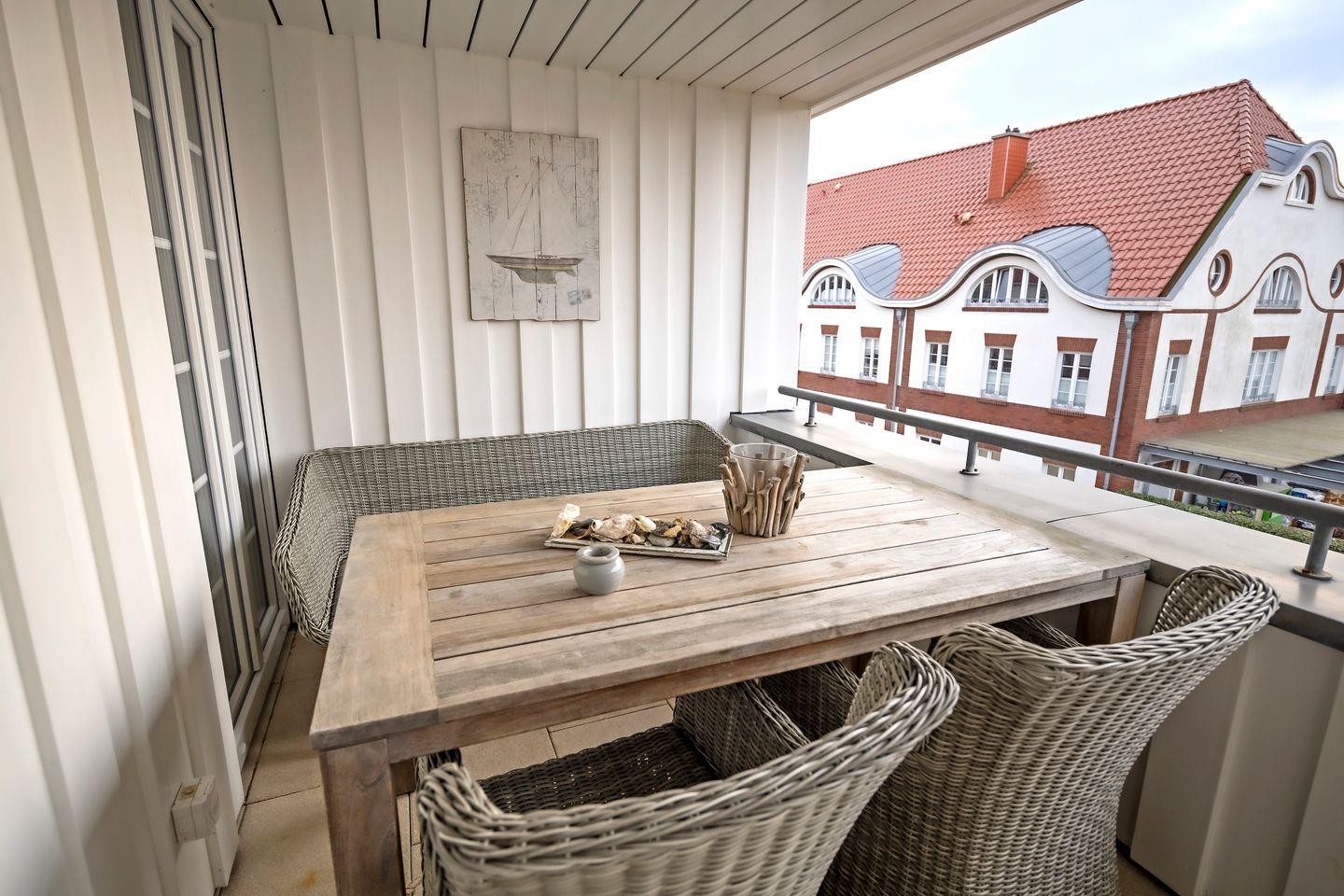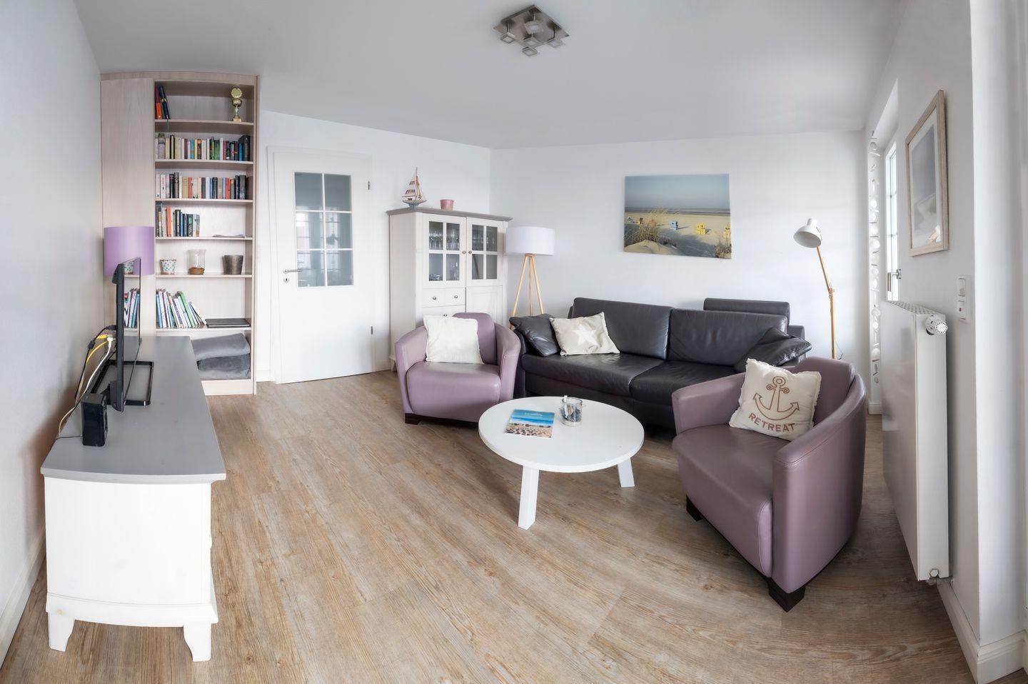Auf der unteren Ebene ist der Wohnbereich mit der Küche verbunden und bietet viele Unterhaltungsmöglichkeiten an grauen Inseltagen. Eine Heimkino-Anlage, Blu-ray- und DVD-Spieler, DVDs, zahlreiche Bücher, Spiele und eine Wii-Spielekonsole samt einigen Spielen stehen Ihnen zur Verfügung. Kostenfreies WLAN sorgt für eine gute Vernetzung. Für Erholung und gemeinsame Zeit stehen ein gemütliches Sofa und zwei Sessel bereit. Der möblierte, überdachte Balkon erweitert Ihren Wohnraum nach draußen, sodass Sie jederzeit die Möglichkeit haben, ein wenig Inselluft zu schnuppern.