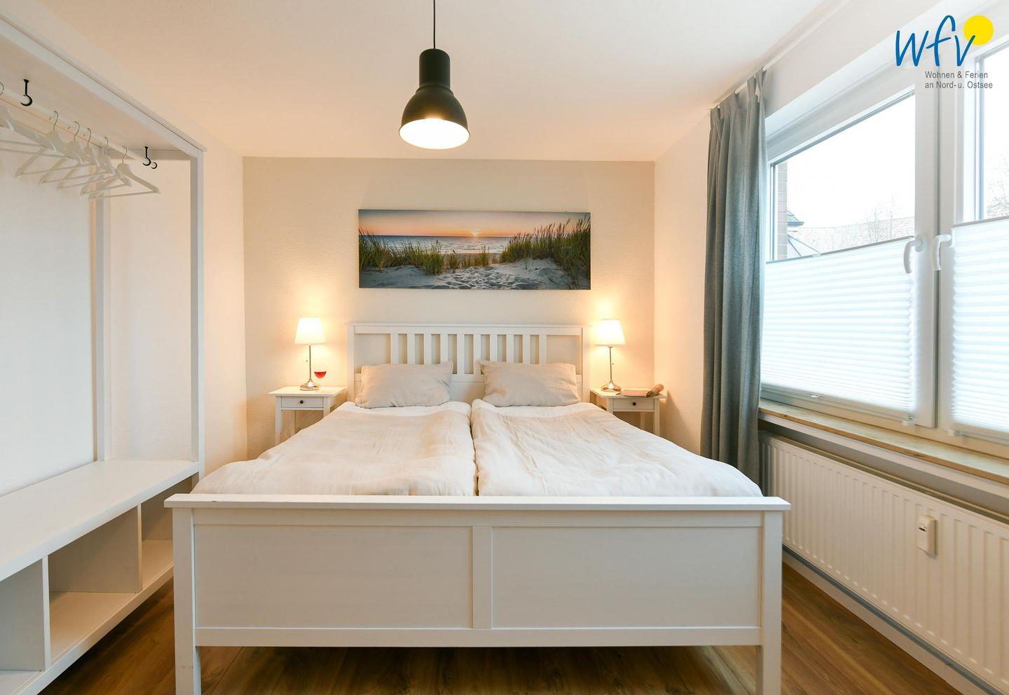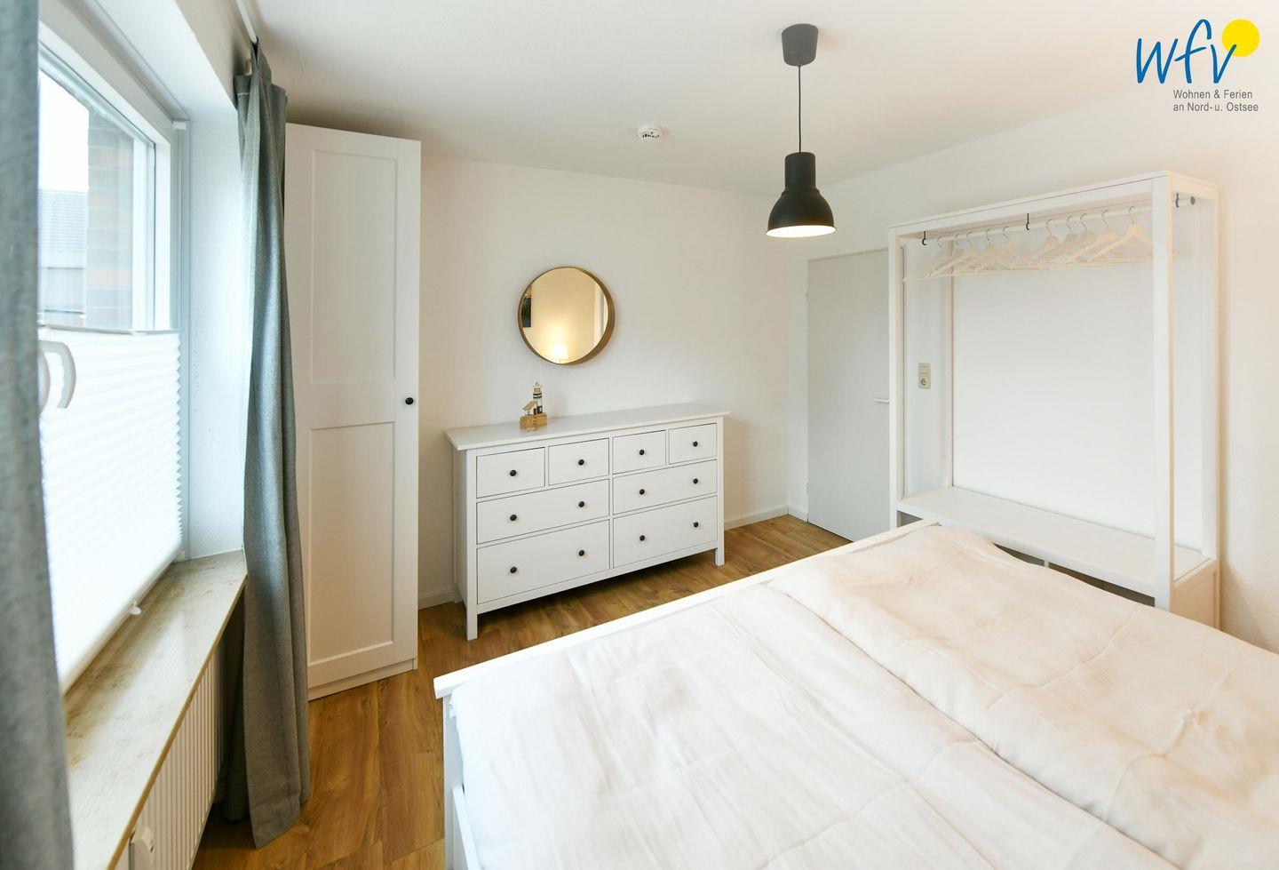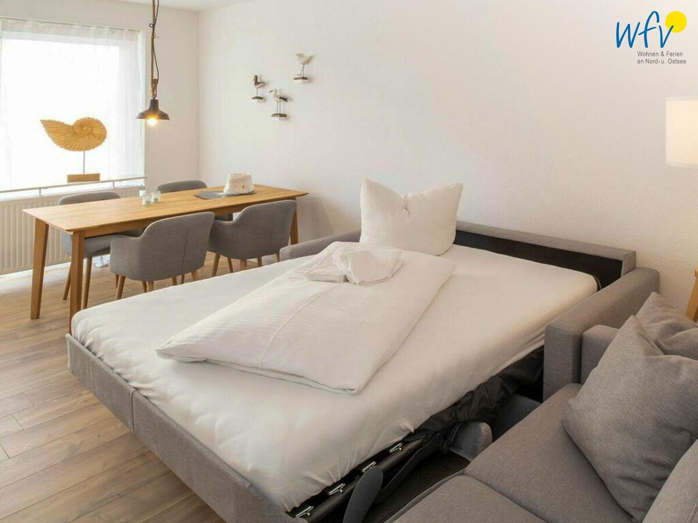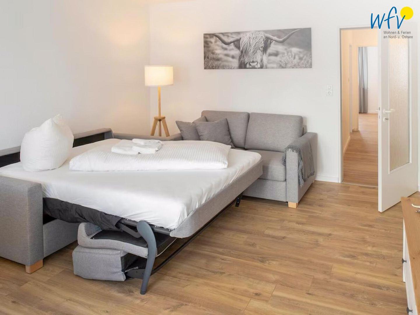 Das freundlich eingerichtete separate Schlafzimmer mit schönem Gartenblick bietet einen ruhigen Rückzugsort. Ausgestattet ist es mit einem komfortablem Doppelbett (180 x 200 cm). Die Couch im Wohnraum lässt sich schnell und einfach zu einem Bett umfunktionieren und bietet Schlafmöglichkeiten für eine weitere Person.