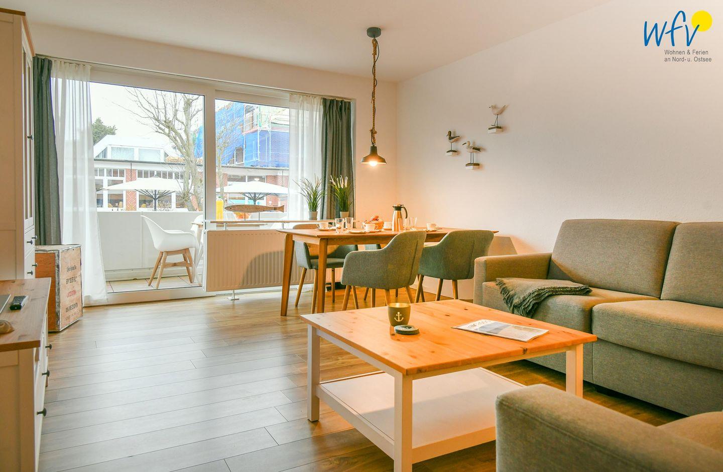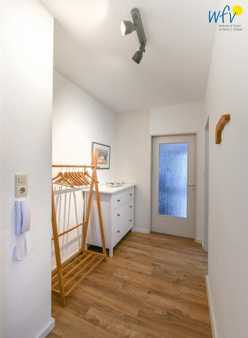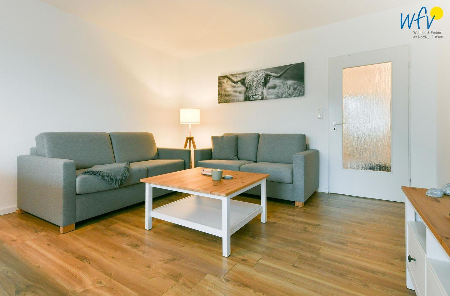 Es empfängt Sie ein geräumiger Flur mit Garderobe, der in ein helles Wohnzimmer mit Sofaecke und Essbereich führt. Hier können Sie nach dem Strandtag oder der Fahrradtour ruhige Stunden verbringen - fernsehen und lesen oder beisammen sitzen, klönen und gemeinsame Mahlzeiten genießen.
