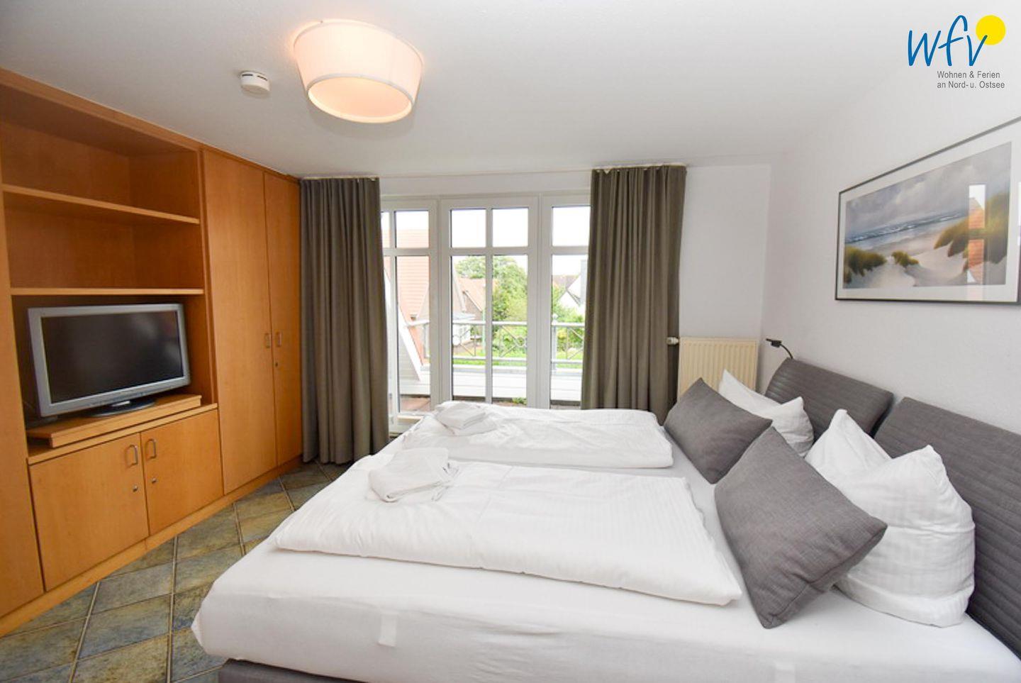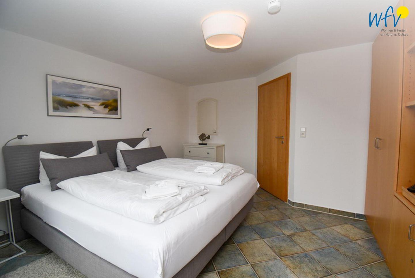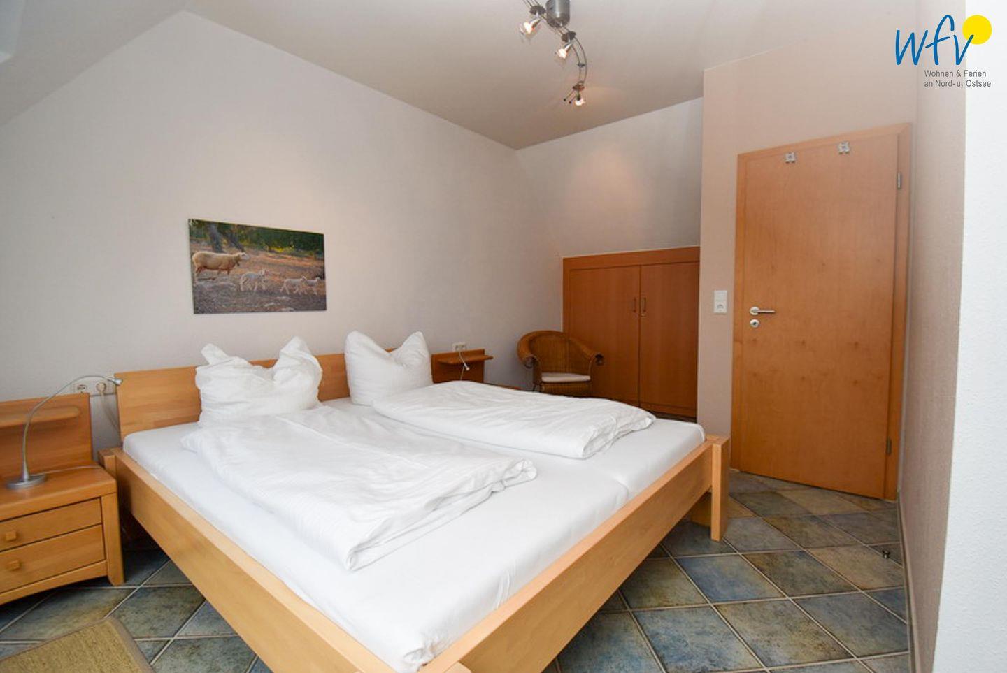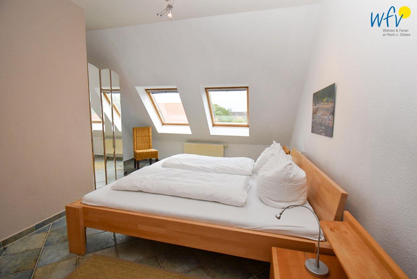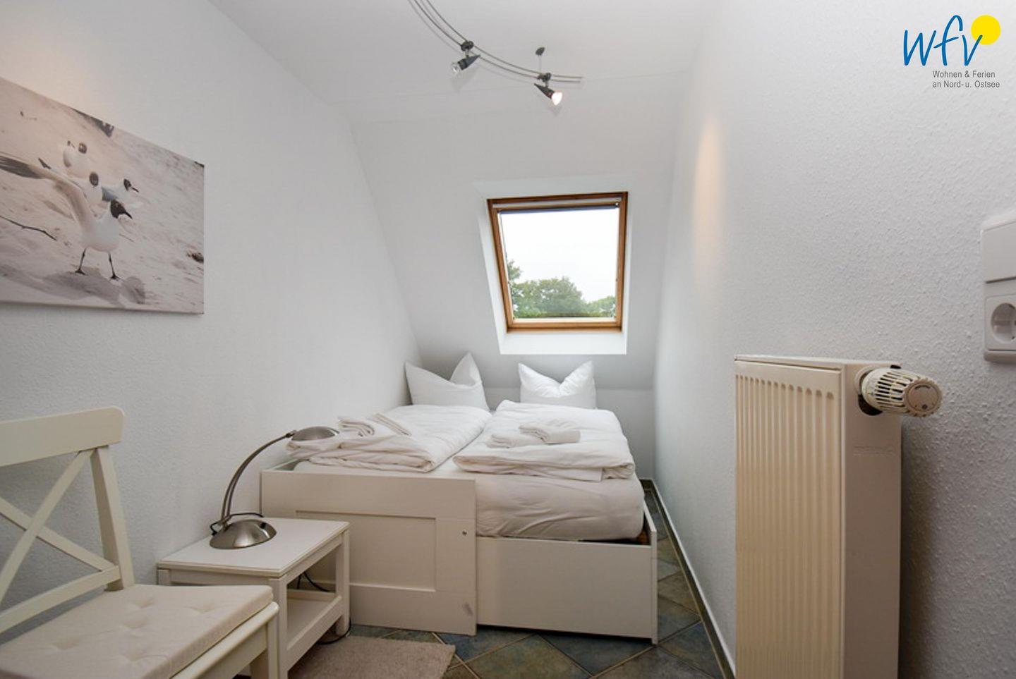 Das „Ferienhaus Inselrose" verfügt über drei helle und liebevoll eingerichtete Schlafzimmer, die Ihnen einen ruhigen Rückzugsort für erholsame Nächte bieten. Das Elternschlafzimmer im Obergeschoss ist mit einem komfortablen Doppelbett (180 x 200 cm), Kleiderschrank und TV ausgestattet und lädt mit seiner klaren, modernen Gestaltung zum Entspannen ein. Direkt nebenan befindet sich das Kinderschlafzimmer mit einem ausziehbaren Einzelbett (140 x 200 cm). Das dritte Schlafzimmer im Dachgeschoss verfügt ebenfalls über ein komfortables Doppelbett (180 x 200 cm) und einen Kleiderschrank für Ihre Urlaubsgarderobe.