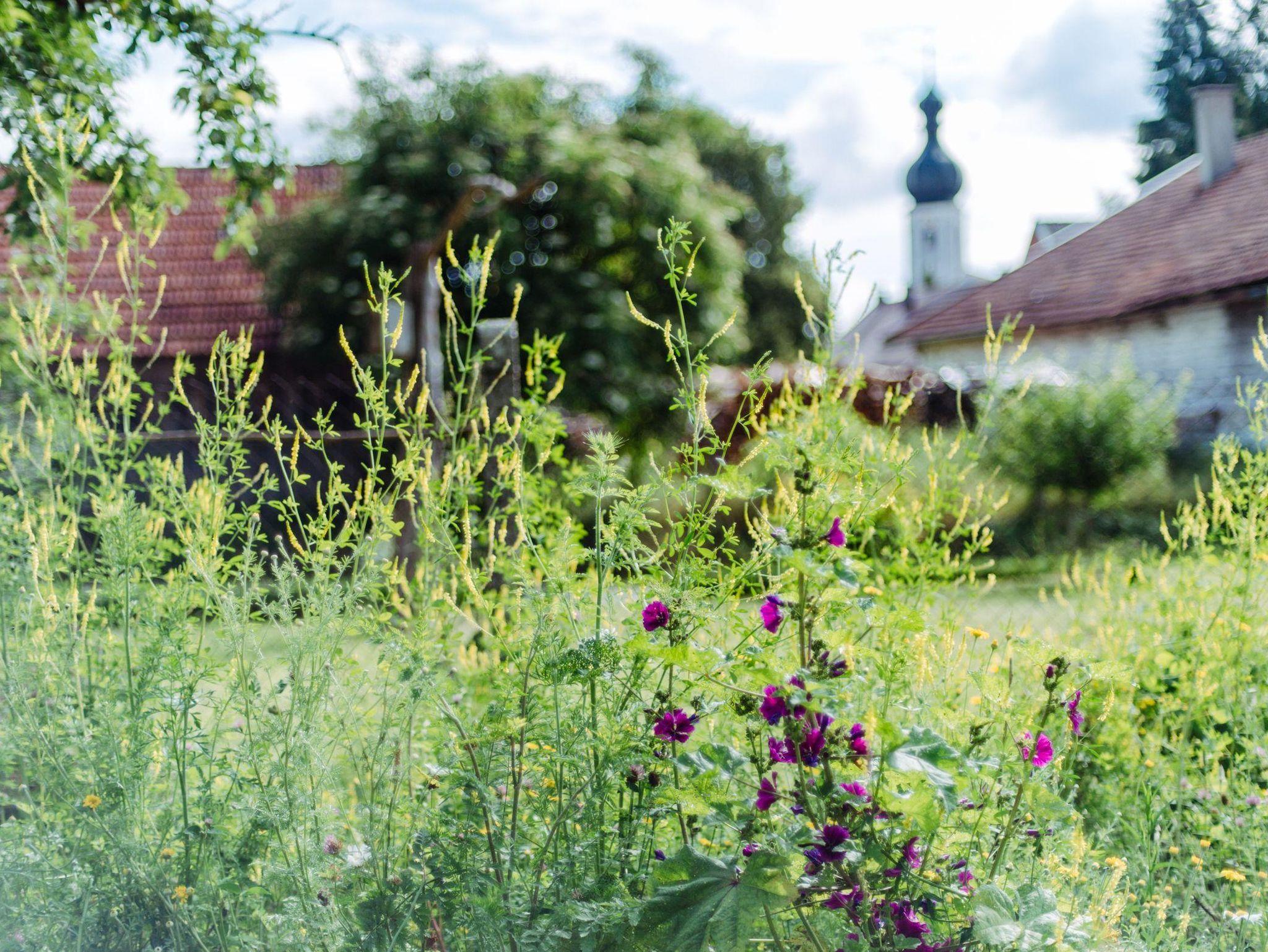– Blick auf den Kräuter- und Gemüsegarten und auf endlose Fluren und Wiesen