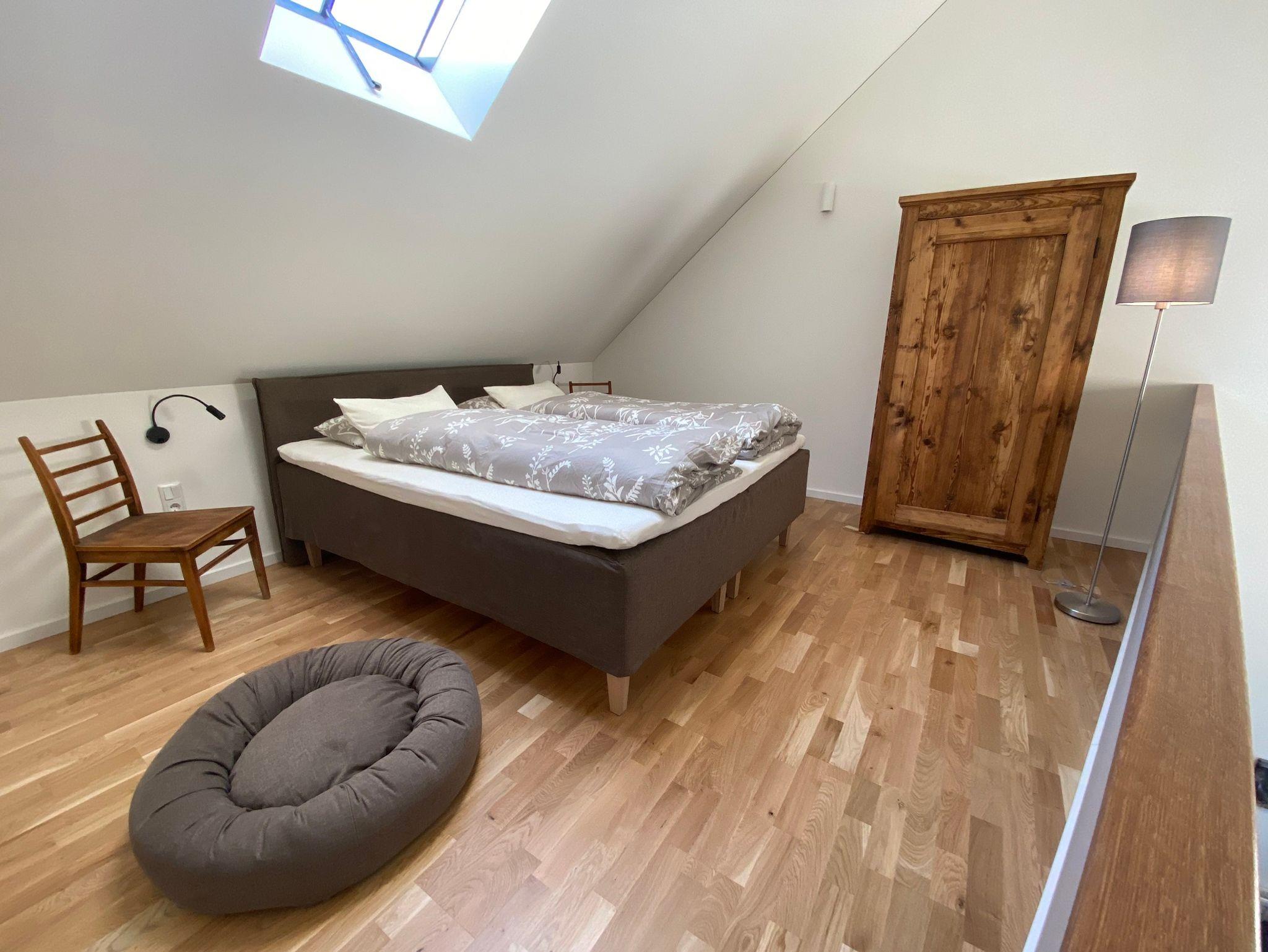 Auf der großen Schlafgalerie erwartet Sie ein King-Size Boxspringbett für 2 Personen (Fennobed).