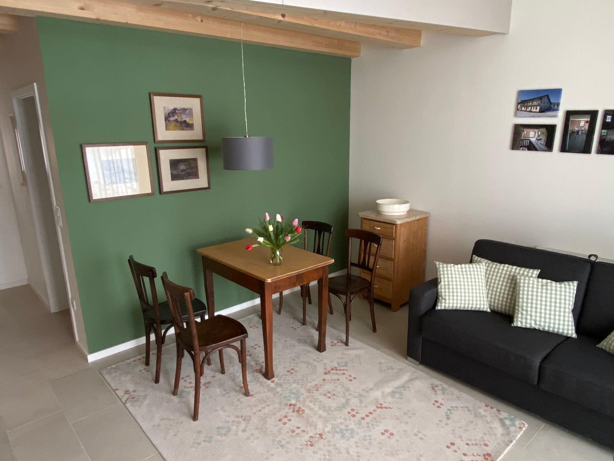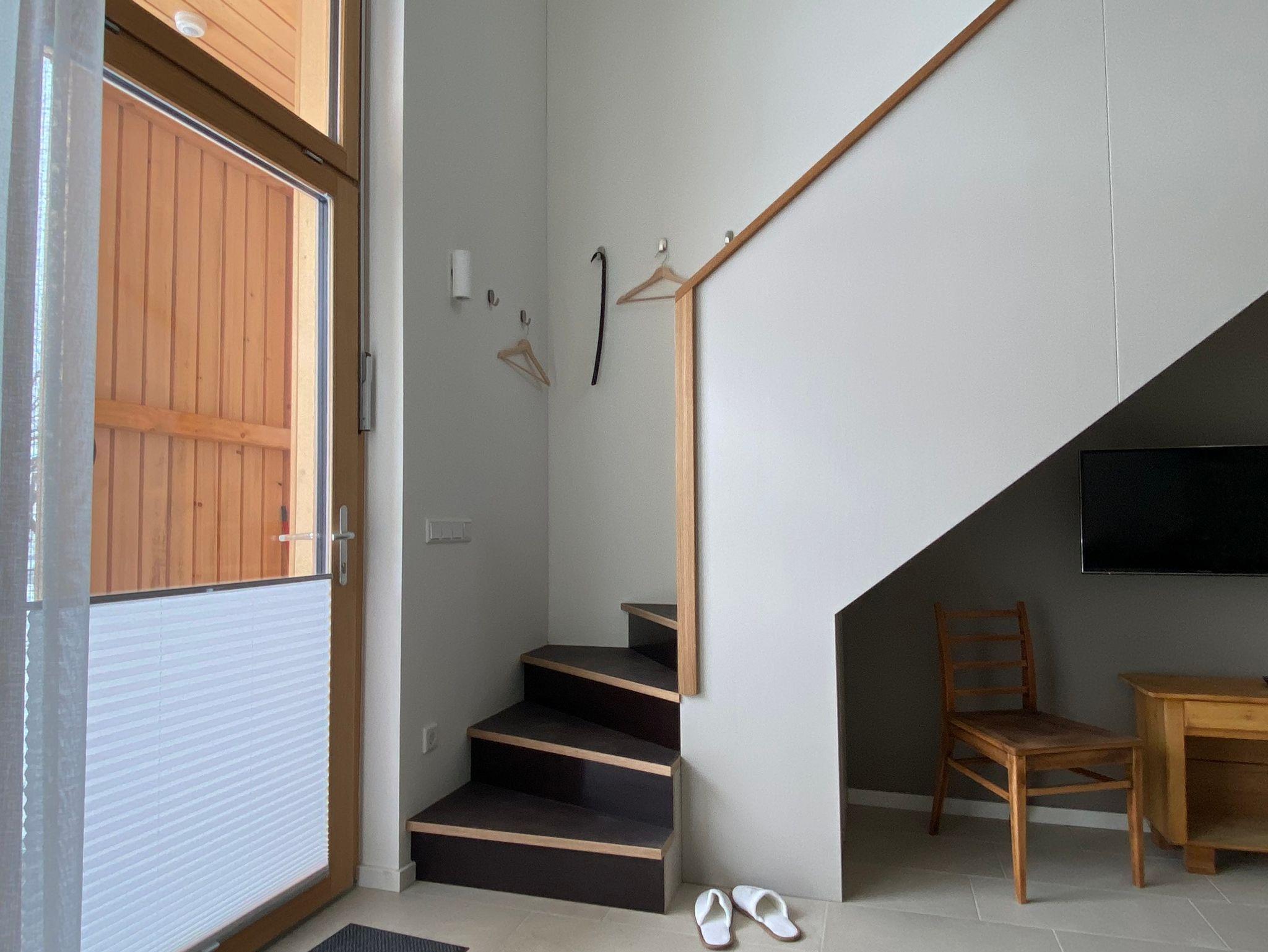 Die Ferienwohnung befindet sich in einem Holzneubau. Im Erdgeschoss befinden sich eine offene Küche, ein Esstisch mit 4 Stühlen, Sofa, Smart-TV und das Badezimmer mit WC und ebenerdiger Dusche.