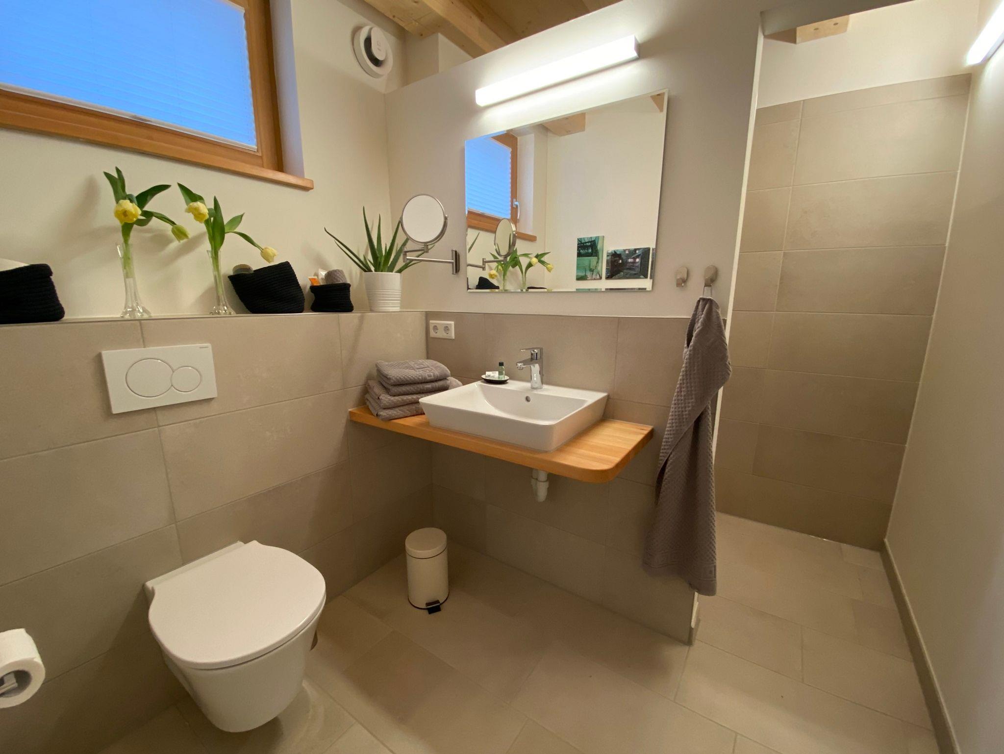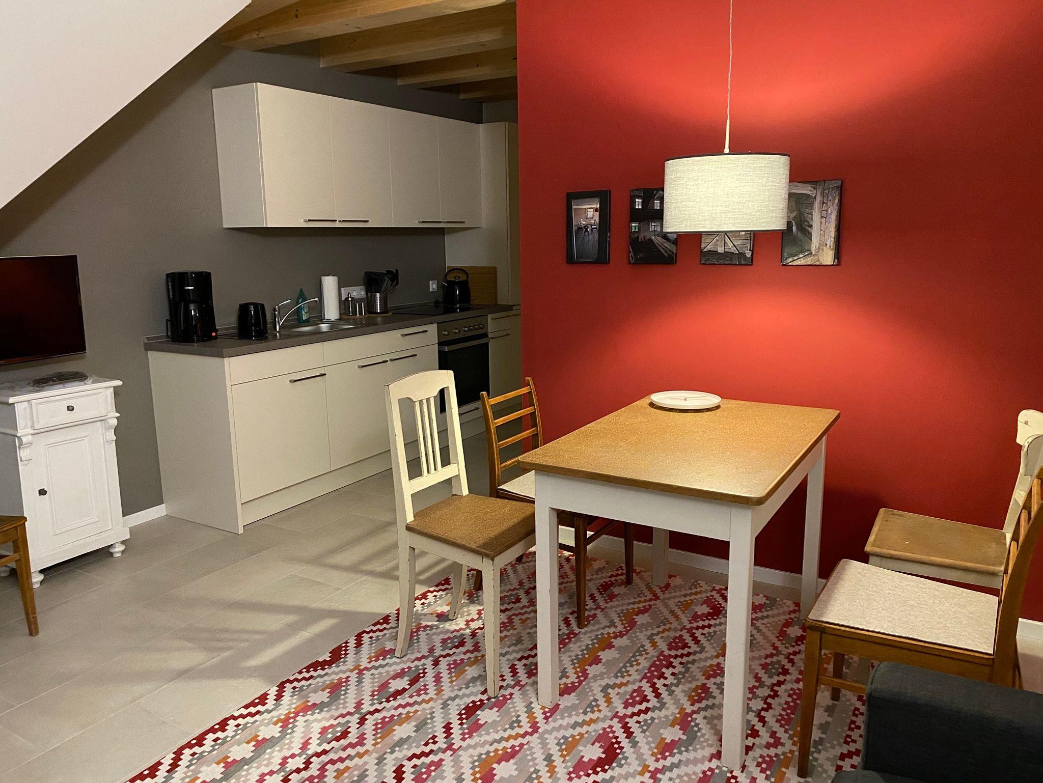 Die Ferienwohnung befindet sich in einem Holzneubau. Im Erdgeschoss befinden sich eine offene Küche, ein Esstisch mit 4 Stühlen, Sofa mit Schlaffunktion, Smart-TV und das Badezimmer mit WC und ebenerdiger Dusche.