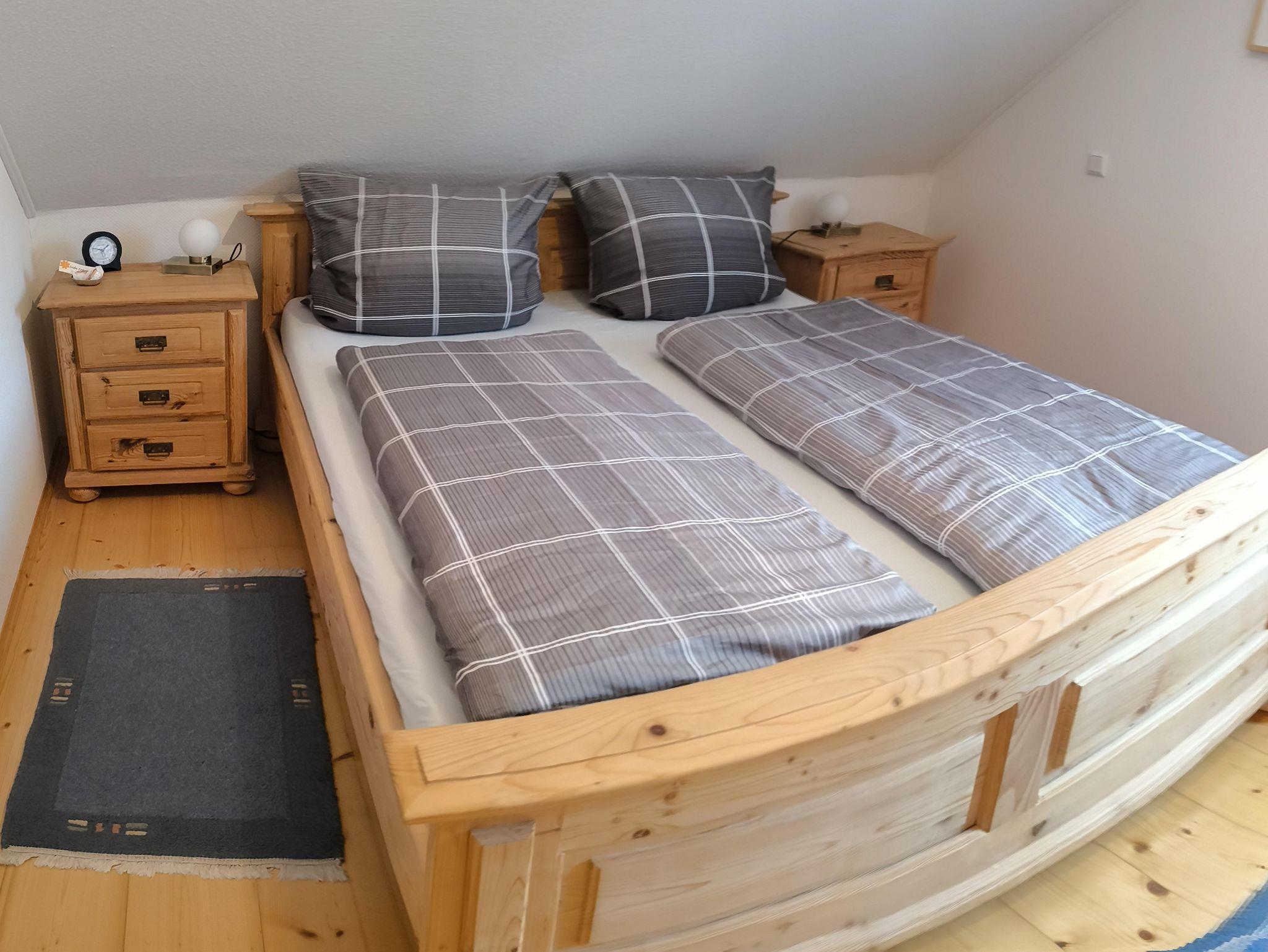 - 2 Schlafzimmer mit Doppelbett, allergiefreien Matratzen, Nachtkommoden und einem 5-türigen Kleiderschrank und Möbeltresor im Schrank.