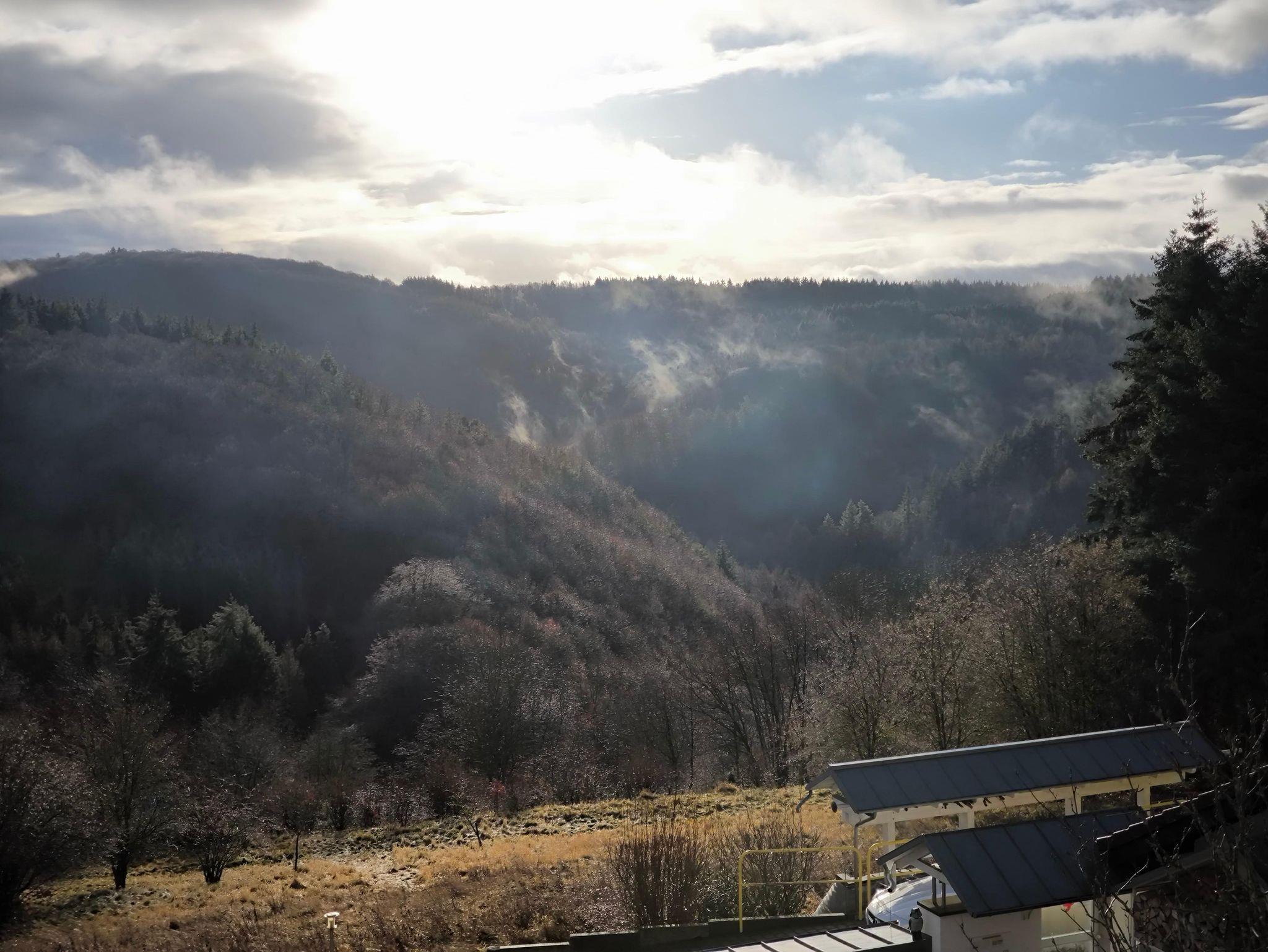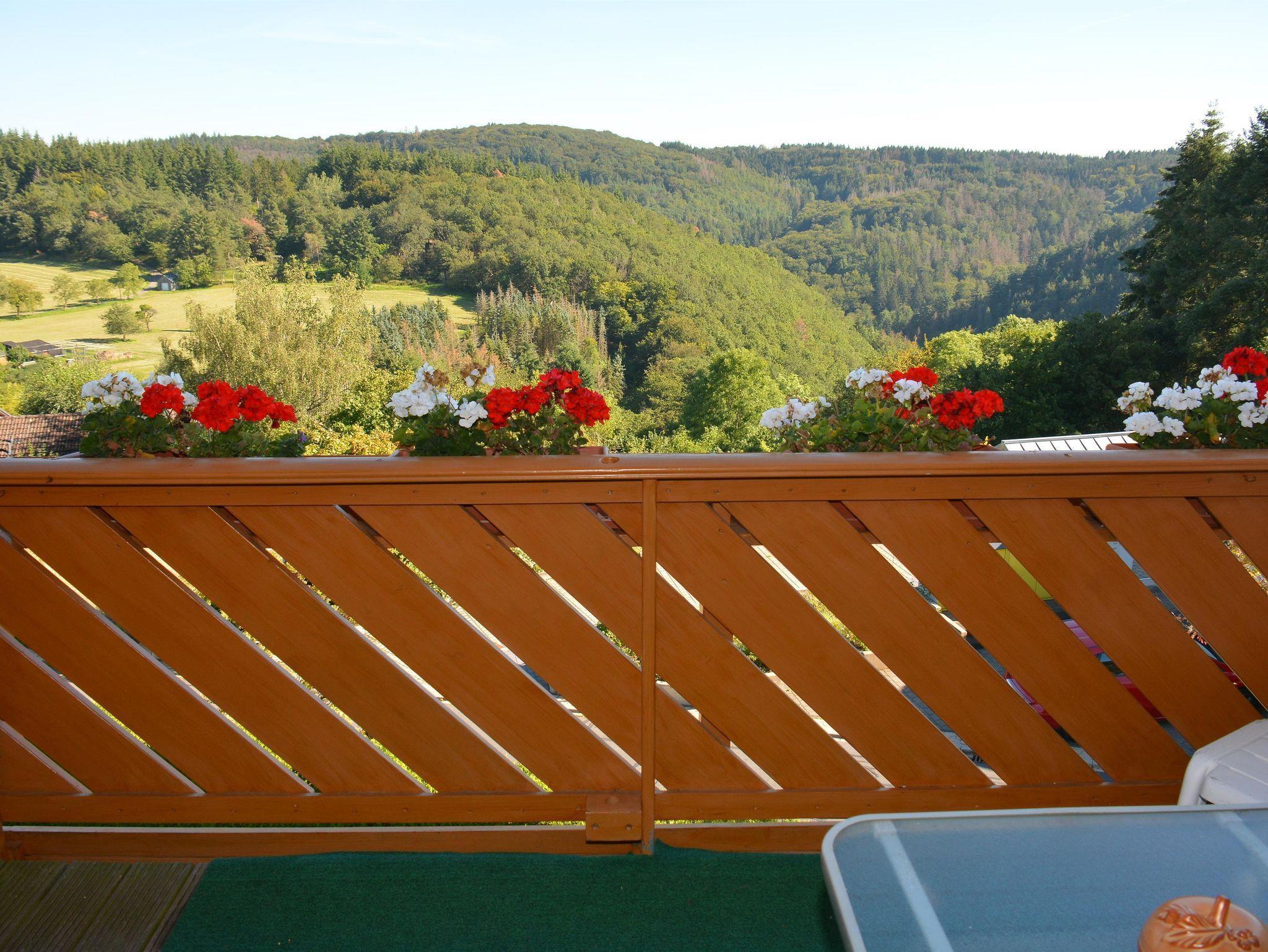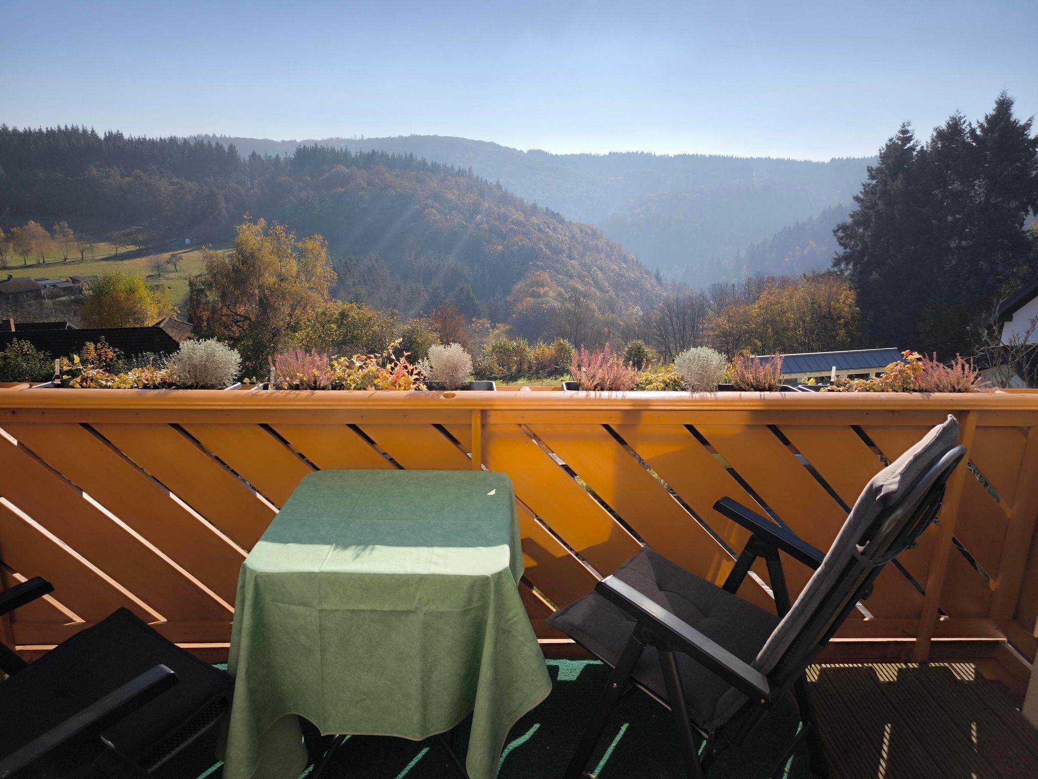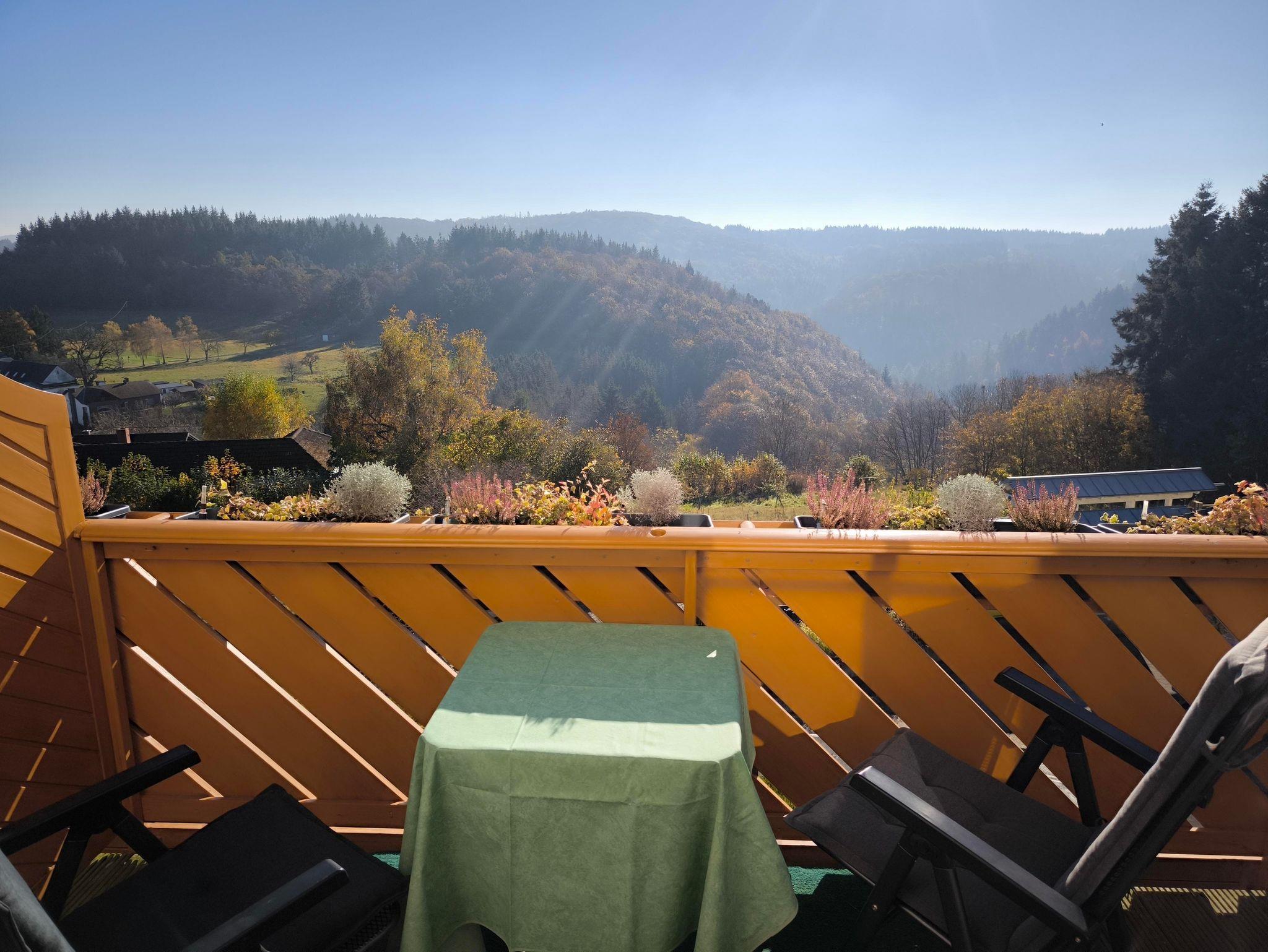 - Balkon mit Süd-Ost Ausrichtung und ungehindertem, weitschweifendem Blick über die wunderbare Eifellandschaft. Gartenstühle mit Auflagen, Tisch und einem Sonnenschirm.