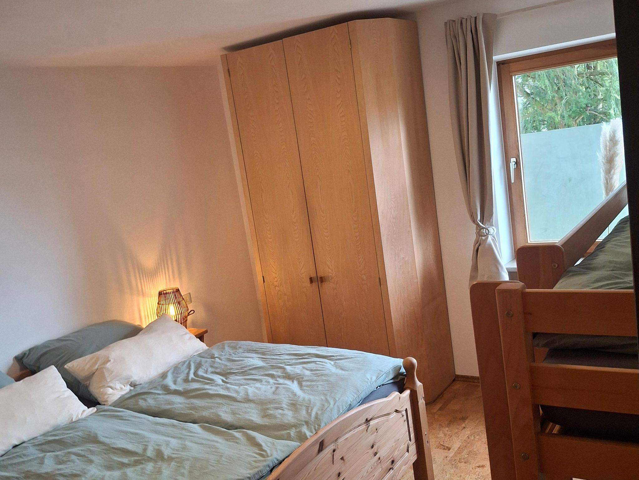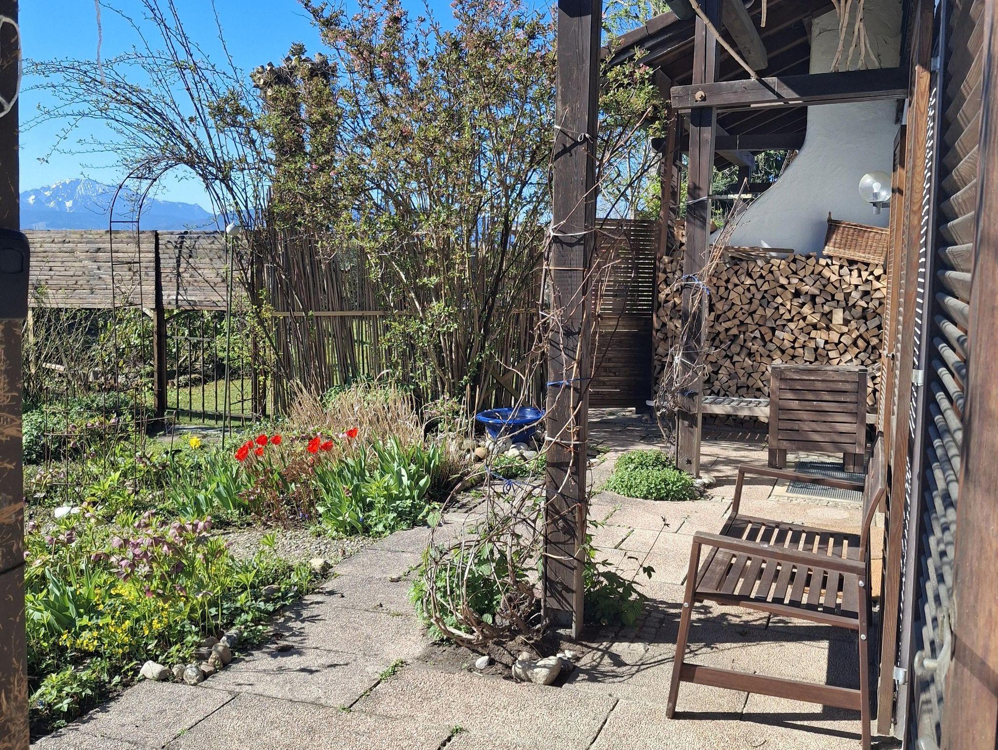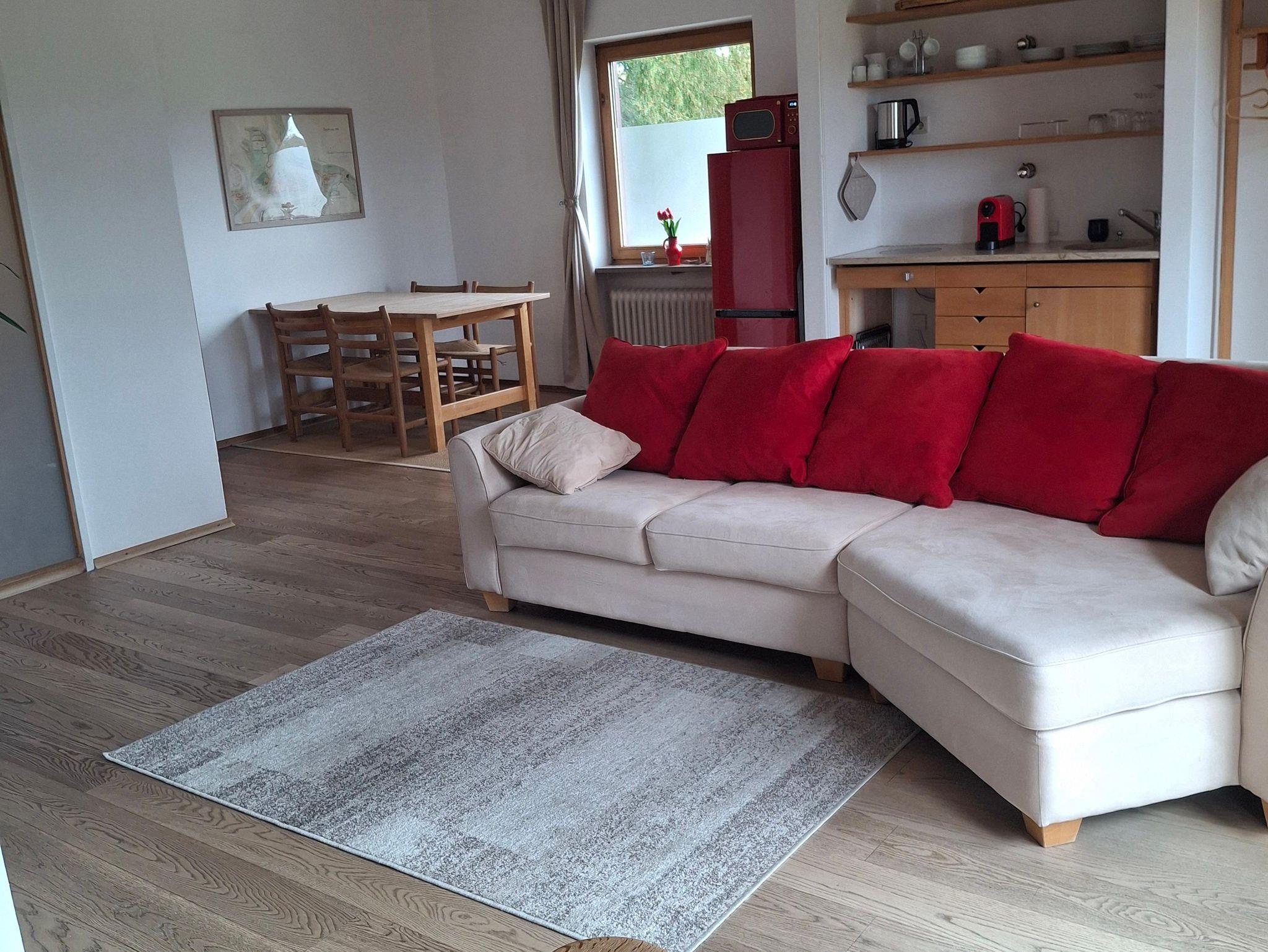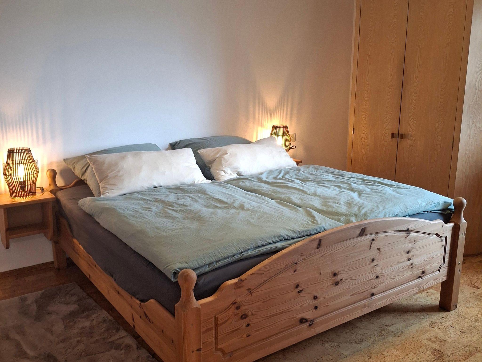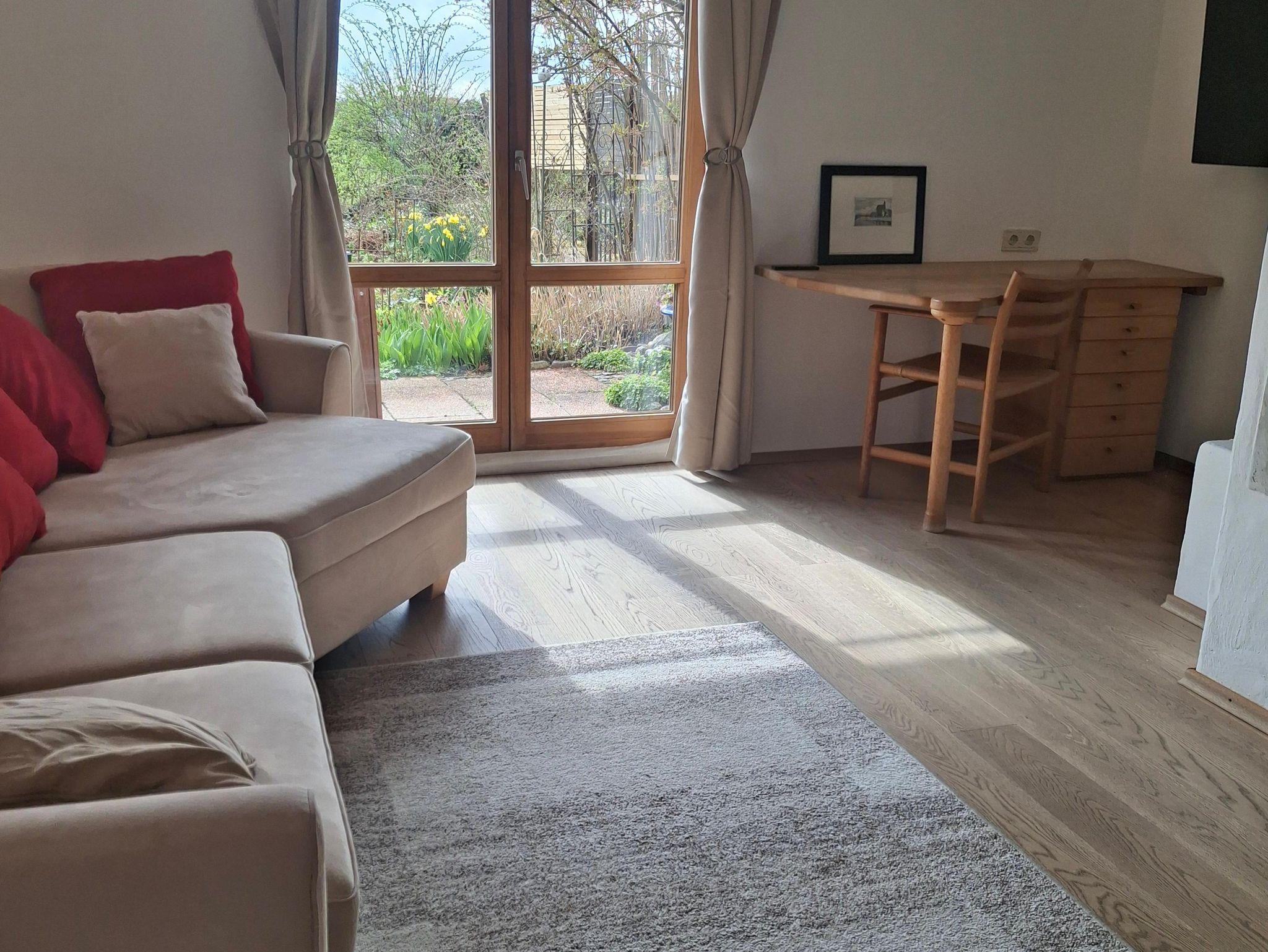 Ausgestattet mit Naturholzmöbeln strahlt die Wohnung eine warme und einladende Atmosphäre aus. Der eigene Garten lädt zum Verweilen ein – perfekt für sonnige Frühstücke oder laue Sommerabende mit Blick auf die Berge.