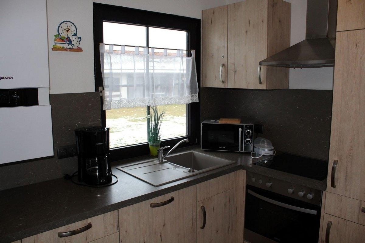 Es gibt eine komplett neue Küche mit allem Komfort, wie Spülmaschine, E-Herd mit Backofen, Kühlschrank mit Gefrierfach sowie eine Mikrowelle, Toaster, Kaffemaschine, Wasserkocher und allem was man in einer Küche braucht.